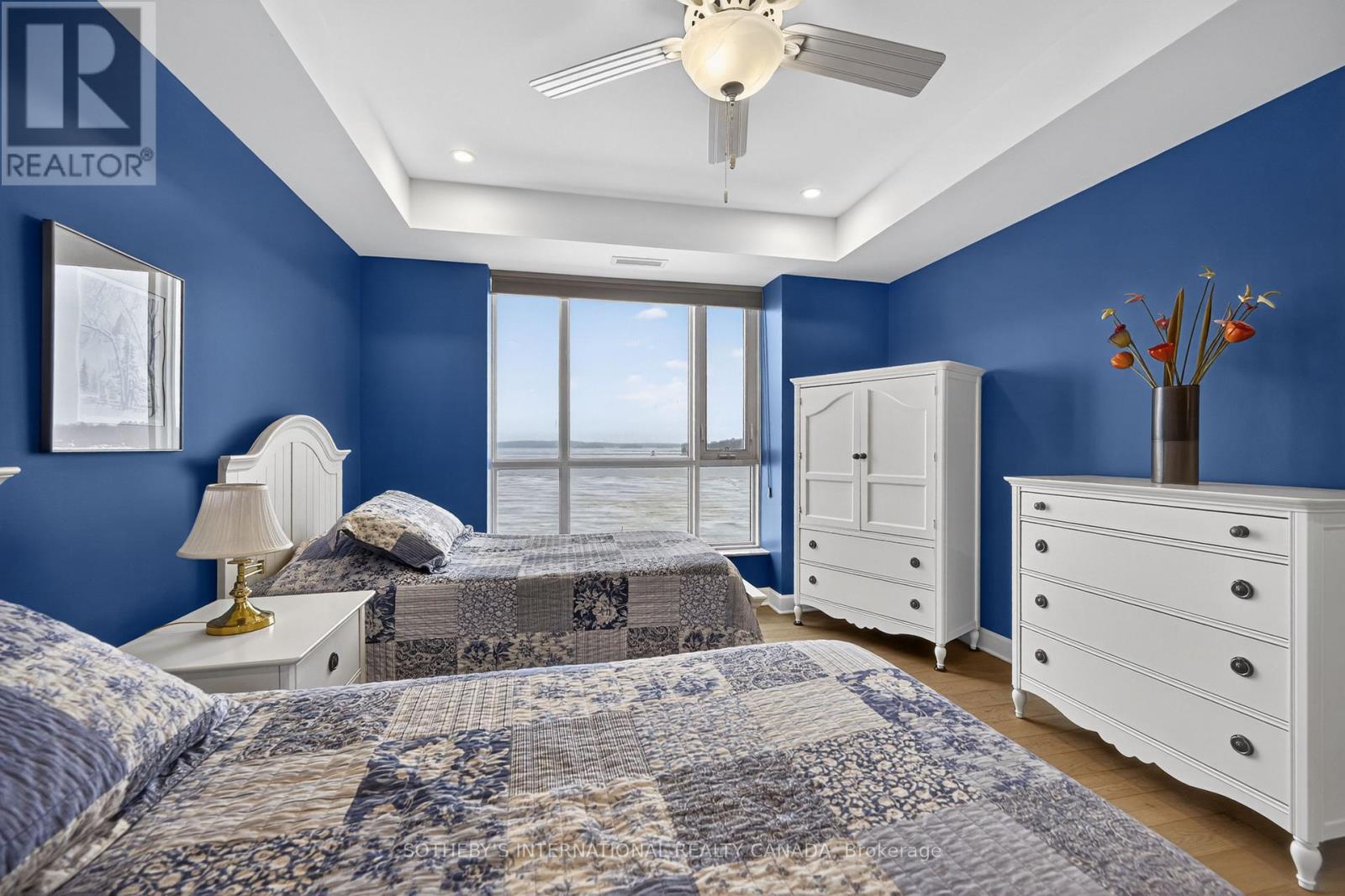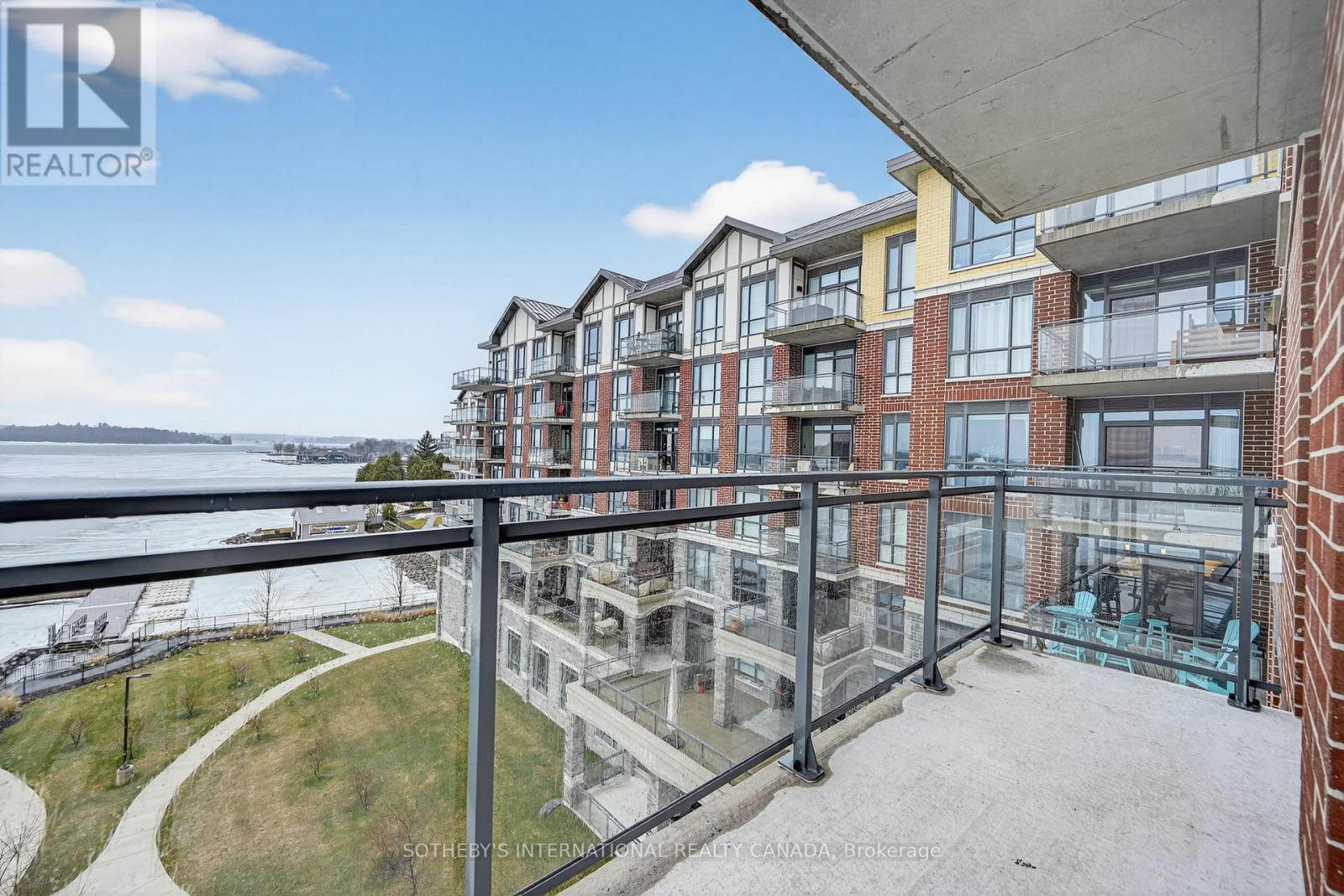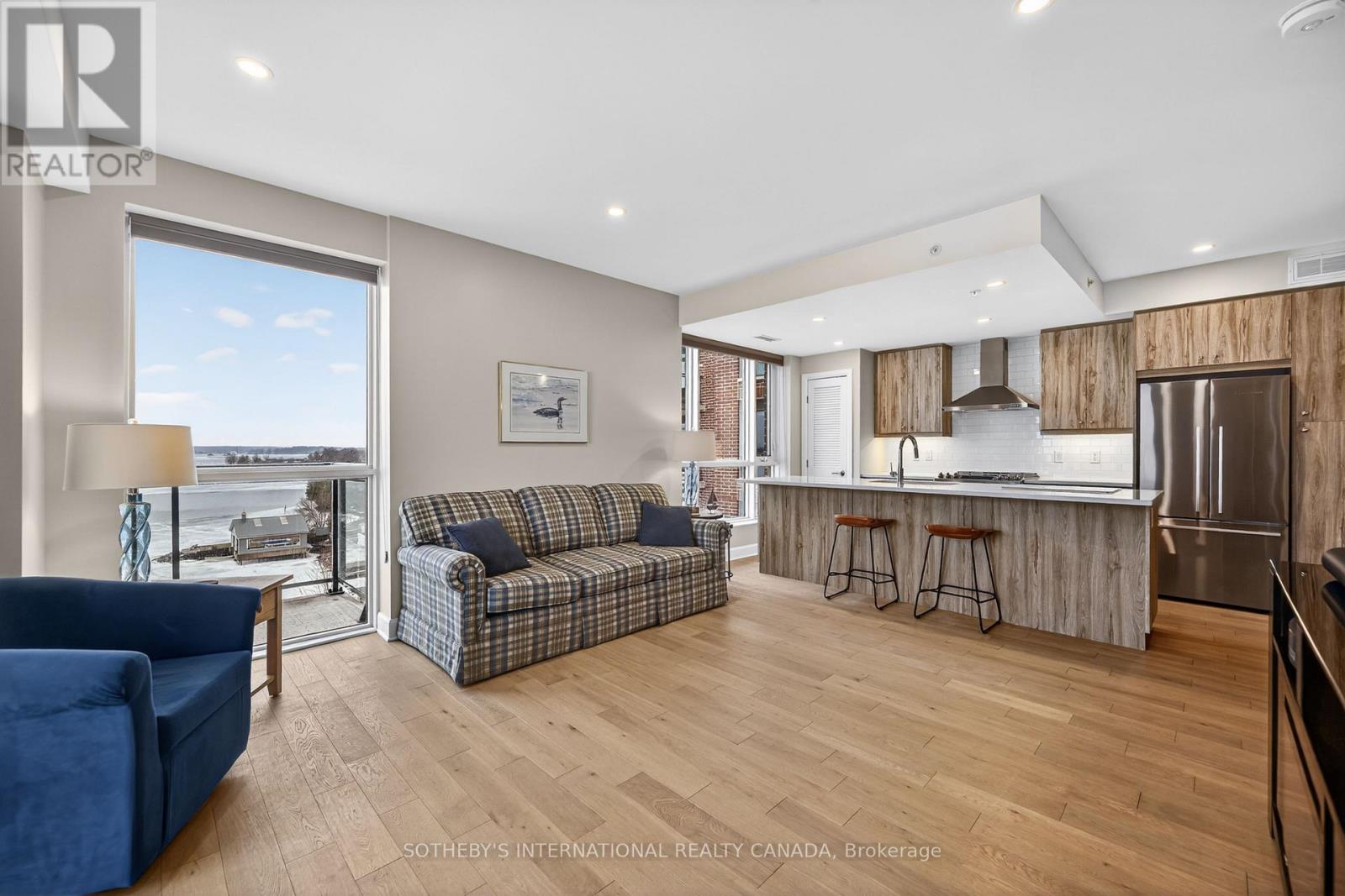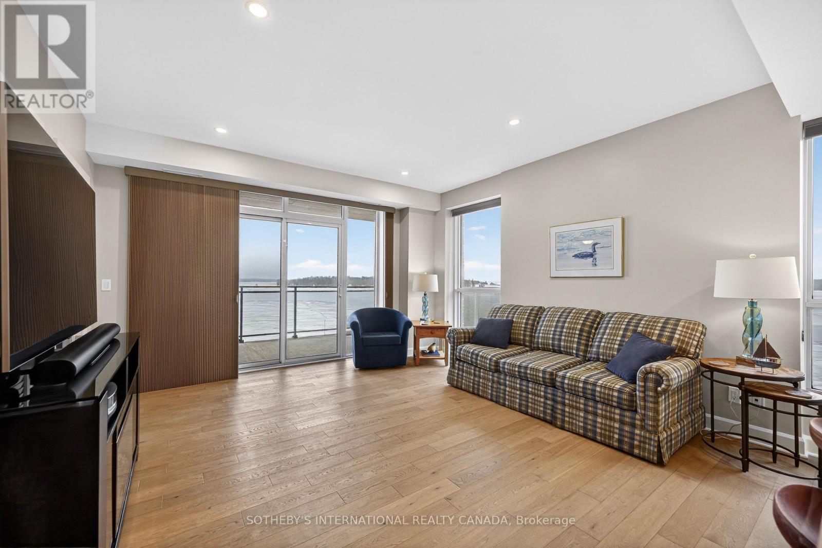 Take note of this luxury Thousand Islands Waterfront 2 bedroom 2 bathroom Condominium available with flexible possession. Imagine spending the summer by the river with marina access and within walking distance of everything you need to enjoy the beauty and charm of this unique area. Your condo features hardwood and ceramic floors, a chef's dream kitchen with an extended island and added cupboard space, in-suite laundry, an ensuite bathroom with heated floors and most importantly, a panoramic view of the St. Lawrence River with a wraparound balcony to fully enjoy it. Click through the photos or take the tour to see how the outdoors pours into all the bright, airy spaces. Temporary rain keeping you indoors? Slip downstairs to the common room for a game of pool or some social interaction, hit the high-end gym/workout space or simply watch the clouds roll by from your floor to ceiling windows. Walk to the Thousand Islands Playhouse, restaurants and all the cultural panache Gananoque has to offer. Your storage locker is just down the hall for easy access. The perfect setup for years of enjoyment is waiting for you. Book a showing today. (id:64974)