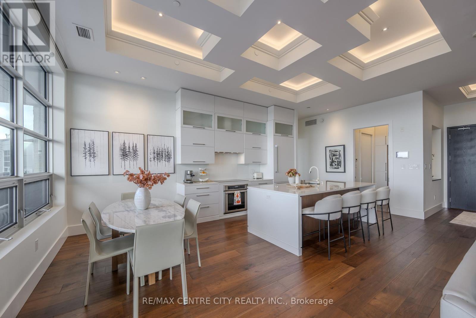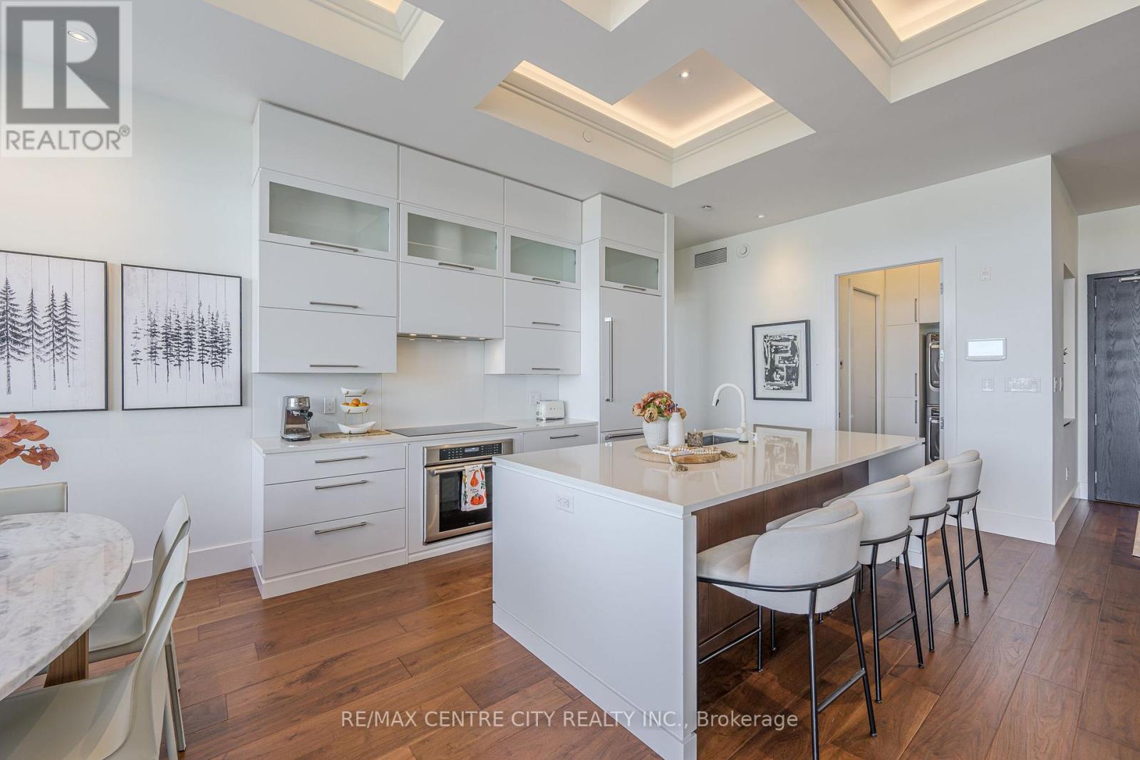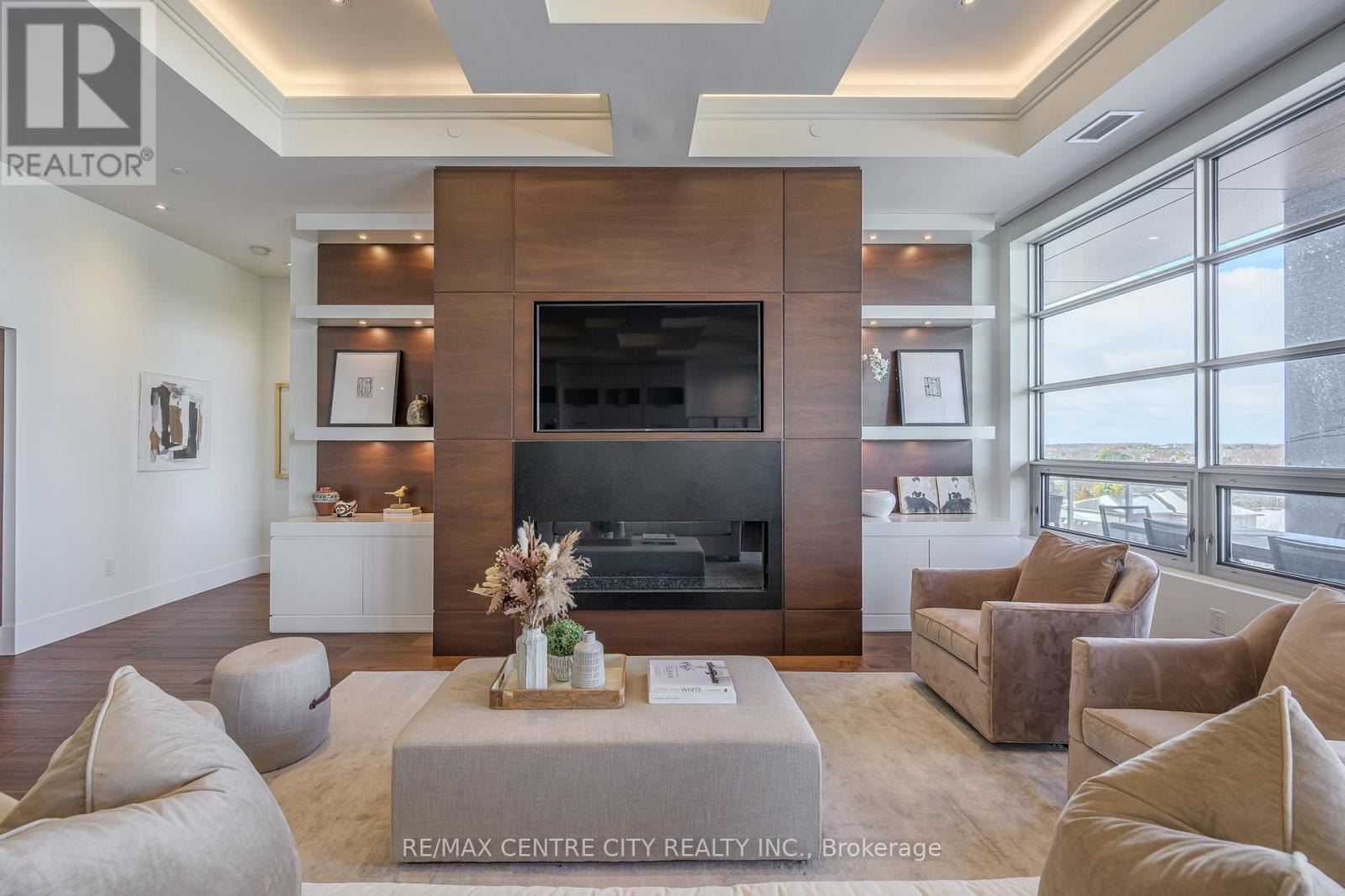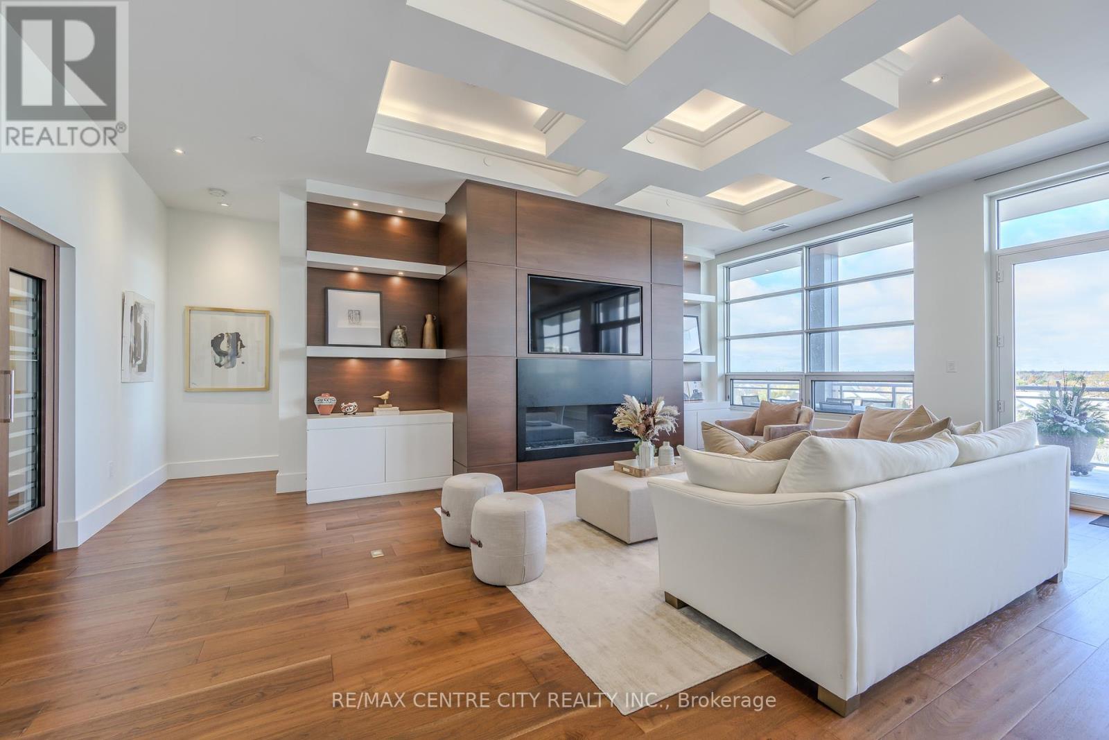 Welcome home to this decidedly upscale Premiere Penthouse condominium at NorthPoint, ideally located in northwest London and offering easy access to the world class shopping at CFMasonville Place, the institutions of Western University and University Hospital. You are going to LOVE the Million Dollar four season views from the covered balcony, the perfect outdoor oasis for entertaining or just enjoying a glass of wine at the end of the day and marveling at some of the prettiest sunsets in London. This unique penthouse offers an open concept Greatroom featuring a 12' high custom designed ceiling with built in lighting, a modern linear gas fireplace surrounded by custom built cabinetry along with a butlers pantry and wine bar, and floor to ceiling windows to admire the beautiful view. This terrific condominium features a Savant Smart Home System that controls the lighting, blinds and built in speaker system. The Chef in your family is going to be impressed by the oversized kitchen island, along with high end Thermador appliances, custom cabinetry and quartz countertops. The primary bedroom is the perfect place to end a long day and has a spa inspired ensuite bathroom with heated flooring, a glass shower enclosure and a designer walk in closet. The guest suite is equally impressive and also features a full ensuite bathroom and dedicated walk in closet. There is also an in-suite laundry room along with convenient storage. New LifeBreath HEPA filtration system in stalled in2023. There are two dedicated exclusive underground parking spots included along with two exclusive storage units. Don't delay, you are going to LOVE living here! (id:64974)