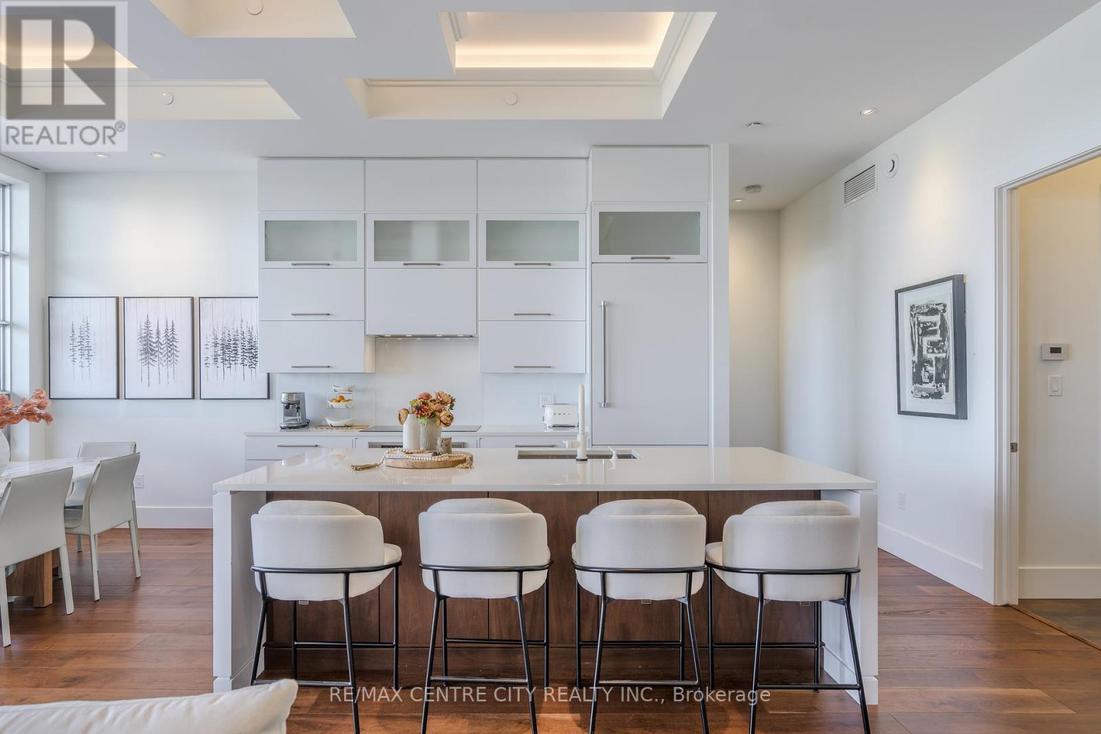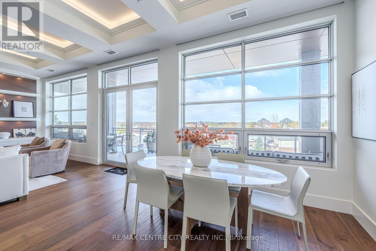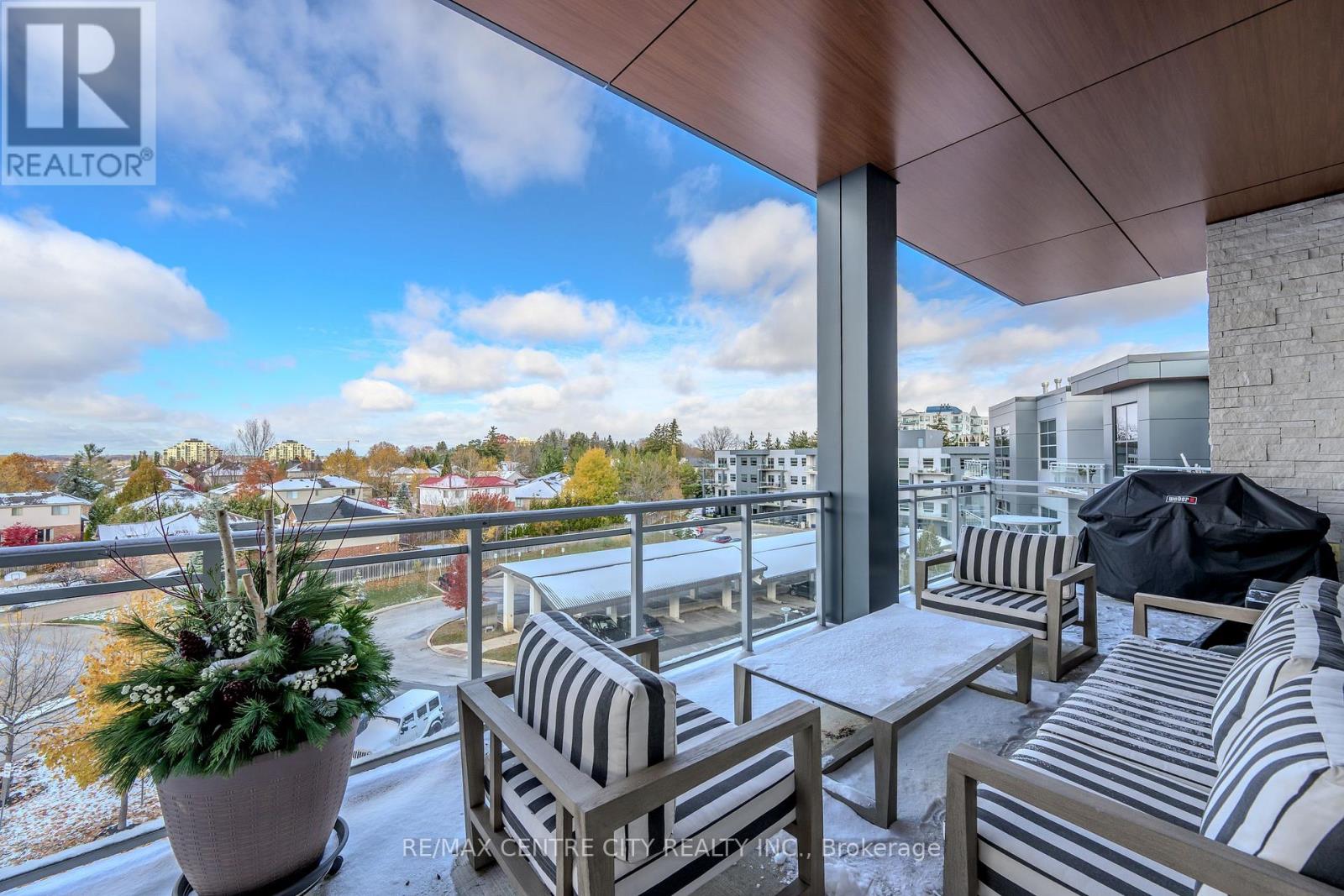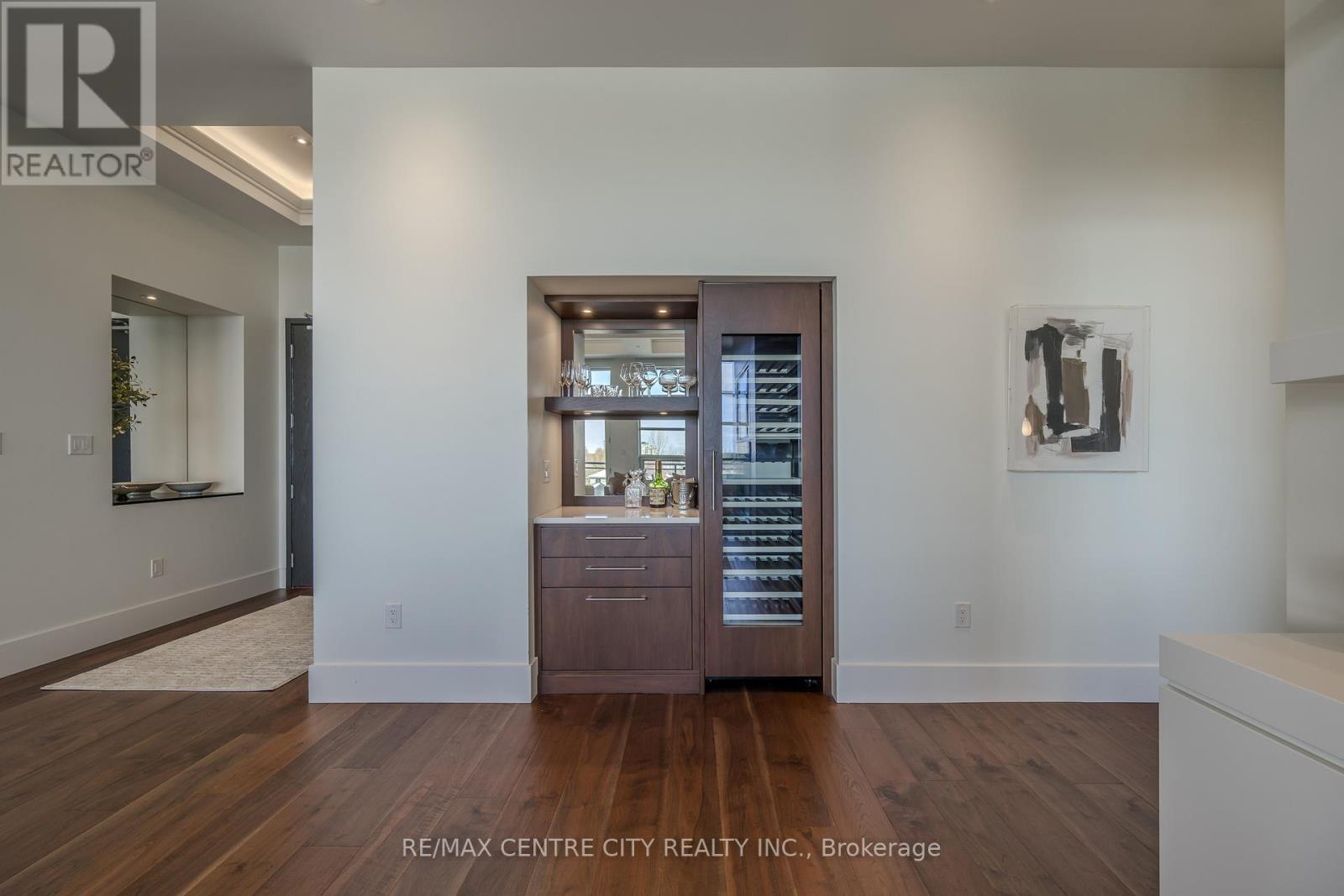 Welcome home to this decidedly upscale Premiere Penthouse condominium at NorthPoint, ideally located in northwest London and offering easy access to the world class shopping at CFMasonville Place, the institutions of Western University and University Hospital. You are going to LOVE the Million Dollar four season views from the covered balcony, the perfect outdoor oasis for entertaining or just enjoying a glass of wine at the end of the day and marveling at some of the prettiest sunsets in London. This unique penthouse offers an open concept Greatroom featuring a 12' high custom designed ceiling with built in lighting, a modern linear gas fireplace surrounded by custom built cabinetry along with a butlers pantry and wine bar, and floor to ceiling windows to admire the beautiful view. This terrific condominium features a Savant Smart Home System that controls the lighting, blinds and built in speaker system. The Chef in your family is going to be impressed by the oversized kitchen island, along with high end Thermador appliances, custom cabinetry and quartz countertops. The primary bedroom is the perfect place to end a long day and has a spa inspired ensuite bathroom with heated flooring, a glass shower enclosure and a designer walk in closet. The guest suite is equally impressive and also features a full ensuite bathroom and dedicated walk in closet. There is also an in-suite laundry room along with convenient storage. New LifeBreath HEPA filtration system in stalled in2023. There are two dedicated exclusive underground parking spots included along with two exclusive storage units. Don't delay, you are going to LOVE living here! (id:64974)