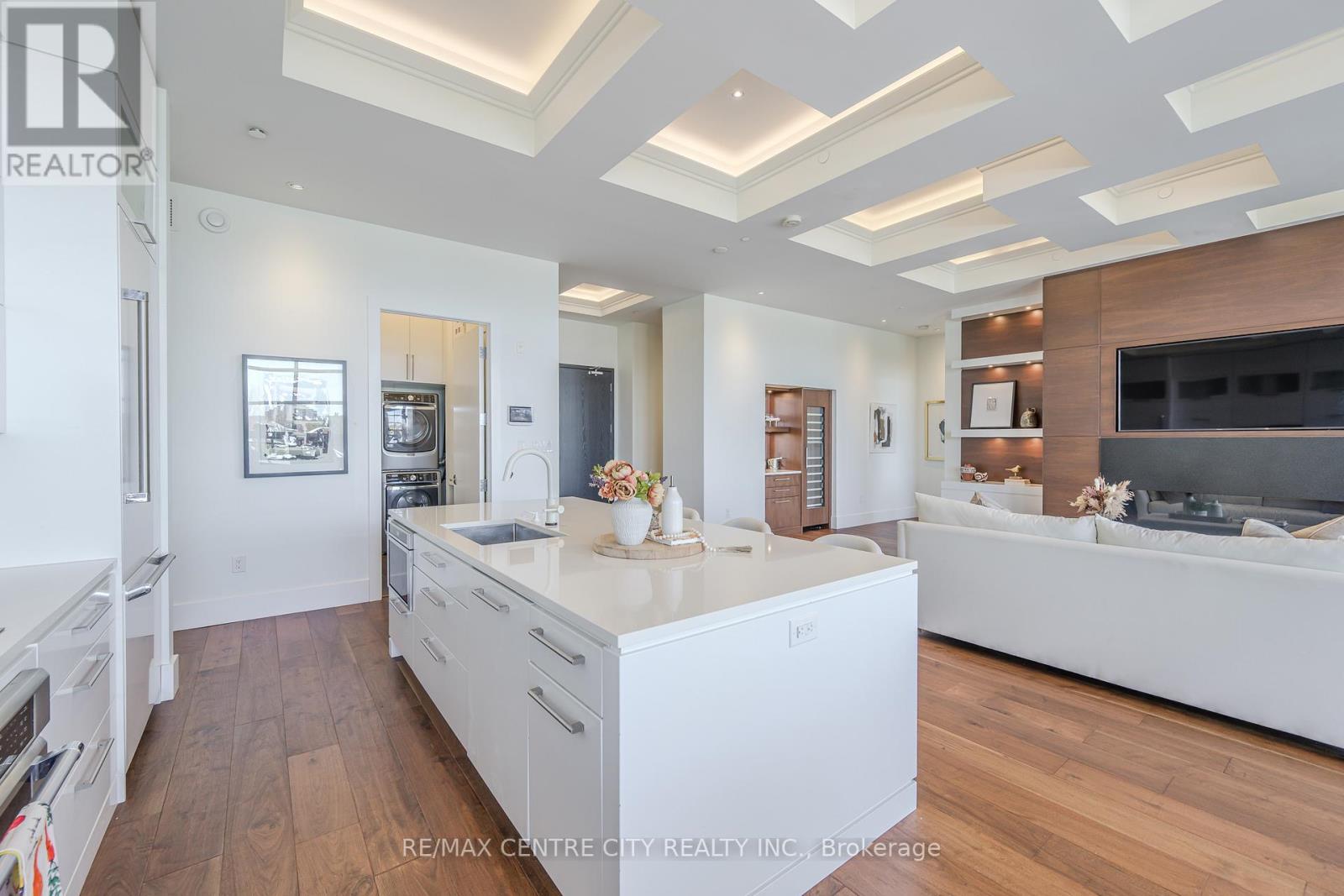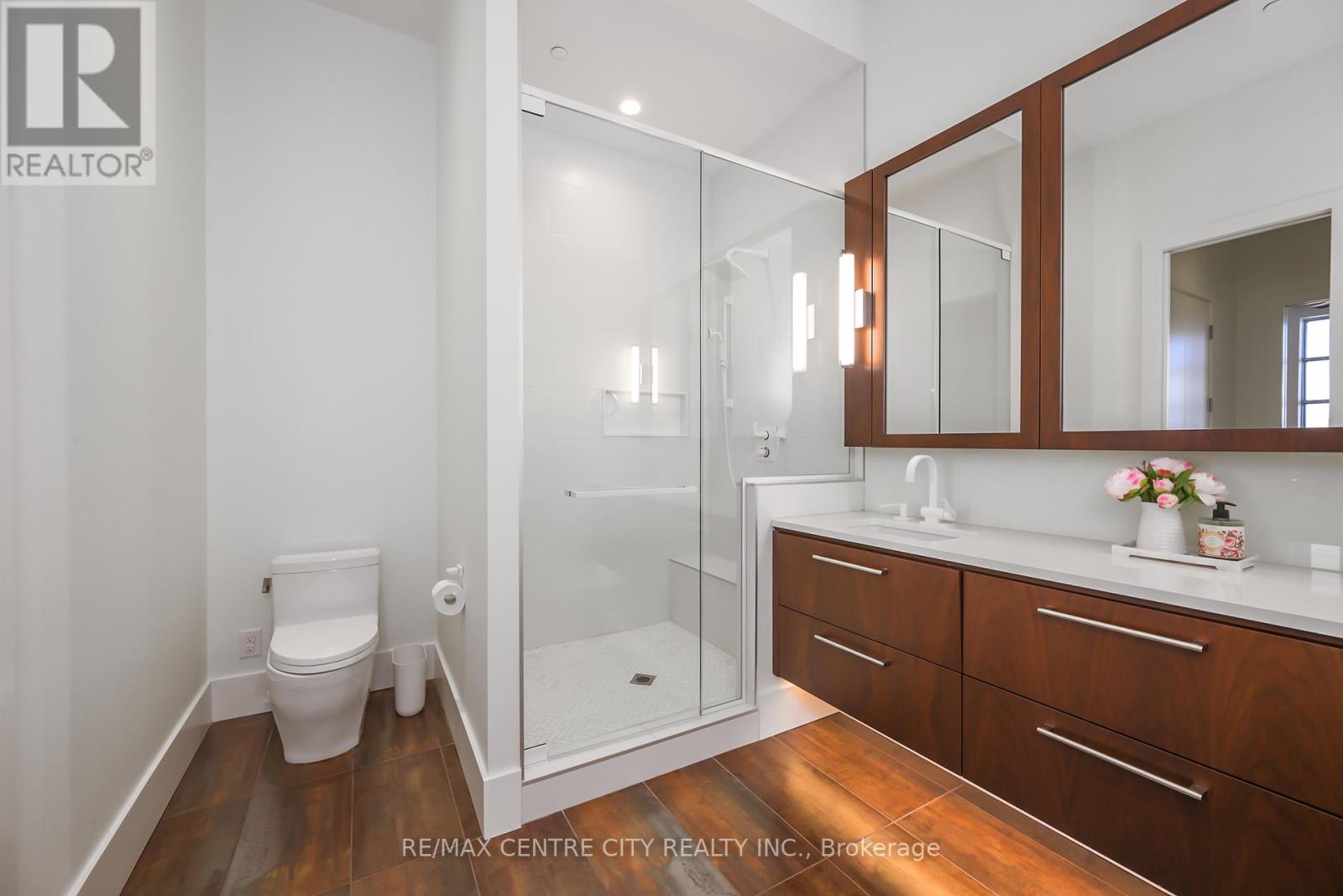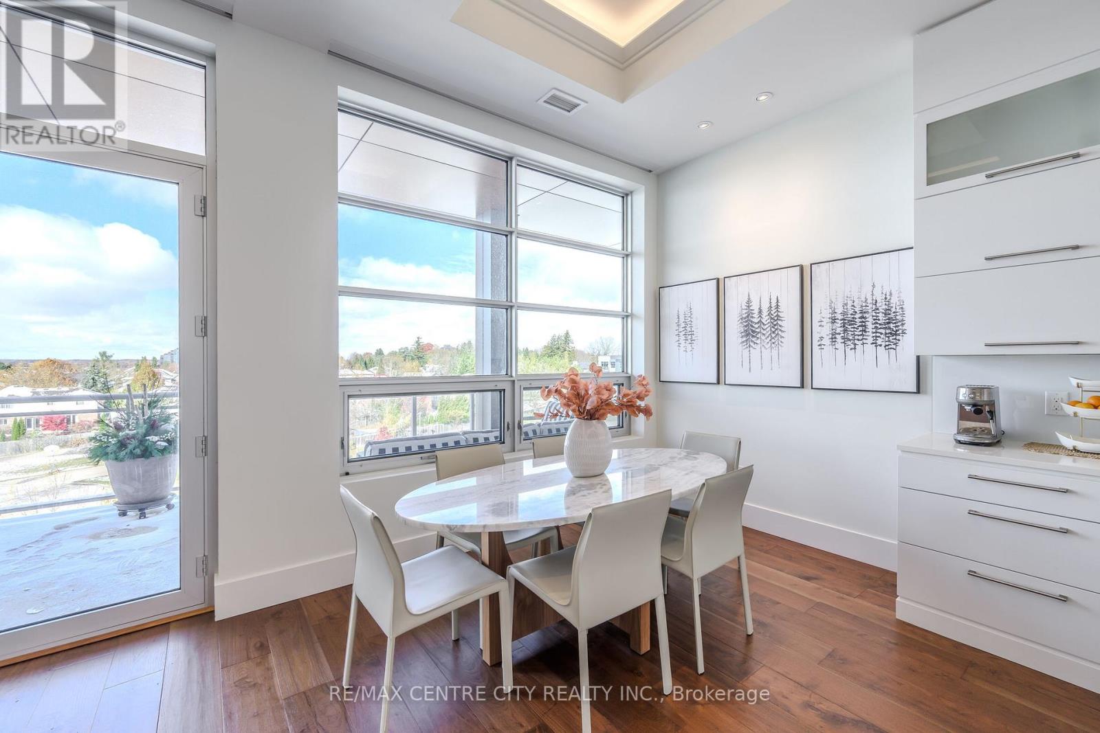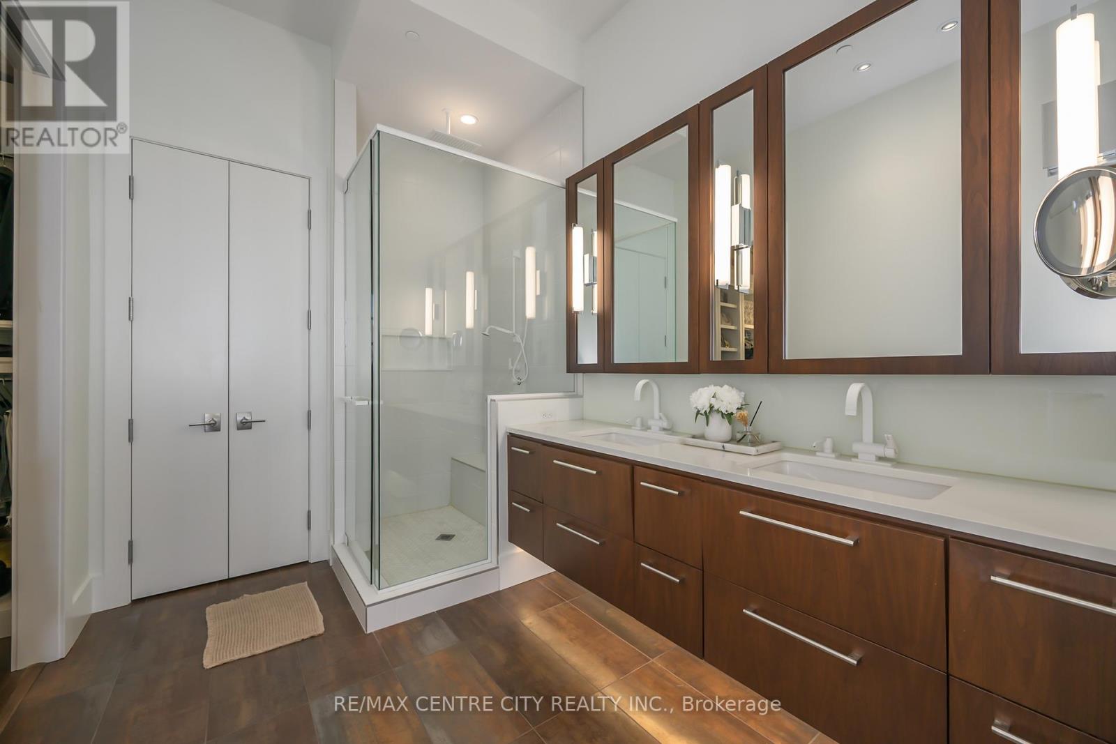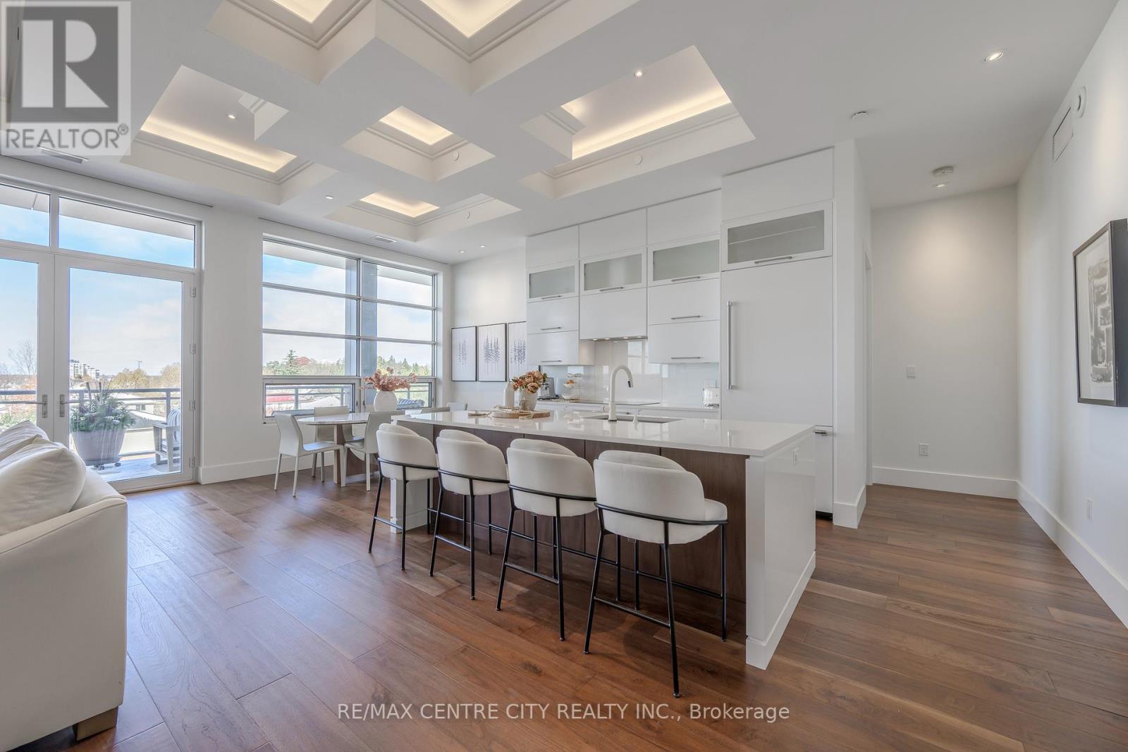 Welcome home to this decidedly upscale Premiere Penthouse condominium at NorthPoint, ideally located in northwest London and offering easy access to the world class shopping at CFMasonville Place, the institutions of Western University and University Hospital. You are going to LOVE the Million Dollar four season views from the covered balcony, the perfect outdoor oasis for entertaining or just enjoying a glass of wine at the end of the day and marveling at some of the prettiest sunsets in London. This unique penthouse offers an open concept Greatroom featuring a 12' high custom designed ceiling with built in lighting, a modern linear gas fireplace surrounded by custom built cabinetry along with a butlers pantry and wine bar, and floor to ceiling windows to admire the beautiful view. This terrific condominium features a Savant Smart Home System that controls the lighting, blinds and built in speaker system. The Chef in your family is going to be impressed by the oversized kitchen island, along with high end Thermador appliances, custom cabinetry and quartz countertops. The primary bedroom is the perfect place to end a long day and has a spa inspired ensuite bathroom with heated flooring, a glass shower enclosure and a designer walk in closet. The guest suite is equally impressive and also features a full ensuite bathroom and dedicated walk in closet. There is also an in-suite laundry room along with convenient storage. New LifeBreath HEPA filtration system in stalled in2023. There are two dedicated exclusive underground parking spots included along with two exclusive storage units. Don't delay, you are going to LOVE living here! (id:64974)