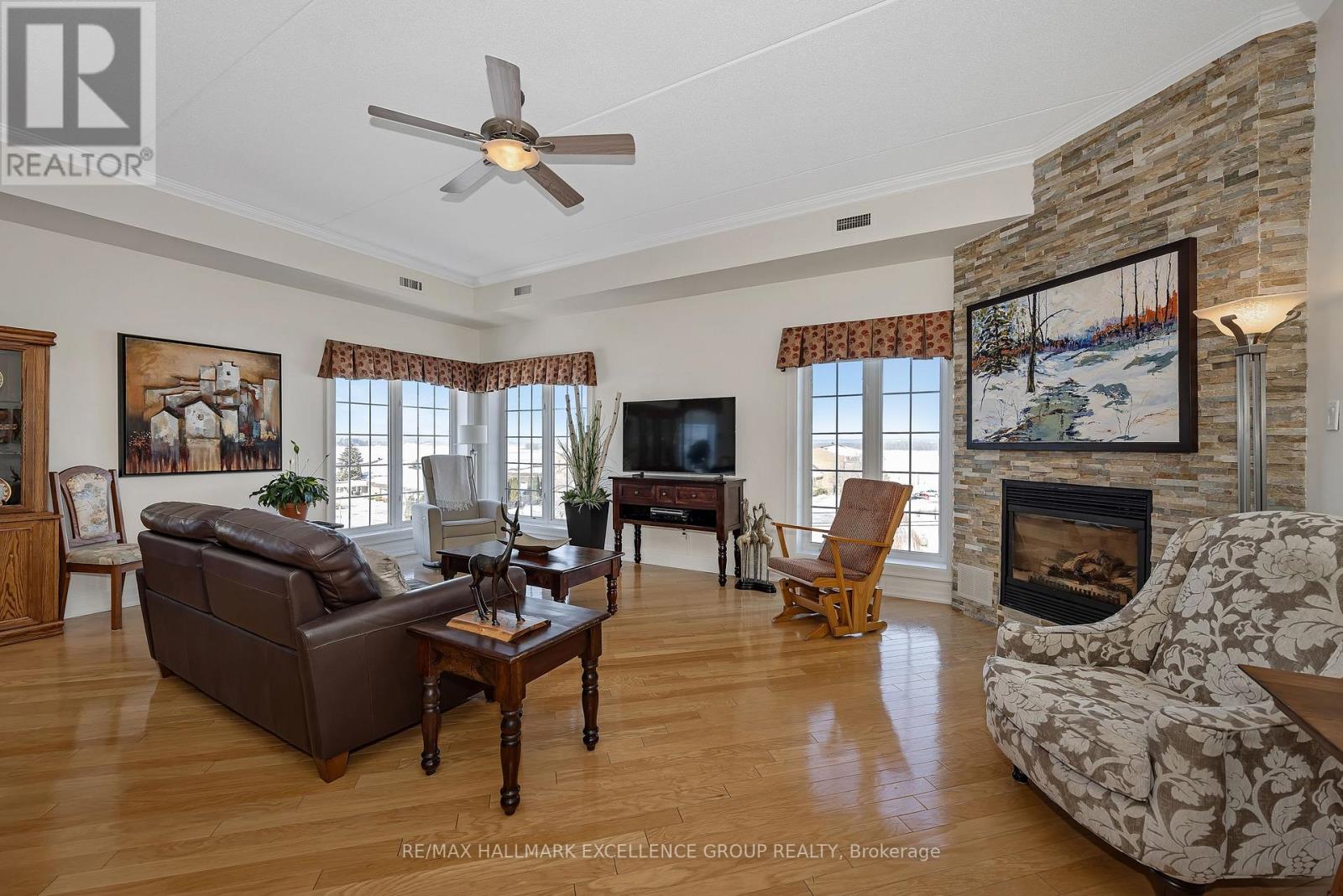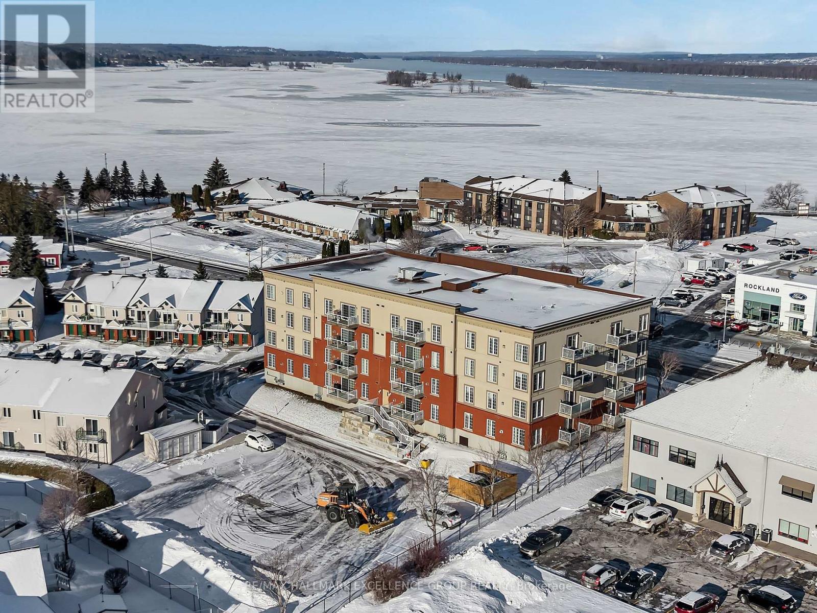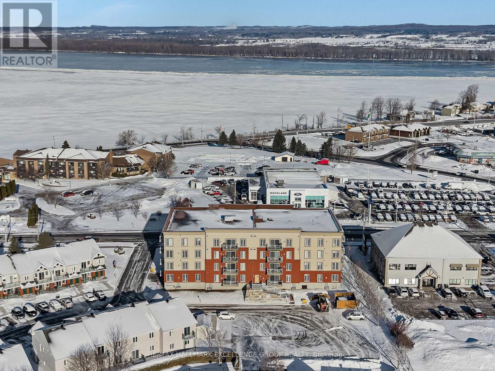 Welcome to penthouse living in the heart of Rockland. Perched on the top floor, on a corner this beautiful condo offers breathtaking views of the Ottawa River and unforgettable sunsets that will quickly become your favourite part of the day. From the moment you step inside, you're welcomed by a spacious and elongated foyer that creates a warm and elegant first impression. This 2-bedroom condo offers open-concept living with impressive 9- and 10-foot ceilings, along with hardwood and ceramic flooring throughout. The spacious living room, dining area, and kitchen are perfectly designed for both everyday living and entertaining, with room for a long dining table and a movable kitchen island for added versatility. The primary bedroom is generously sized and features a walk-in closet, while the second bedroom is also a great size for guests, family, or a home office. The main bathroom has been beautifully updated with a luxurious glass and tiled walk-in shower, a relaxing soaker tub, and new ceramic flooring, creating a true spa-like retreat. A convenient 2-piece bathroom, in-unit laundry room, and separate in-unit storage room add to the functionality of this exceptional unit. This unit also includes 1 indoor parking space and 1 outdoor parking space, along with access to the building's party room. Ideally located within walking distance to Rockland's amenities, including banks, clinics, stores, and restaurants, this condo offers both comfort and convenience in a sought-after location. 24 Hours Irrevocable on all offers. (id:64974)