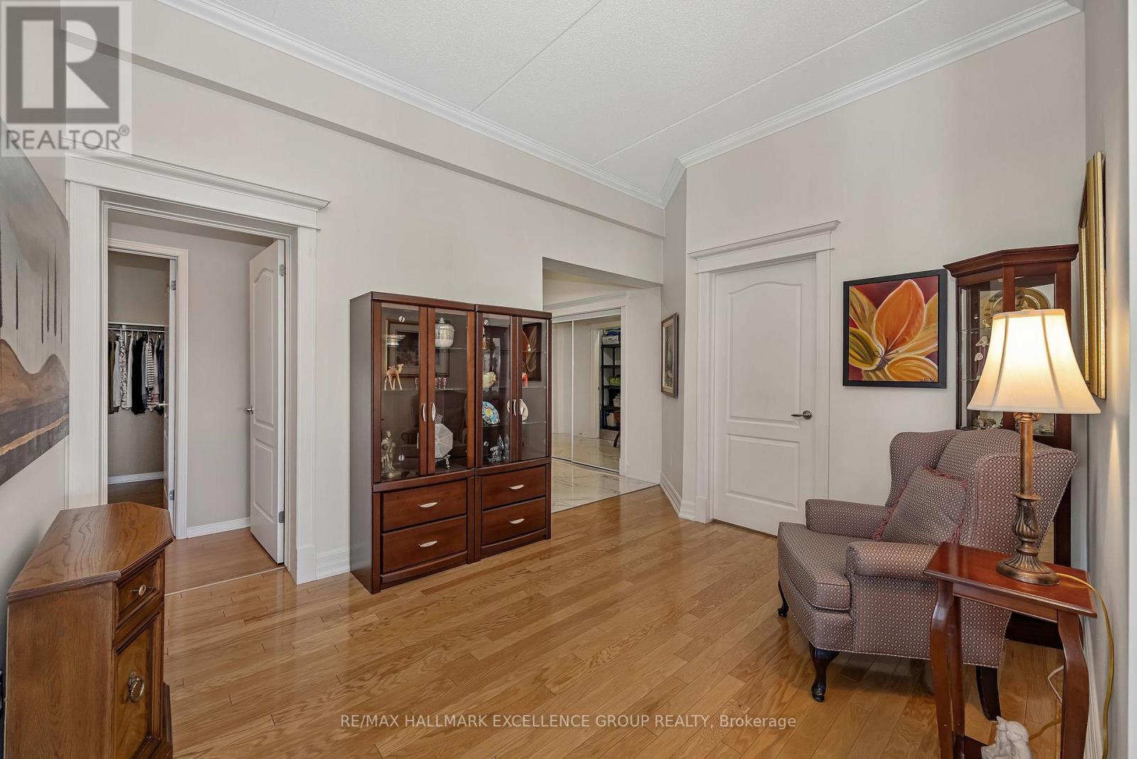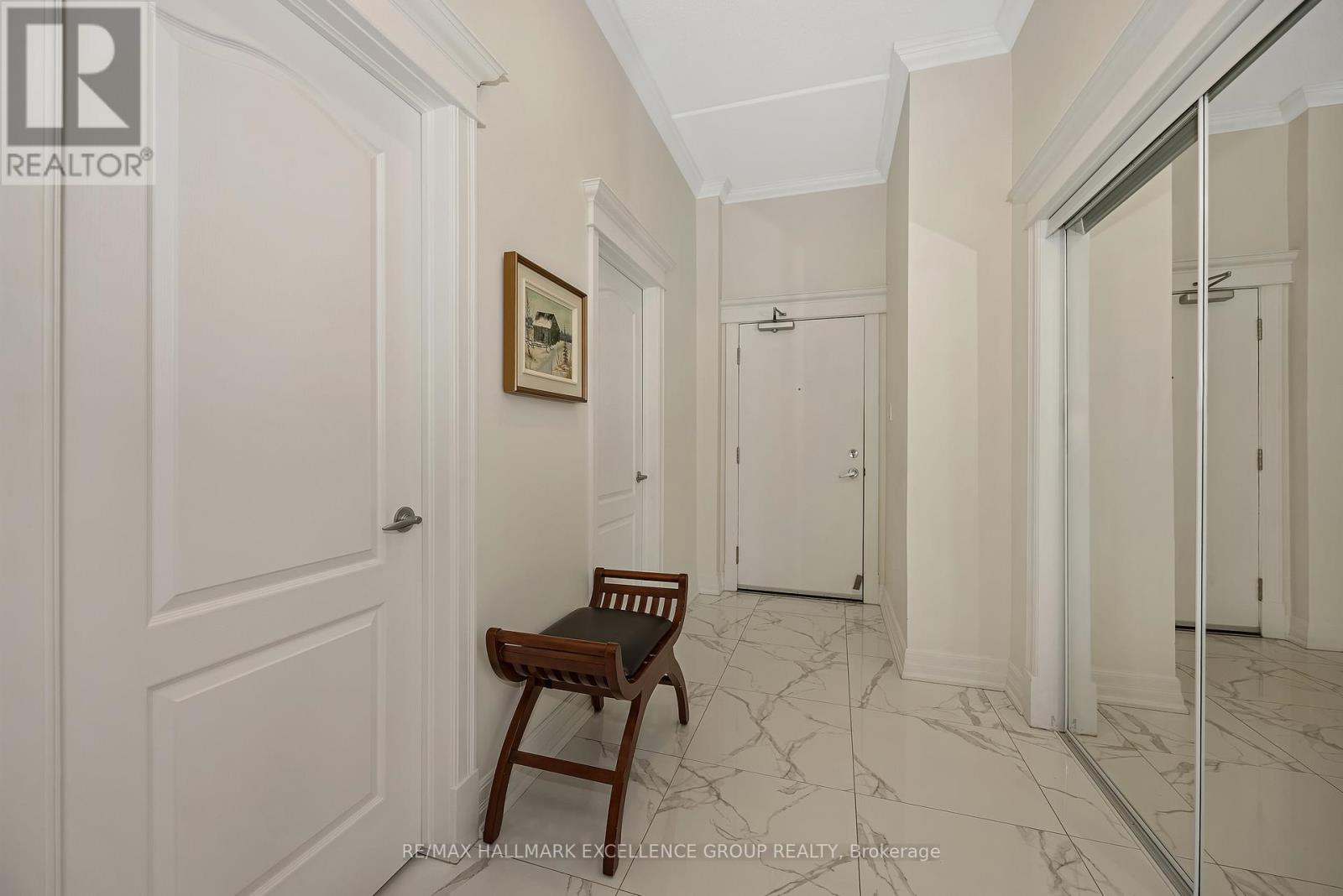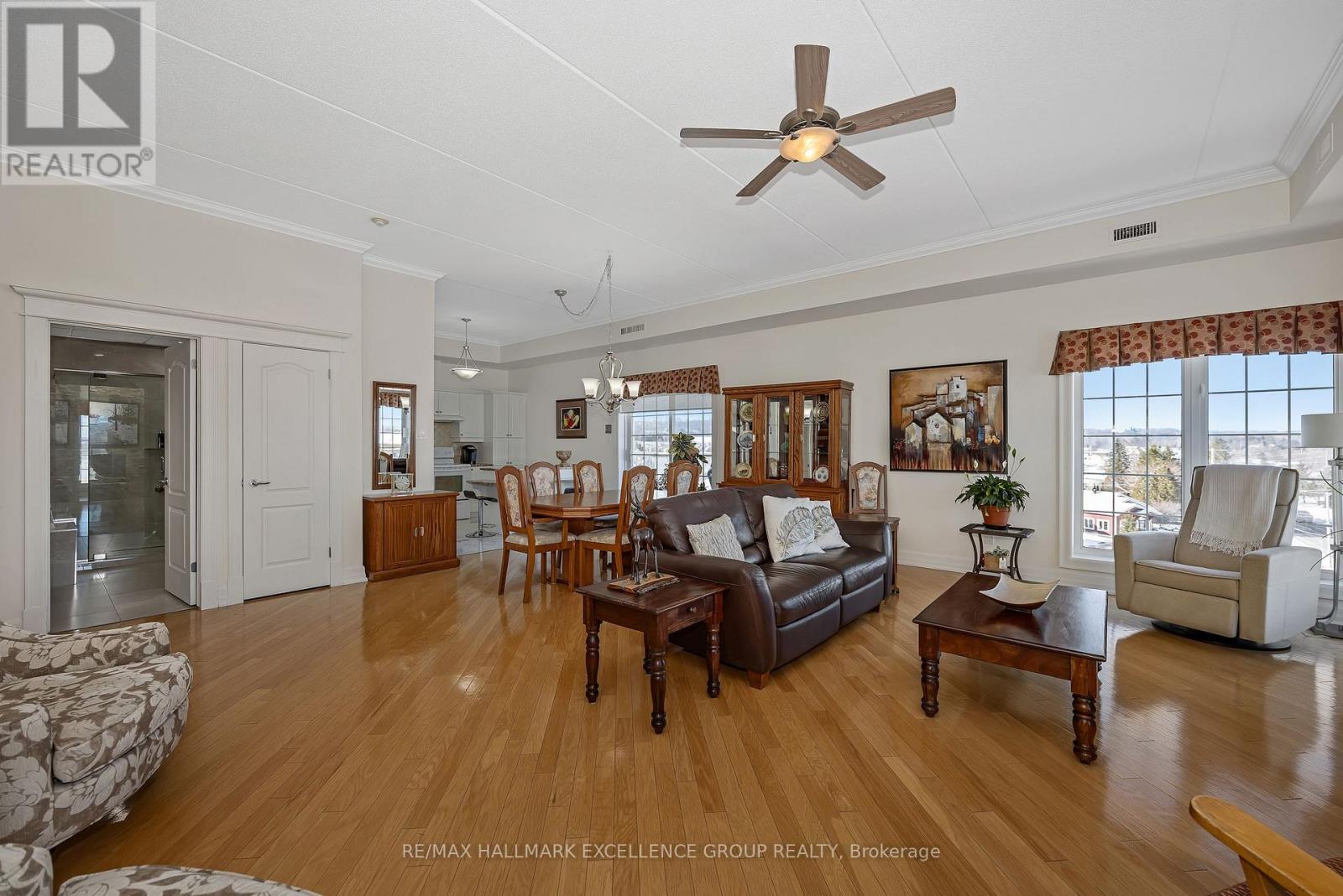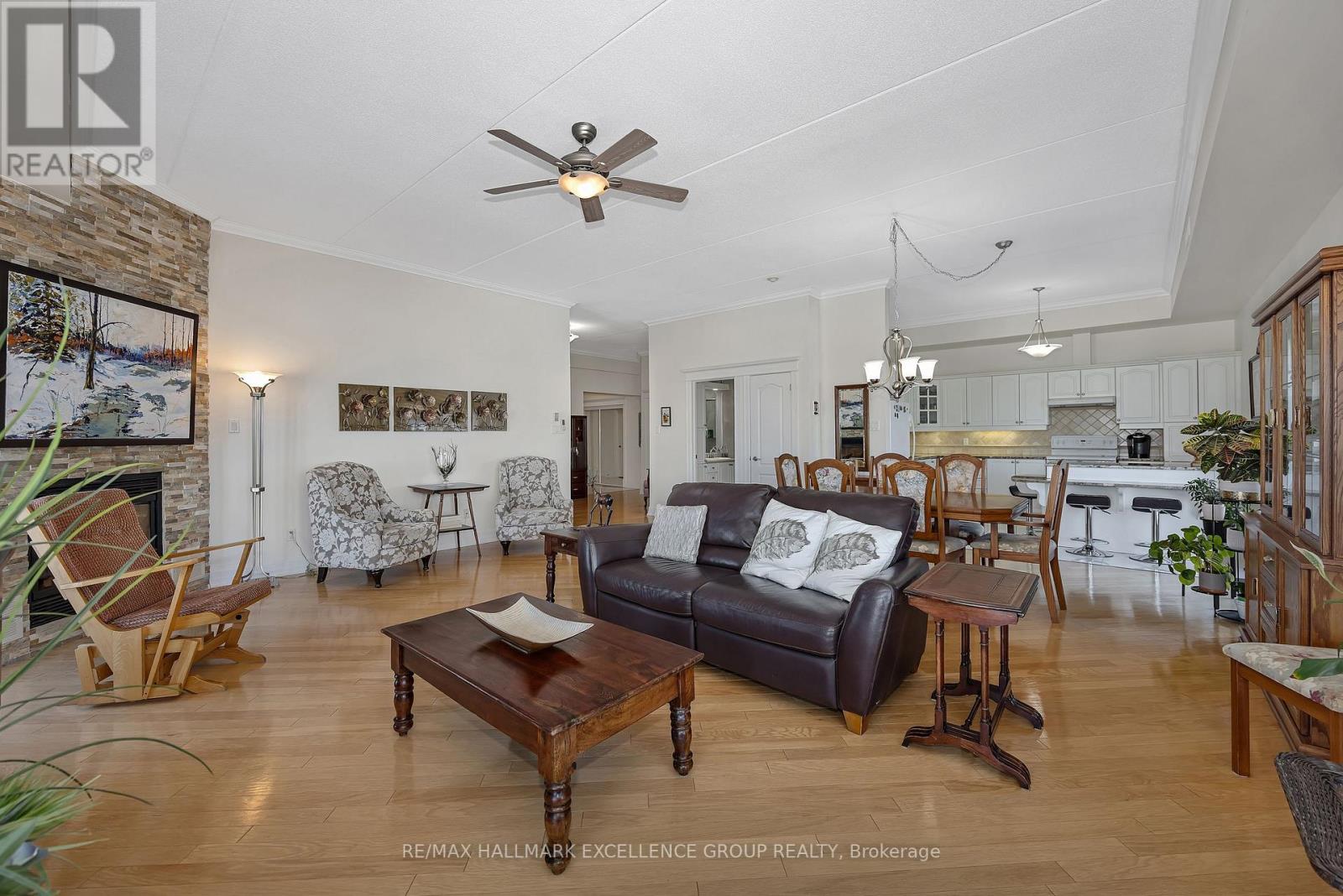 Welcome to penthouse living in the heart of Rockland. Perched on the top floor, on a corner this beautiful condo offers breathtaking views of the Ottawa River and unforgettable sunsets that will quickly become your favourite part of the day. From the moment you step inside, you're welcomed by a spacious and elongated foyer that creates a warm and elegant first impression. This 2-bedroom condo offers open-concept living with impressive 9- and 10-foot ceilings, along with hardwood and ceramic flooring throughout. The spacious living room, dining area, and kitchen are perfectly designed for both everyday living and entertaining, with room for a long dining table and a movable kitchen island for added versatility. The primary bedroom is generously sized and features a walk-in closet, while the second bedroom is also a great size for guests, family, or a home office. The main bathroom has been beautifully updated with a luxurious glass and tiled walk-in shower, a relaxing soaker tub, and new ceramic flooring, creating a true spa-like retreat. A convenient 2-piece bathroom, in-unit laundry room, and separate in-unit storage room add to the functionality of this exceptional unit. This unit also includes 1 indoor parking space and 1 outdoor parking space, along with access to the building's party room. Ideally located within walking distance to Rockland's amenities, including banks, clinics, stores, and restaurants, this condo offers both comfort and convenience in a sought-after location. 24 Hours Irrevocable on all offers. (id:64974)