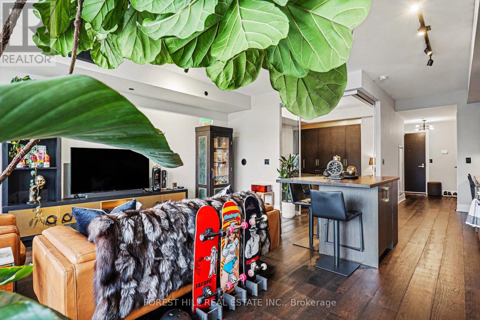 Bright and modern 1- bedroom & Den condo in one of Toronto's most desirable neighborhoods. Elegant hardwood floors flow throughout the open -concept living and dining area, enhance by floor-to-celling widows that fill the space with natural light and frame city view. The modern kitchen features stainless steel appliances and ample cabinet, perfect for cooking or entertaining. The versatile den can serve as a home office or creative space. Step out to your into your private balcony to enjoy fresh air and city vibe, includes one private underground parkin spot for added convenience. located steps from transit, shops, restaurant, and cultural amenities, this unit combines style, functionality, and the perfect balance of city living and personal comfort. Ready to move in and enjoy!Additional touches included in: select furniture and build -ins such as the TV console, office desk, Livingroom crouches, and coffee table, bedroom bed, mattress, and two night tables are included. The Fiddle leaf fig tree may remain to enhance. Its optional to remain and it will be decided between Landlord and Tennant. (id:64974)