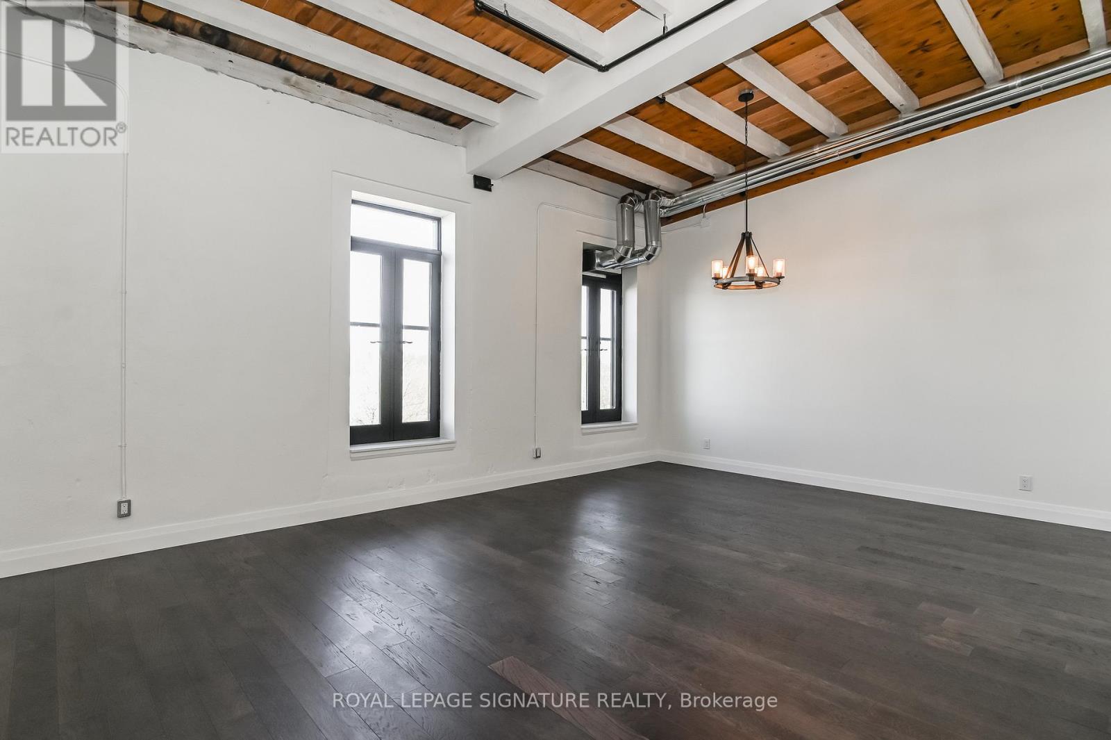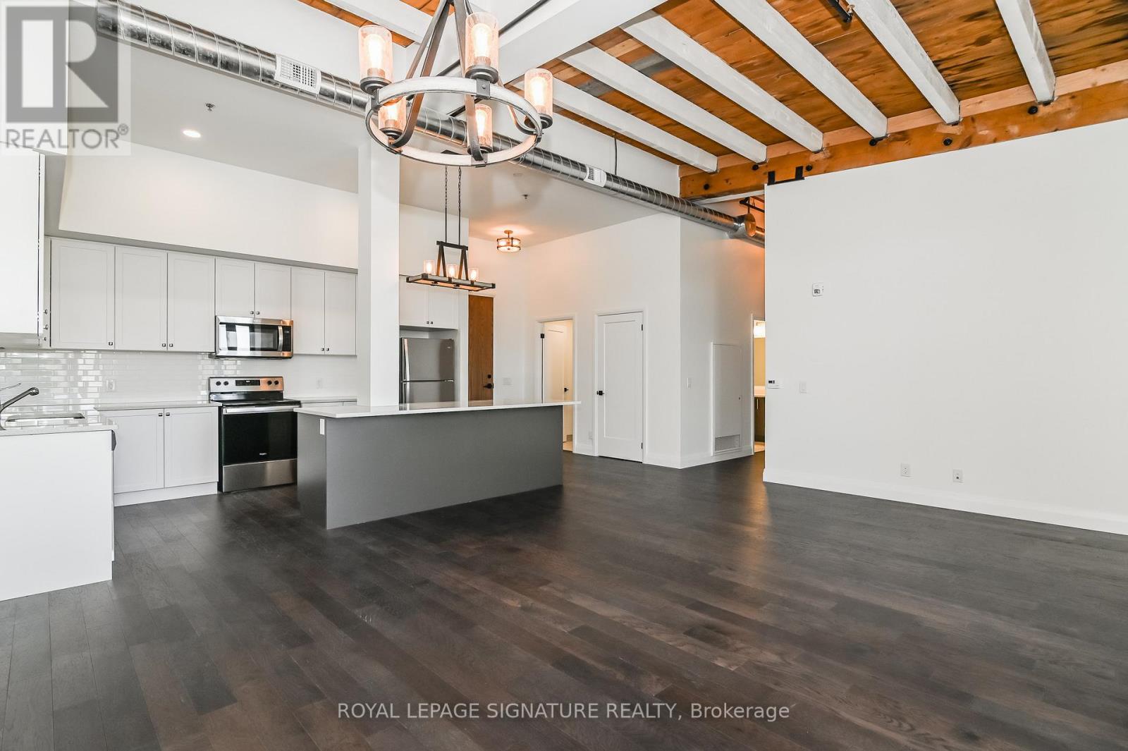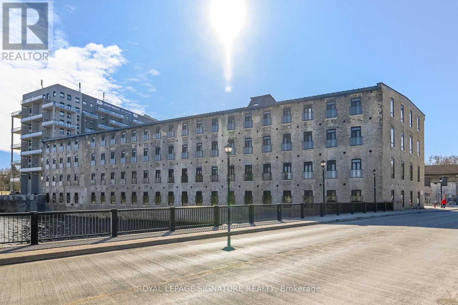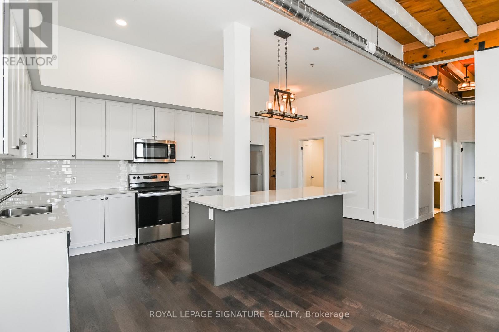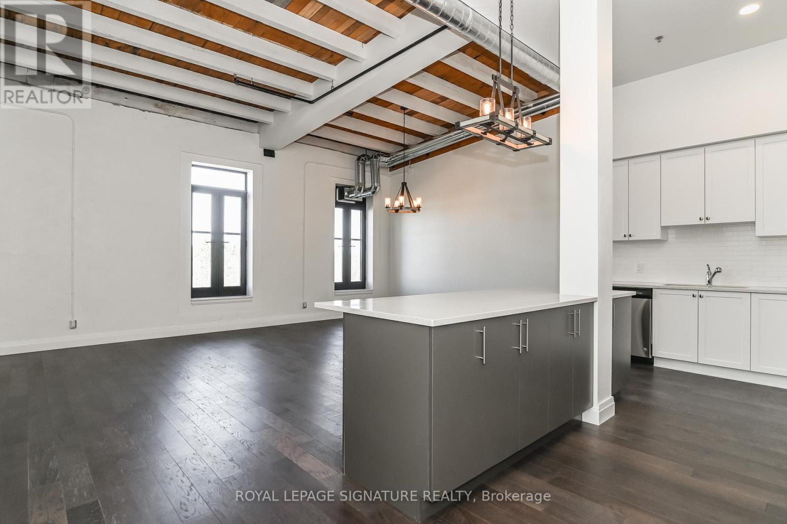 Rarely offered opportunity to lease a unit on the top floor in this luxury historic converted building in the heart of Hespeler Village. This 2 bed, 2 bath suite showcases original post and beam construction, soaring 15' ceilings, and plenty of windows with Juliette balconies which frame unobstructed views of the Speed River. Thoughtfully designed with a spacious, functional open concept layout and hardwood floors throughout. The modern kitchen featuring stainless steel appliances, quartz countertops and an oversized island with breakfast bar completes the center of this home. Accessibility-friendly with wider doorways, hallways and bathroom. The building was carefully crafted to appreciate the historic craftsmanship while infusing modern day finishes and amenities. This suite includes a very rare 2 car enclosed private garage. Enjoy the charm of this historic community- you're just steps away from downtown Hespeler and it's restaurants, boutique shops, cafes, library, long scenic trails and parks. Convenient access to HWY 401 and nearby amenities makes commuting effortless while still offering an elevated lifestyle yet peaceful setting to come home to. (id:64974)
