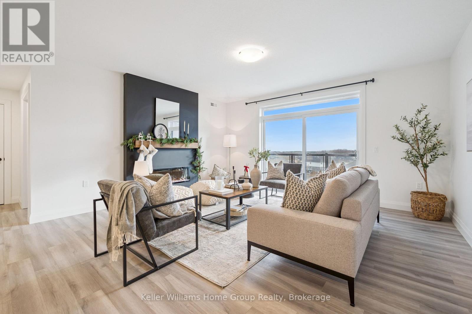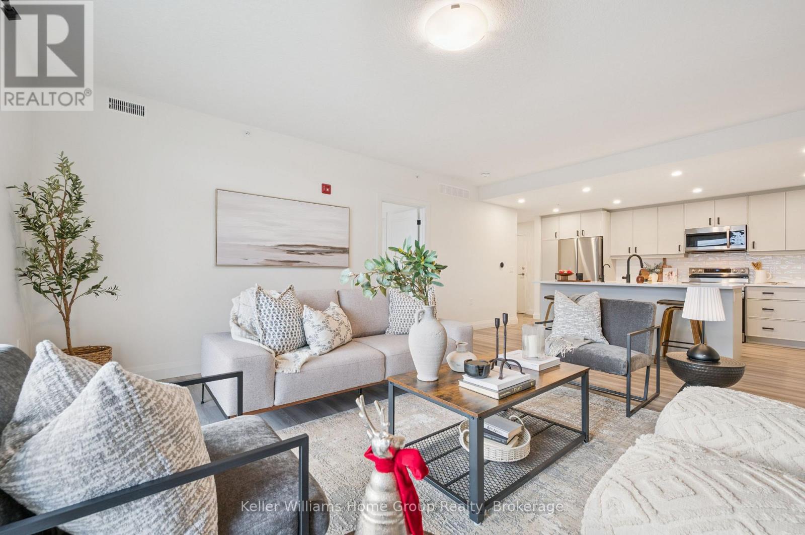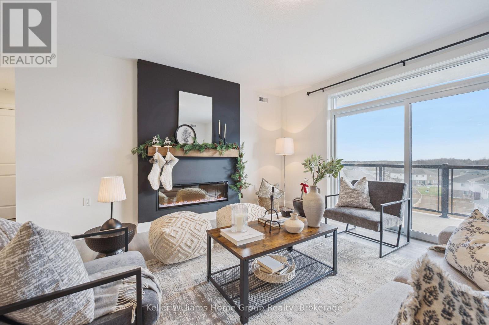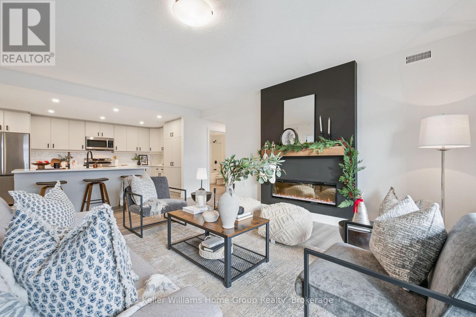Arguably one of the nicest condo units within 99B Farley Rd., for it's top floor location with elevator access, privacy, south-west exposure, spacious floor plan and storage offerings. This 1275 square foot condo offers 2 generous bedrooms, 2 full baths and an underground parking spot with exclusive locker space. Quality built in '2024 by Keating, this condo has been designed with high quality finishes, ample parking, storage and an eco-friendly Geothermal climate control system for ease of utility costs. It's functional open-concept floor plan offers a very generous kitchen with centre island and breakfast bar, elegant granite countertops and waterfall off island, complete with stainless steel appliances. A seamless flow to the large bright living room, with built-in fireplace and beam mantle, leads out sliding doors to the large balcony overlooking the rear of building (opposite the parking). This sought after layout offers two generous bedrooms, primary bedroom with it's own full ensuite bath and walk-in closet. Second bedroom enjoys it's own use of another full bathroom. In-suite laundry room offers additional storage within unit. Various tasteful updates added throughout this unit, make it a wonderful home for luxury and comfort. The underground parking is right next to elevator and alongside has exclusive large storage unit. Located close to the new Groves Hospital and medical clinics, new public school, parks and walking trails and just a short drive to downtown Fergus and Elora for all they have to offer. You will want to make this a 'must see' and look forward to this holiday season in your new home. (id:64974)