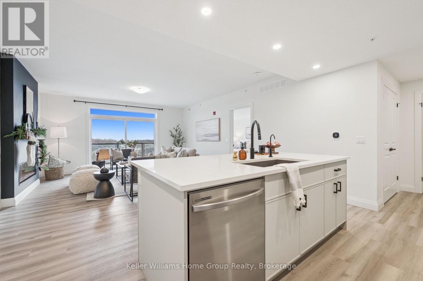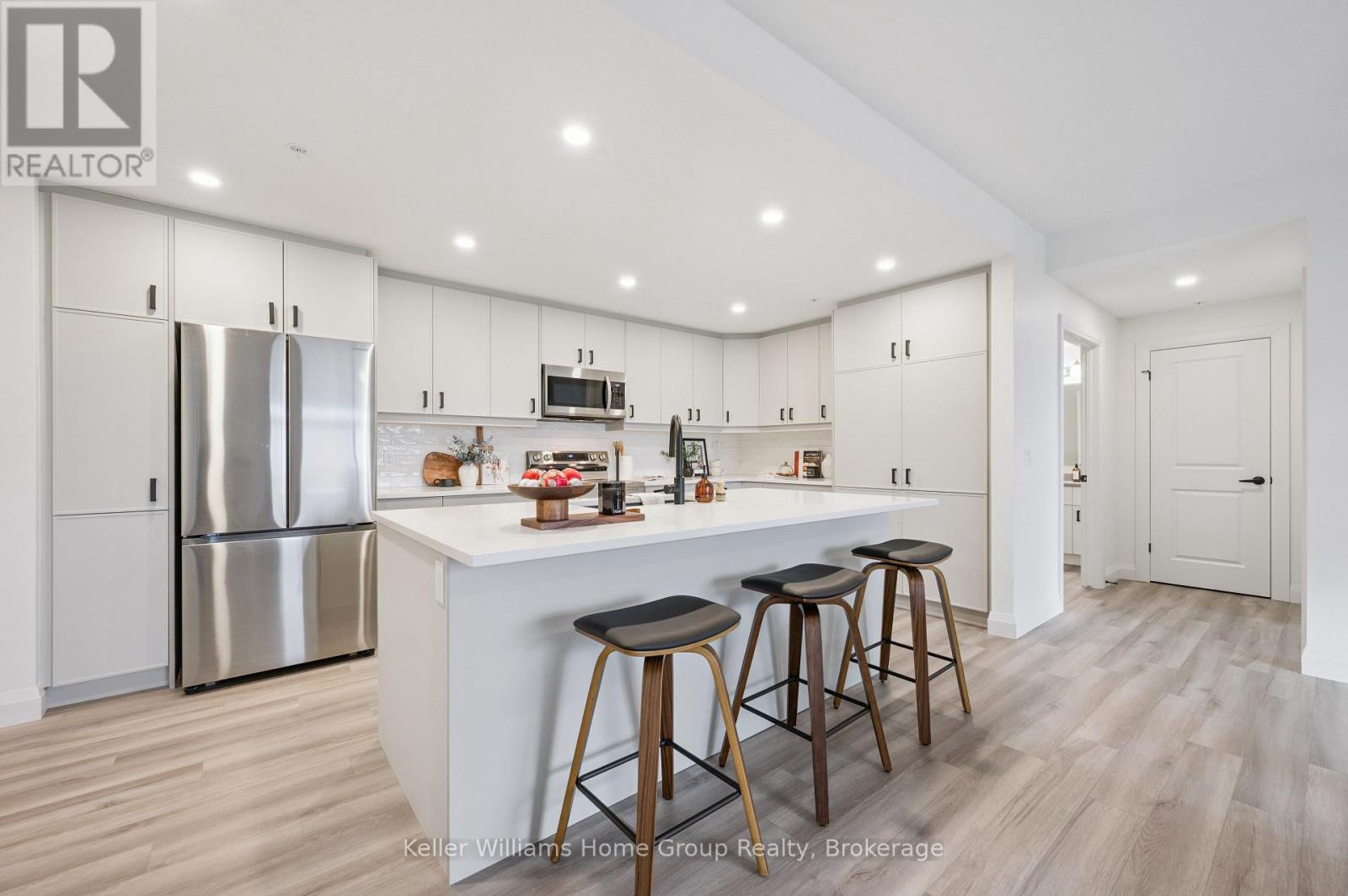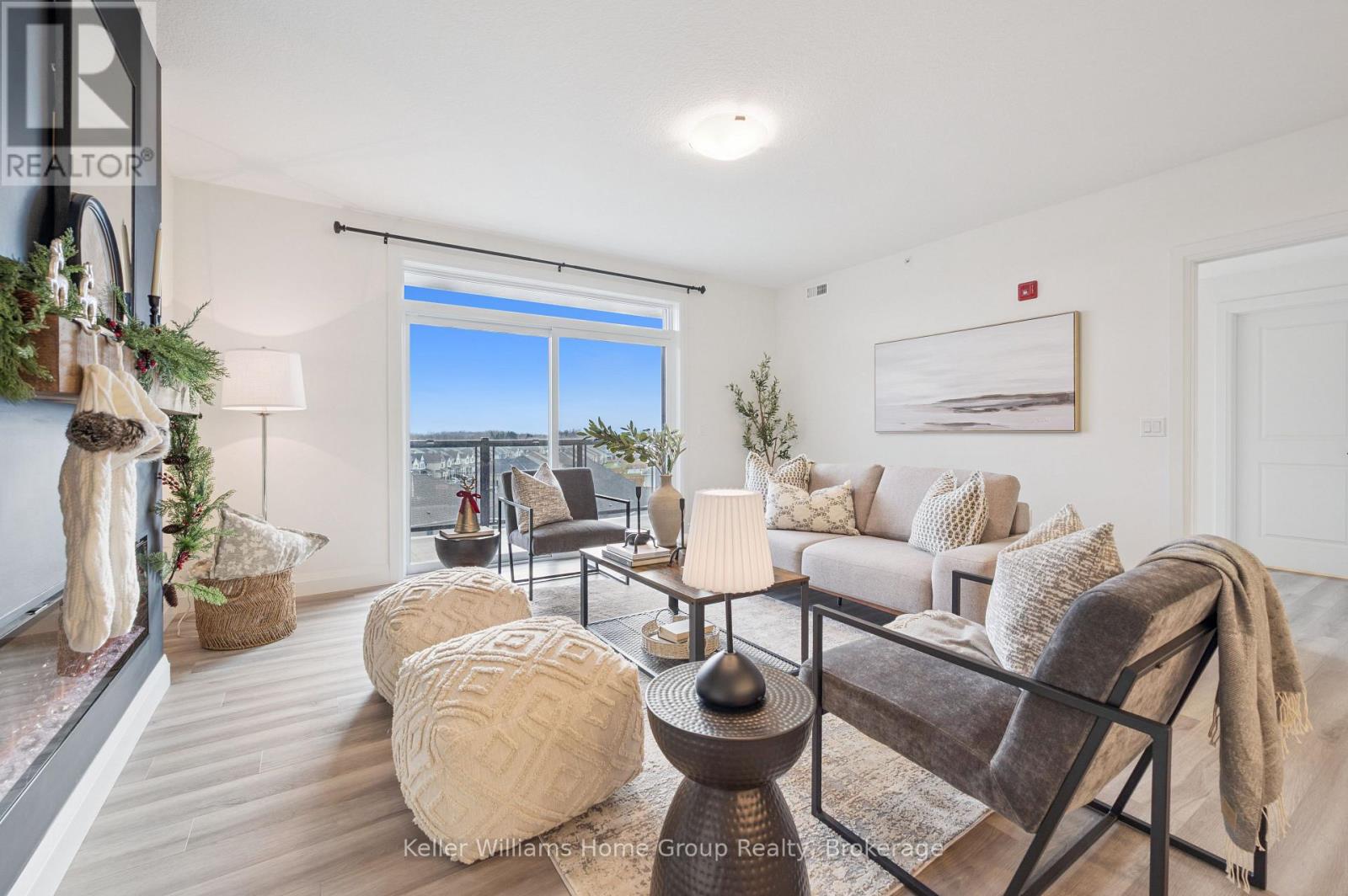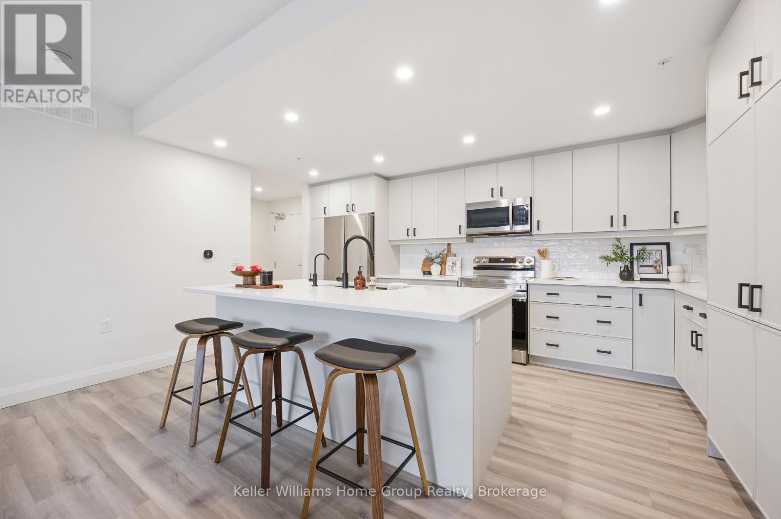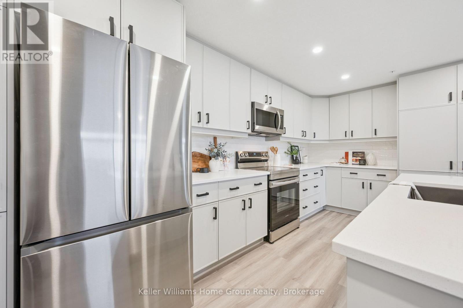 Arguably one of the nicest condo units within 99B Farley Rd., for it's top floor location with elevator access, privacy, south-west exposure, spacious floor plan and storage offerings. This 1275 square foot condo offers 2 generous bedrooms, 2 full baths and an underground parking spot with exclusive locker space. Quality built in '2024 by Keating, this condo has been designed with high quality finishes, ample parking, storage and an eco-friendly Geothermal climate control system for ease of utility costs. It's functional open-concept floor plan offers a very generous kitchen with centre island and breakfast bar, elegant granite countertops and waterfall off island, complete with stainless steel appliances. A seamless flow to the large bright living room, with built-in fireplace and beam mantle, leads out sliding doors to the large balcony overlooking the rear of building (opposite the parking). This sought after layout offers two generous bedrooms, primary bedroom with it's own full ensuite bath and walk-in closet. Second bedroom enjoys it's own use of another full bathroom. In-suite laundry room offers additional storage within unit. Various tasteful updates added throughout this unit, make it a wonderful home for luxury and comfort. The underground parking is right next to elevator and alongside has exclusive large storage unit. Located close to the new Groves Hospital and medical clinics, new public school, parks and walking trails and just a short drive to downtown Fergus and Elora for all they have to offer. You will want to make this a 'must see' and look forward to this holiday season in your new home. (id:64974)