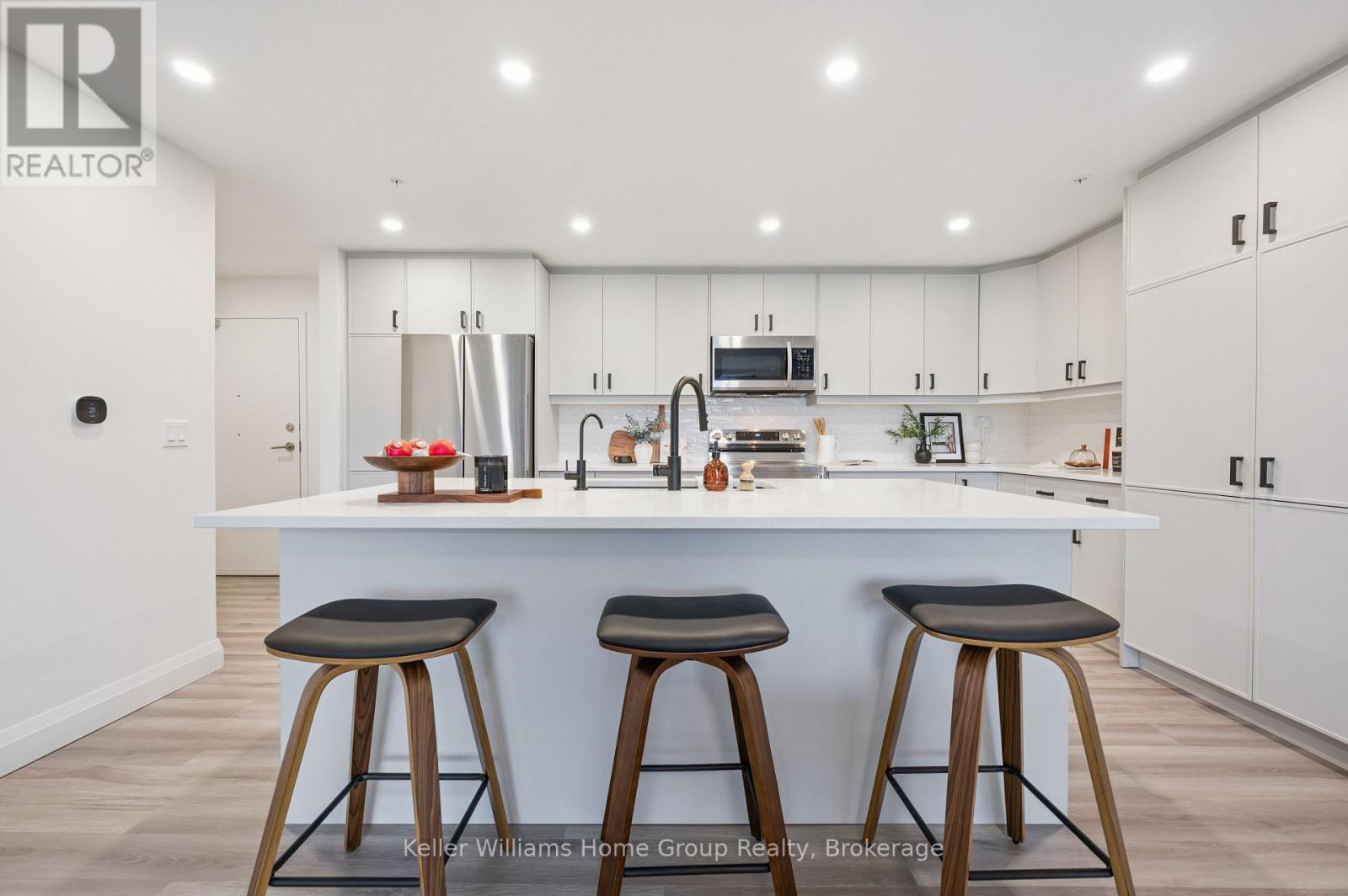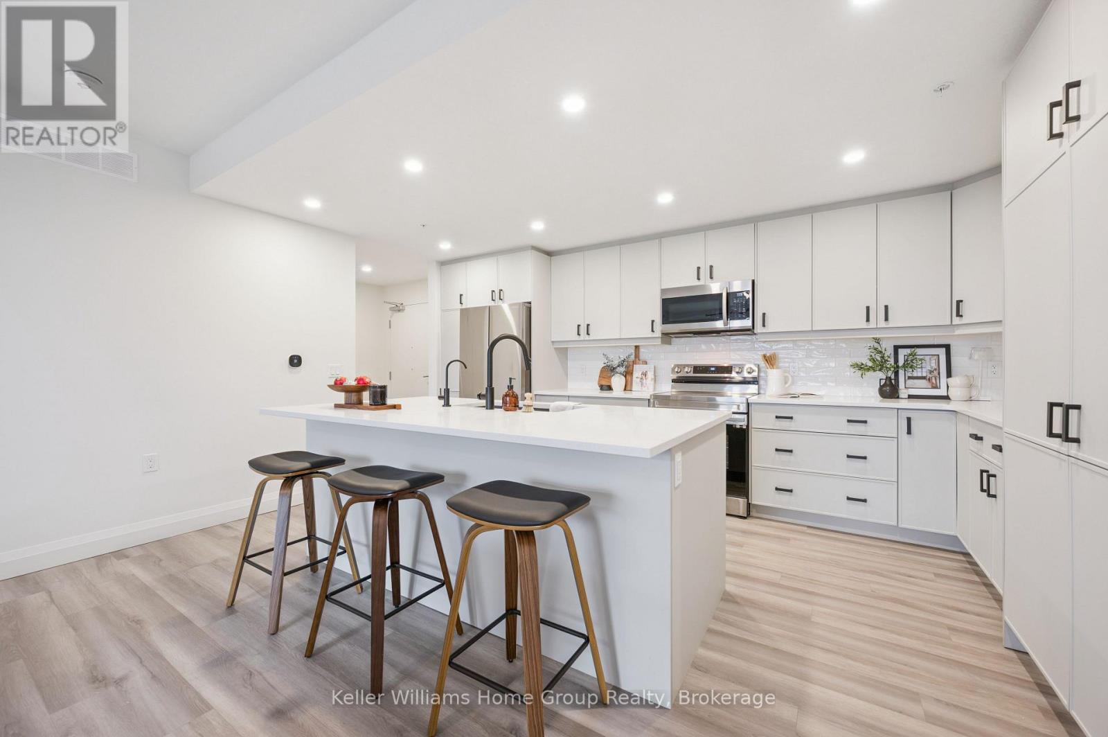 Arguably one of the nicest condo units within 99B Farley Rd., for it's top floor location with elevator access, privacy, south-west exposure, spacious floor plan and storage offerings. This 1275 square foot condo offers 2 generous bedrooms, 2 full baths and an underground parking spot with exclusive locker space. Quality built in '2024 by Keating, this condo has been designed with high quality finishes, ample parking, storage and an eco-friendly Geothermal climate control system for ease of utility costs. It's functional open-concept floor plan offers a very generous kitchen with centre island and breakfast bar, elegant granite countertops and waterfall off island, complete with stainless steel appliances. A seamless flow to the large bright living room, with built-in fireplace and beam mantle, leads out sliding doors to the large balcony overlooking the rear of building (opposite the parking). This sought after layout offers two generous bedrooms, primary bedroom with it's own full ensuite bath and walk-in closet. Second bedroom enjoys it's own use of another full bathroom. In-suite laundry room offers additional storage within unit. Various tasteful updates added throughout this unit, make it a wonderful home for luxury and comfort. The underground parking is right next to elevator and alongside has exclusive large storage unit. Located close to the new Groves Hospital and medical clinics, new public school, parks and walking trails and just a short drive to downtown Fergus and Elora for all they have to offer. (id:64974)