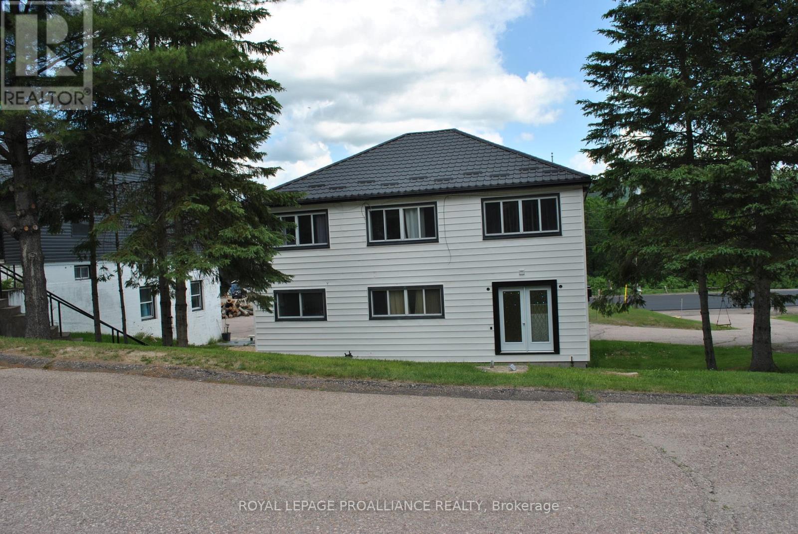 Investment opportunity in Stonecliffe! Here's some of the numbers - four separate homes, eight garage spaces, fourteen bedrooms, seven bathrooms, 4.4 acres and enough parking for everyone! Whether you use it strictly for residential or add in some of the many commercial uses, there are so many possibilities for this property. A place for you and your extended family to live, each with their own house. Or, live in one and rent out the others, or rent out the large house by the room to snowmobilers in the winter and other travelers year round. This is close to the OFSC trails, lakes and parks and campgrounds. Many updates to 3 of the houses since 2020, new steel roof on all 4 houses, the 4 bay garage with 2 office/workshop areas was completely rebuilt, new roof, updated wiring(200A), all brand new garage doors and 2 man doors. The 3 bay garage used to be used by the MNR as a fire department, so the doors are sized for large truck to enter, as well as multiple storage rooms behind each bay, a TNT storage room, and a large office/storage space above the bays. The main house is above this garage and has 3 bedrooms, 2 full bathrooms(one is an ensuite), heated floors in the foyer and ensuite, a huge kitchen with plenty of countertops and storage and a wood fired cookstove and a wood furnace below in the garage. The blue house has 2 bedrooms, 1 full bathroom, recently painted, newer propane furnace and woodstove(2020). The lodge house has 7 bedrooms, 2 on the main floor, 5 on the second floor, 3 full bathrooms, a full unfinished basement, FA Propane furnace, woodstove, separate hydro meter. Also on the property is a large separate steel garage building and a storage building built into the hill. There are trails for waking or ATV's on the property and lots of room to create more. The possibilities are endless for this unique property. (id:64974)