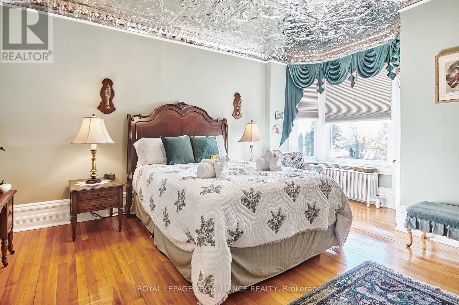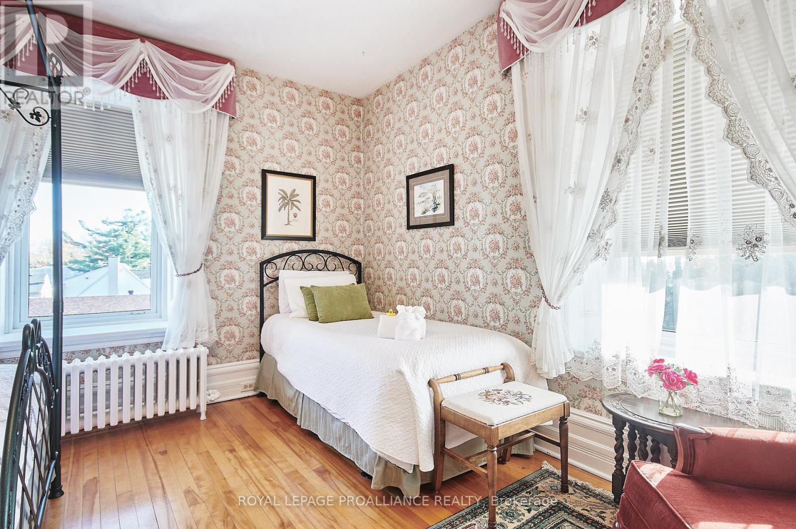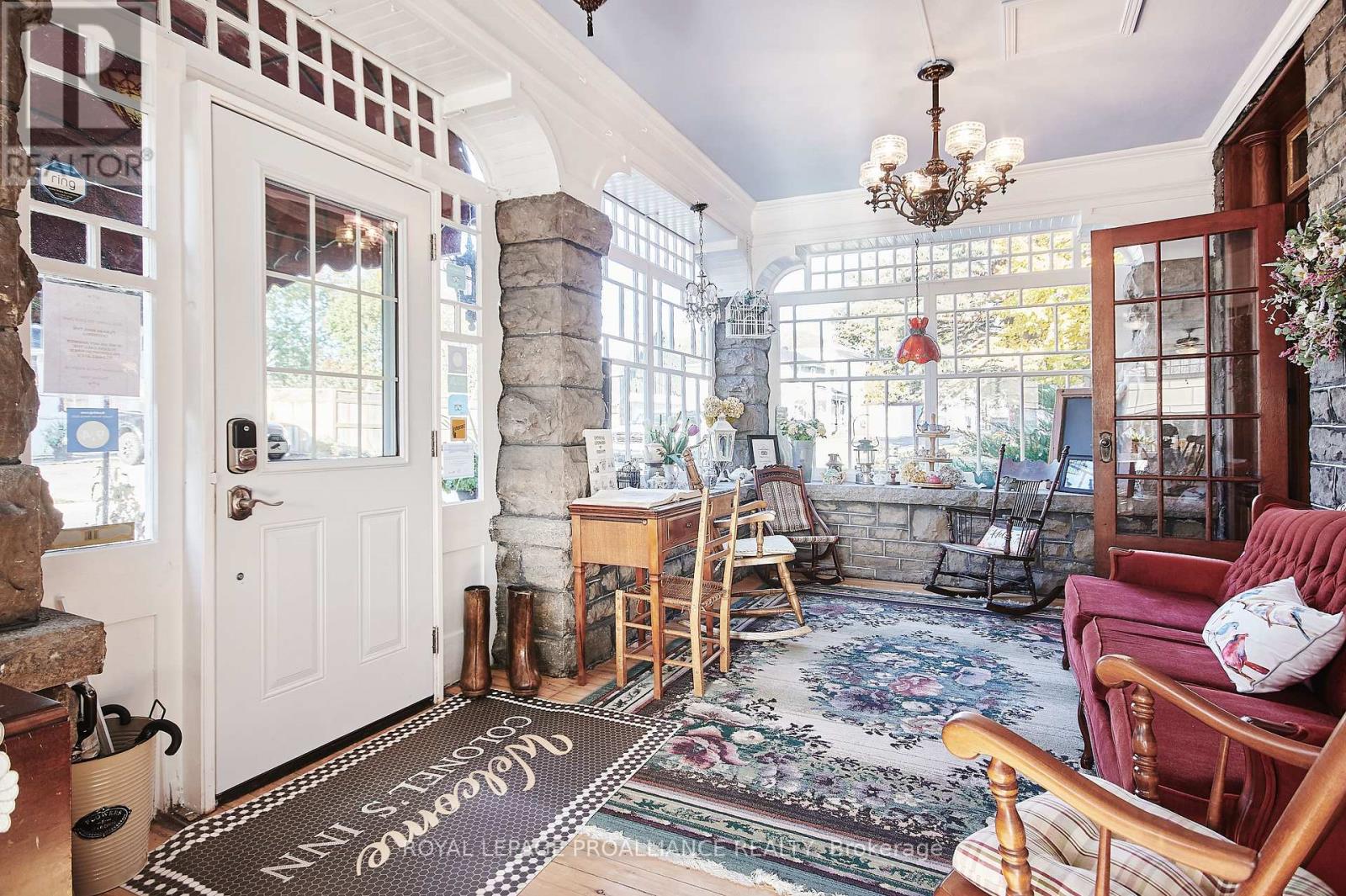 A cherished piece of history has arrived to market. This spectacular 3 storey (circa 1830, as per MPAC) straight coursed stone home was originally built by members of Colonel McDonell's family (Colonel of Fort Wellington). This home is proudly positioned on a 1/2 acre of property within the Fort Town. An extensive addition by Denis Higgins in 1909 transformed this home to a level of opulence with the addition of a spectacular dining room and butler's pantry, a large kitchen, porches (later to be all enclosed) and the carriage house. Further upgrades have been completed over the years. The moment you enter home you instantly feel connected to the Loyalist roots. Solid oak panelled walls, woodwork, banisters & finishings have been meticulously crafted. The dining room has a hand-painted silk ceiling, while the living room has bevelled glass pocket doors, a parlour coal stove(now gas) with the original marble hearth and vintage tin ceiling on the second floor. Boasting 11 beds, 9 baths, 5 fireplaces, a detached "carriage house", lovely stone patio, inground pool, and enclosed wrap around verandah (tea room). There isn't another home quite like this in the area. Currently operating as the Colonel's Inn Inc., this turn-key opportunity with an established business is yours to carry on or occupy as a family home, or perhaps a multi-generational home. In previous years, the enclosed front porch operated as an Antique Store ... a home based business. There is a full basement which offers the laundry area, storage for the Inn supplies ( which includes linens), a mechanical room, workshop, storage, office and a 4 pc. washroom. Located two blocks from the Majestic St. Lawrence River, the Sandra Lawn Harbour, Amphitheatre , and downtown core. Centrally located to Highways 401, 416 and the USA International Bridge. (id:64974)