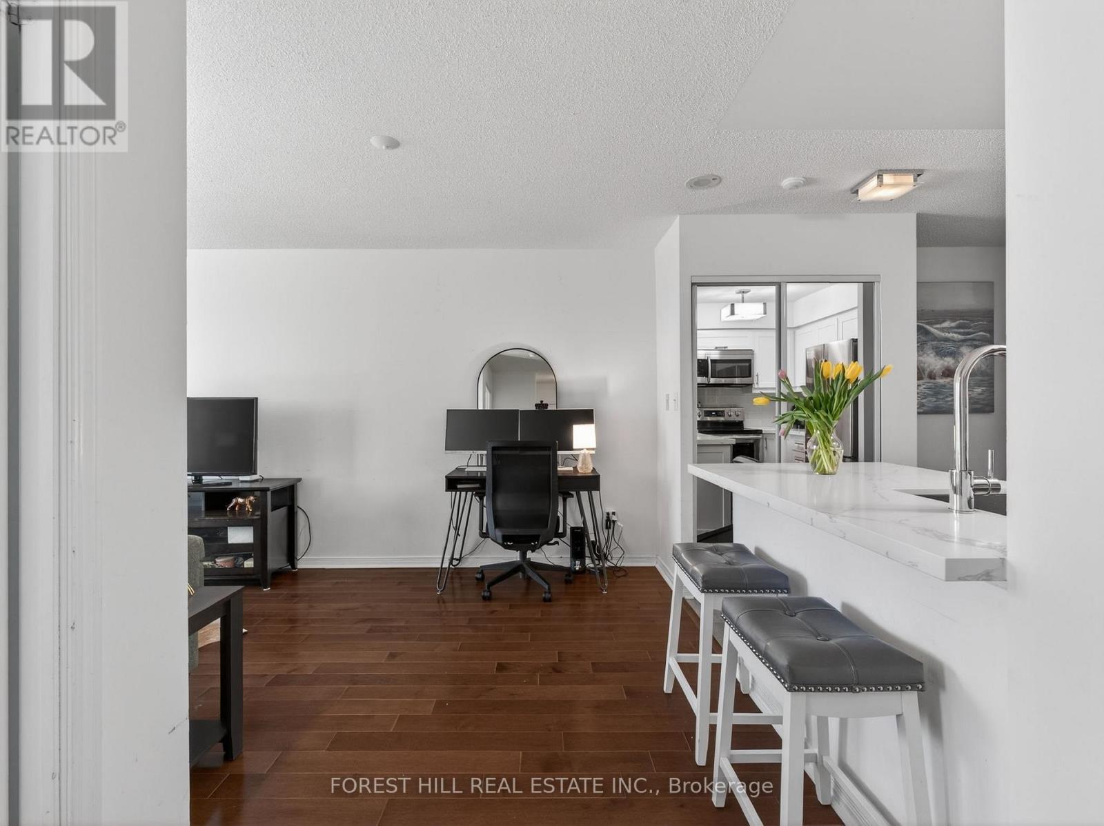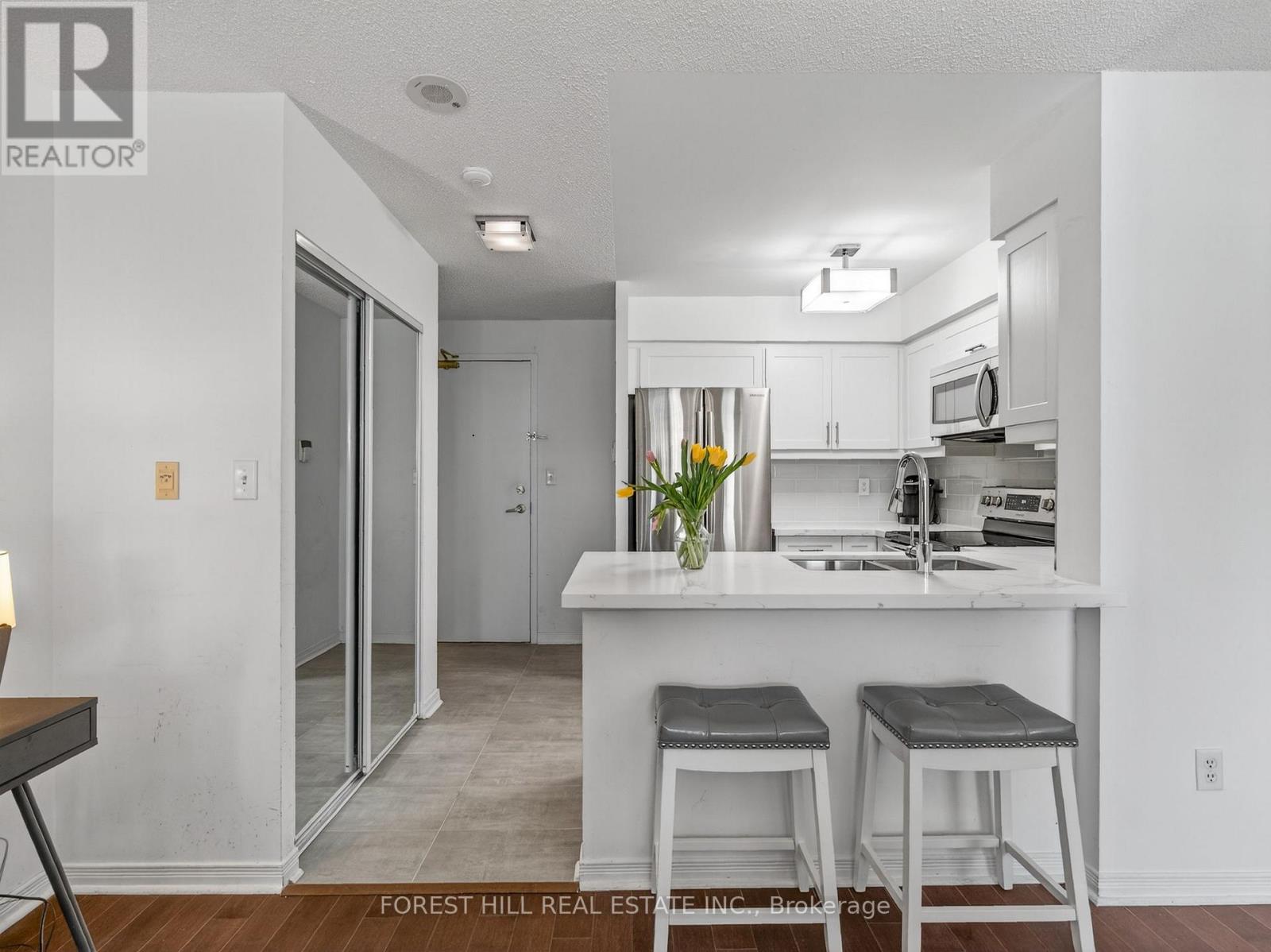 Welcome to this beautifully updated, spacious open-concept 1-bedroom, 1-bathroom suite offering comfortable and modern living at its finest. This stunning home features a beautifully updated custom kitchen renovated from top to bottom, showcasing gorgeous custom cabinetry, sleek quartz countertops, stainless steel appliances, and ceramic flooring throughout the kitchen area. The open-concept layout flows seamlessly into the bright and inviting living and dining areas, perfect for entertaining or relaxing in comfort.Engineered hardwood flooring runs throughout the suite, adding warmth and a seamless flow from room to room. The large primary bedroom offers generous space and features an oversized closet, providing plenty of storage. A convenient shoe closet at the entry adds practical storage and helps keep the space organized and clutter-free. Enjoy premium building amenities including a newly updated fitness facility, 24-hour security, and concierge service for added convenience and peace of mind. Ideally located within walking distance to shops, restaurants, and public transit, this home offers the perfect blend of style, comfort, and accessibility. (id:64974)