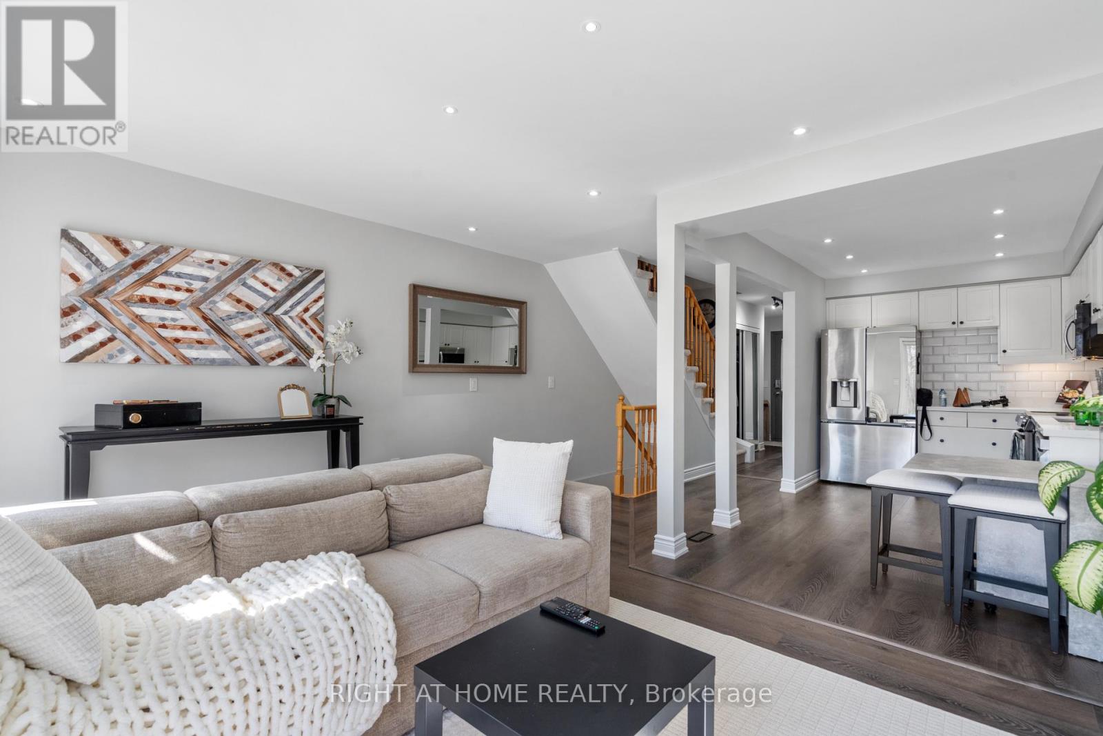 Fully furnished, renovated townhome offering approximately 1,624 sq. ft. of living space with a custom layout. Features include an open-concept main floor, upgraded kitchen with quartz countertops, backsplash, under-cabinet lighting, under-mount sink, and stainless steel appliances. LED lighting and pot lights throughout main living areas. Entryway finished with tile flooring and updated light fixture. Stucco ceilings removed in kitchen and living room. Freshly painted throughout, including loft, bedrooms, bathrooms, and finished basement.Finished basement provides additional flexible living space. Smart light switches and smart garage door opener included. Additional improvements include updated plumbing in kitchen and bathrooms, gas line for BBQ and fire pit, and garage shelving.Low-maintenance backyard with artificial turf. Convenient location with quick access to highways, shopping, restaurants, places of worship, and medical clinics. Note: Carpets will be professional cleaned and shampooed before new tenant takes possession (id:64974)