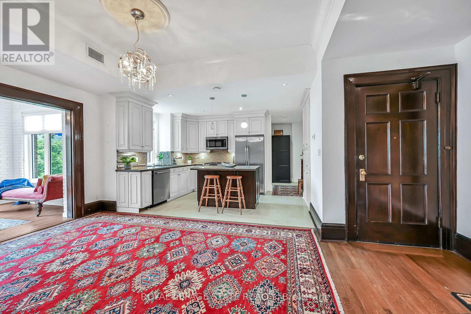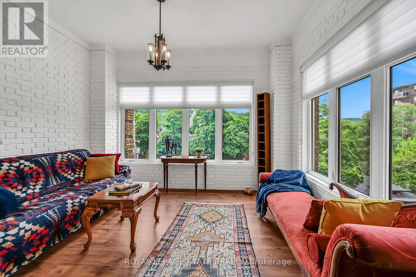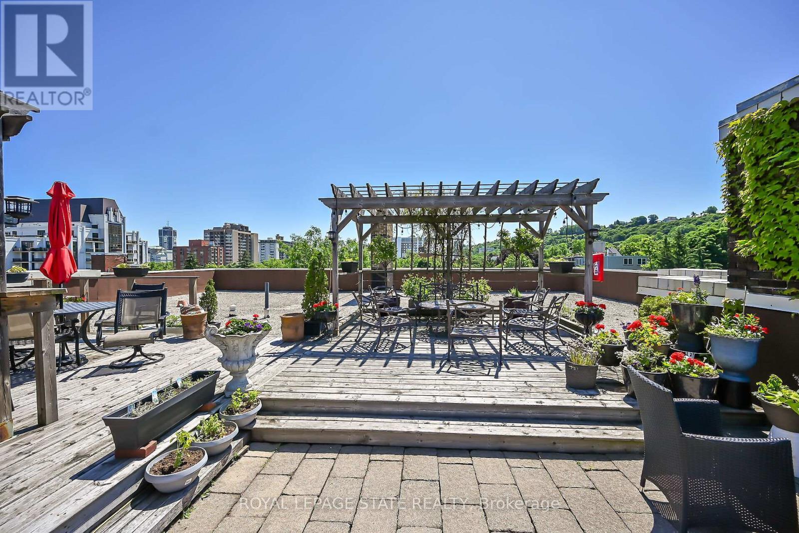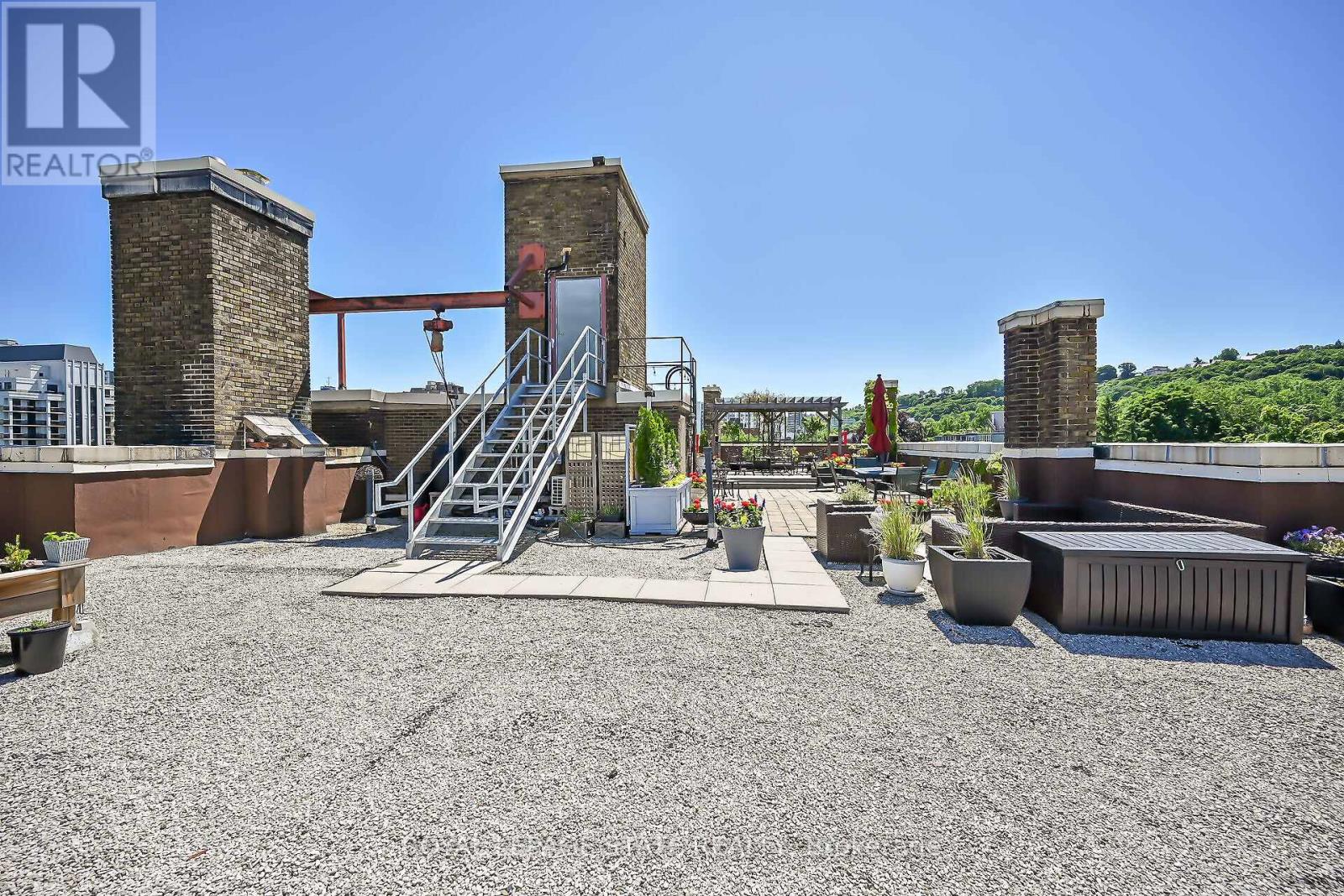 Rare Find! Welcome to this timeless penthouse in the Historic Herkimer Apartments! Located in the heart of Hamilton's prestigious Durand neighbourhood, this spectacular 2-bedroom, 1.5-bathroom condo blends historic elegance with modern convenience. This penthouse unit features inlaid hardwood floors, coffered 10' ceilings, crown mouldings, pot lights, and a gas fireplace in the living room with built-in cabinetry. The open-concept kitchen boasts granite counters, an island with breakfast bar, and abundant cabinetry. Enjoy the 3 piece jacuzzi shower, in-suite laundry, and two separate entrances for added flexibility. Relax in the sunroom with breathtaking views of the Niagara Escarpment, through oversized windows, or entertain on the rooftop deck and terrace available to residents. Including in the terrace breathtaking city views, are sitting areas, gas bbq and gas fire table under a large gazebo. For added peace of mind, the in unit Furnace and Air-conditioning has been replaced in November 2025. Includes garage parking, locker, and all the charm of a historic building with the modern lifestyle of today. Don't miss this rare opportunity to own a piece of architectural history in one of Hamilton's finest neighborhood's! RSA (id:64974)