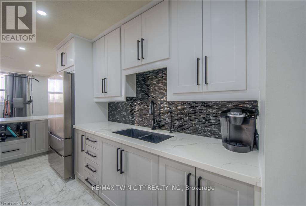 Welcome to Unit 410 at 185 Kehl Street - a rare and beautifully renovated gem in Kitchener that's truly move-in ready. Since 2022, this unit has seen over $30,000 in stylish upgrades, making it one of the most updated condos you'll find at this price point. Step inside to find updating flooring, fresh paint throughout and a warm, inviting living space complete with a custom fireplace surround. The completely renovated eat-in kitchen is a true showstopper, featuring quartz countertops, a custom island, beautiful cabinetry, and a newer stainless steel appliances - perfect for morning coffees, causal meals, or entertaining guests. The spacious layout includes a two-piece ensuite, a renovated main bathroom, and even in-suite storage to keep everything organized. Step out onto your private balcony and enjoy the sunset after a long day - it's a perfect spot to unwind. Set in a building with a distinctive exterior and updated windows, this unit stands out not just for its interior updates, but also for its low condo fees, which are a rare find in Kitchener-Waterloo. With quick access to Highway 7/8 and close proximity to everyday amenities, this condo is ideal for first-time buyers, downsizers, or savvy investors. Don't miss your chance to own one of the most beautifully updated units in the building! (id:64974)