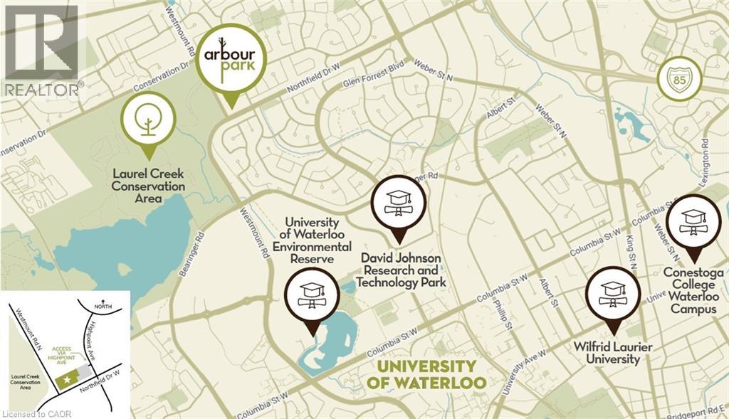 ARBOUR PARK - THE TALK OF THE TOWN! Presenting new stacked townhomes in a prime North Waterloo location, adjacent to the tranquil Laurel Creek Conservation Area. Choose from 8 distinctive designs, including spacious one- and two-bedroom layouts, all enhanced with contemporary finishes. Convenient access to major highways including Highway 85, ensuring quick connectivity to the 401 for effortless commutes. Enjoy proximity to parks, schools, shopping, and dining, catering to your every need. Introducing the Redwood 2-storey model: experience 1325sqft of thoughtfully designed living space, featuring 2 spacious bedrooms + a loft, 1.5 bathrooms with modern finishes including a primary cheater-ensuite, a walk-out patio, & private balcony. Nestled in a prestigious and tranquil mature neighbourhood, Arbour Park is the epitome of desirable living in Waterloo– come see why! ONLY 10% DEPOSIT. CLOSING 2026! (id:64974)