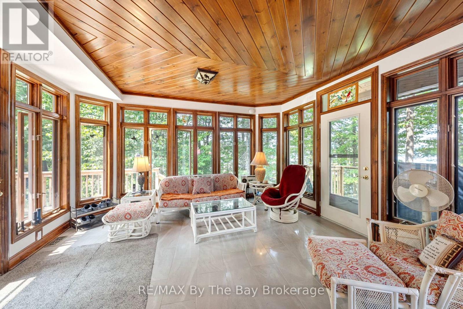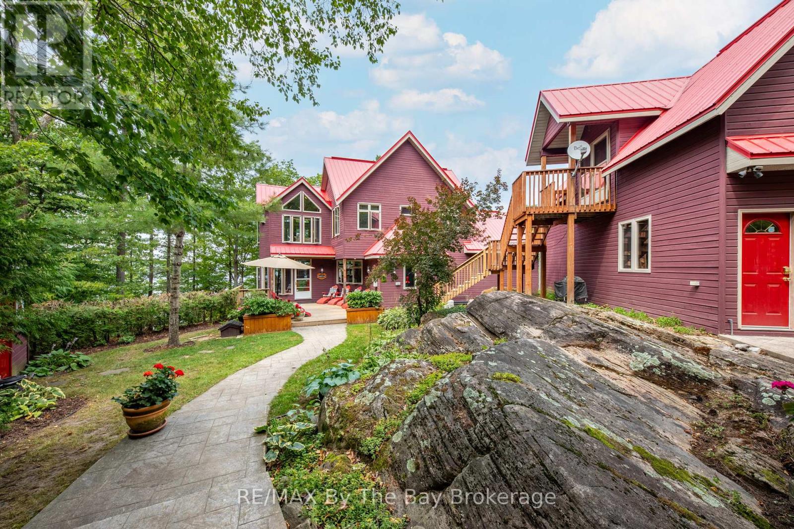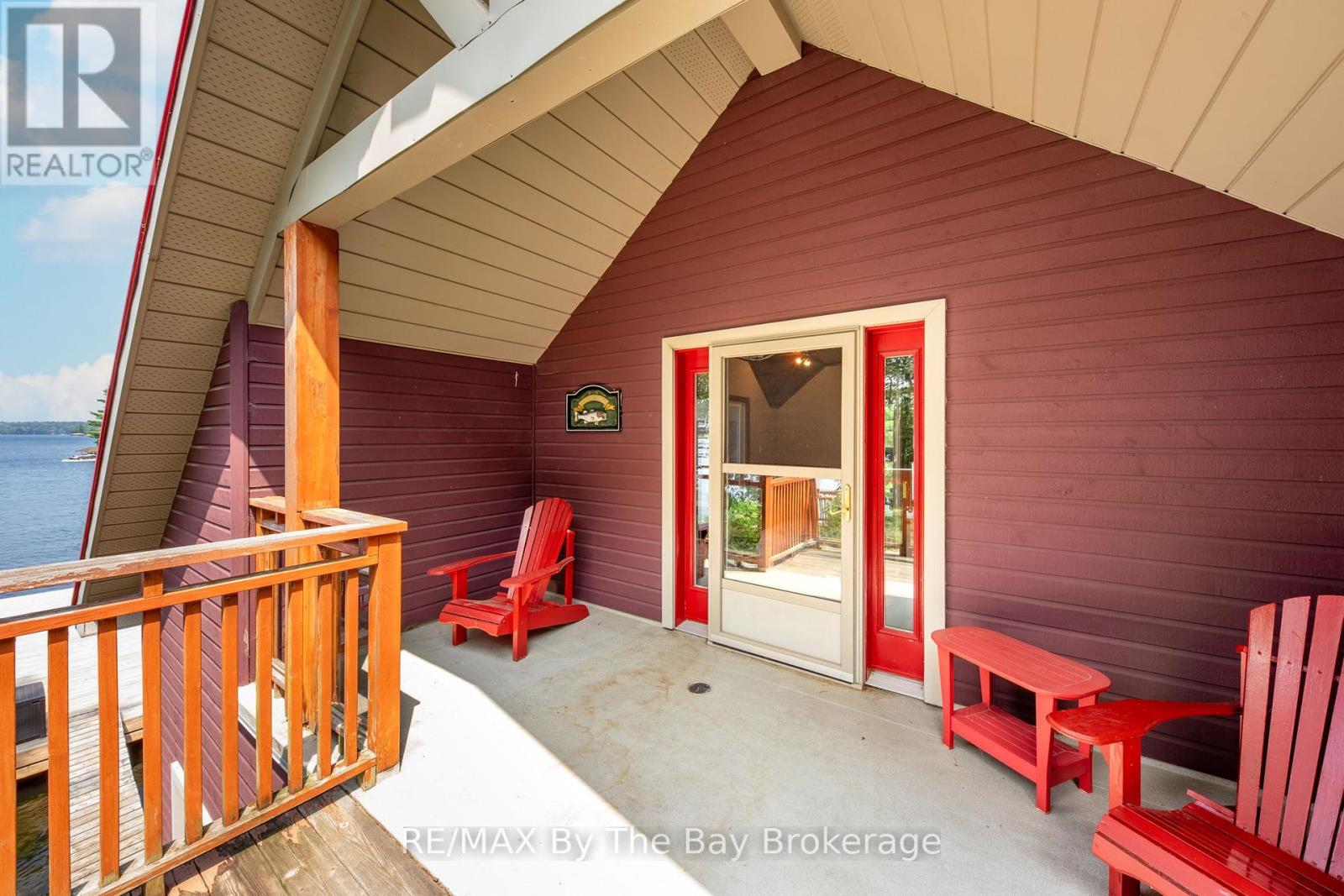 Discover your waterfront sanctuary where exceptional craftsmanship meets pristine natural beauty. This stunning 3-bed, 3-bath home showcases superior construction throughout, featuring an open concept design that connects living spaces while maximizing the breathtaking water views through expansive windows that flood the interior with natural light.The heart of this home centers around a massive stone fireplace, creating a focal point perfect for cozy evenings after days spent on the water. The thoughtful layout includes generous guest accommodations, ensuring friends and family feel welcome during their lakeside retreats. Multiple ceiling fans provide comfort during warm summer months, while the winterized construction allows for year-round enjoyment.Step outside to experience the magic of waterfront living. The property has an array of outdoor amenities, including a large dock perfect for mooring watercraft, a convenient double marine rail for easy boat launching, and your own private boathouse for secure storage. Gloucester pool offers refreshing swims, scenic water views and access to Georgian Bay and Severn River, while the screened patio provides bug-free relaxation during summer evenings.Multiple decks create various outdoor entertainment zones, complemented by beautifully maintained gardens that add natural charm to the landscape. A practical shed offers additional storage for outdoor equipment and seasonal items.Privacy is paramount here, with the secluded location ensuring peaceful mornings with coffee overlooking the water and tranquil evenings watching spectacular sunsets. Whether you're an avid boater, swimming enthusiast, or simply someone who appreciates the finer things in life, this property delivers an unmatched combination of luxury, functionality, and natural splendor.This is more than just a house it's your gateway to the ultimate waterfront lifestyle, where every day feels like a vacation and memories are made to last a lifetime. (id:64974)