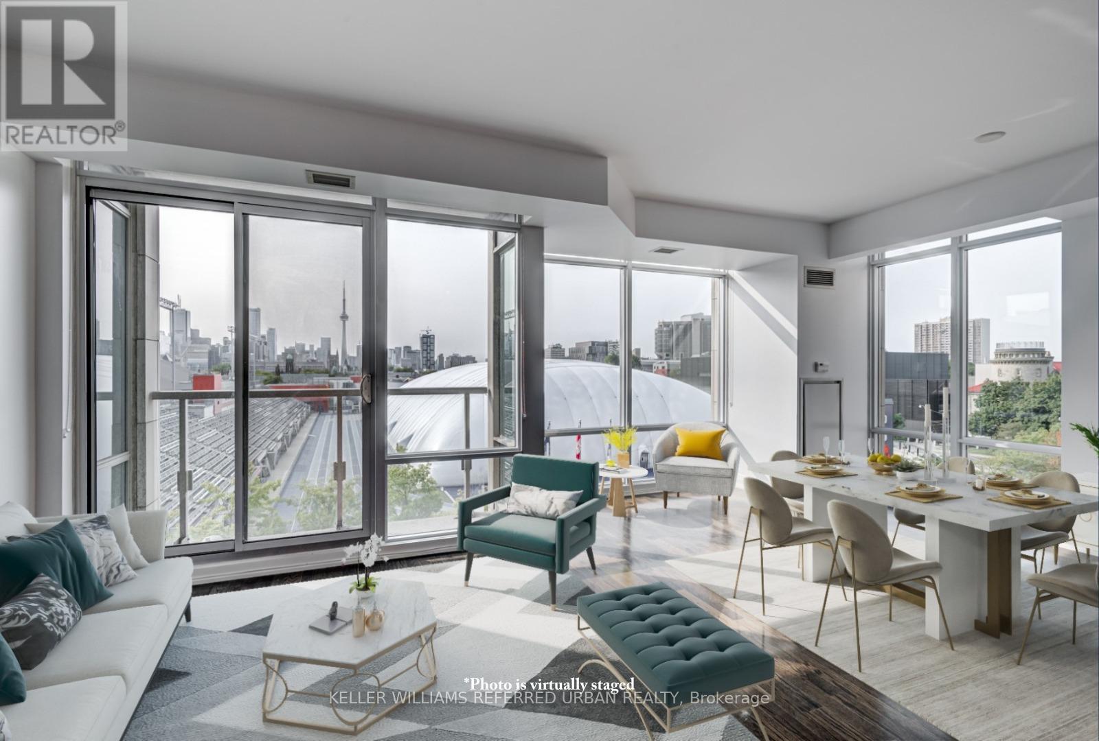 This upscale corner residence offers one of the most sought-after city views, with a direct sightline to the CN Tower. Thoughtfully designed, the layout maximizes space while providing added privacy with bedrooms set apart from the main living area.Enjoy two private balconies, rich hardwood flooring, and a spacious granite island with seating for five-perfect for both everyday living and entertaining. The kitchen is equipped with high-end Miele appliances, while the bathrooms feature elegant Crema Marfil flooring. High ceilings and updated roller shade blinds throughout, including blackout shades in the bedrooms, enhance both comfort and style. Additional highlights include a premium parking space conveniently located next to the elevator on P1 and a rare 4th-floor locker for added ease. Residents of this prestigious luxury building enjoy exceptional amenities, including a pool, 24-hour security, fully equipped gym, BBQ deck, and a beautifully appointed party room, with a Starbucks located right below.A rare opportunity to own a unit with such an incredible view-especially on a lower floor. (id:64974)