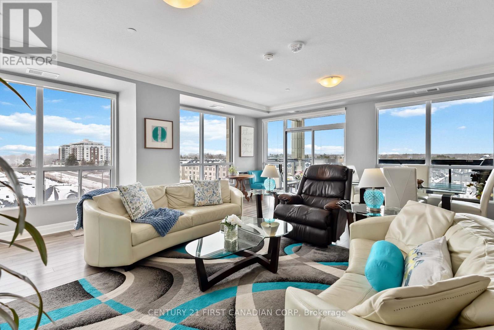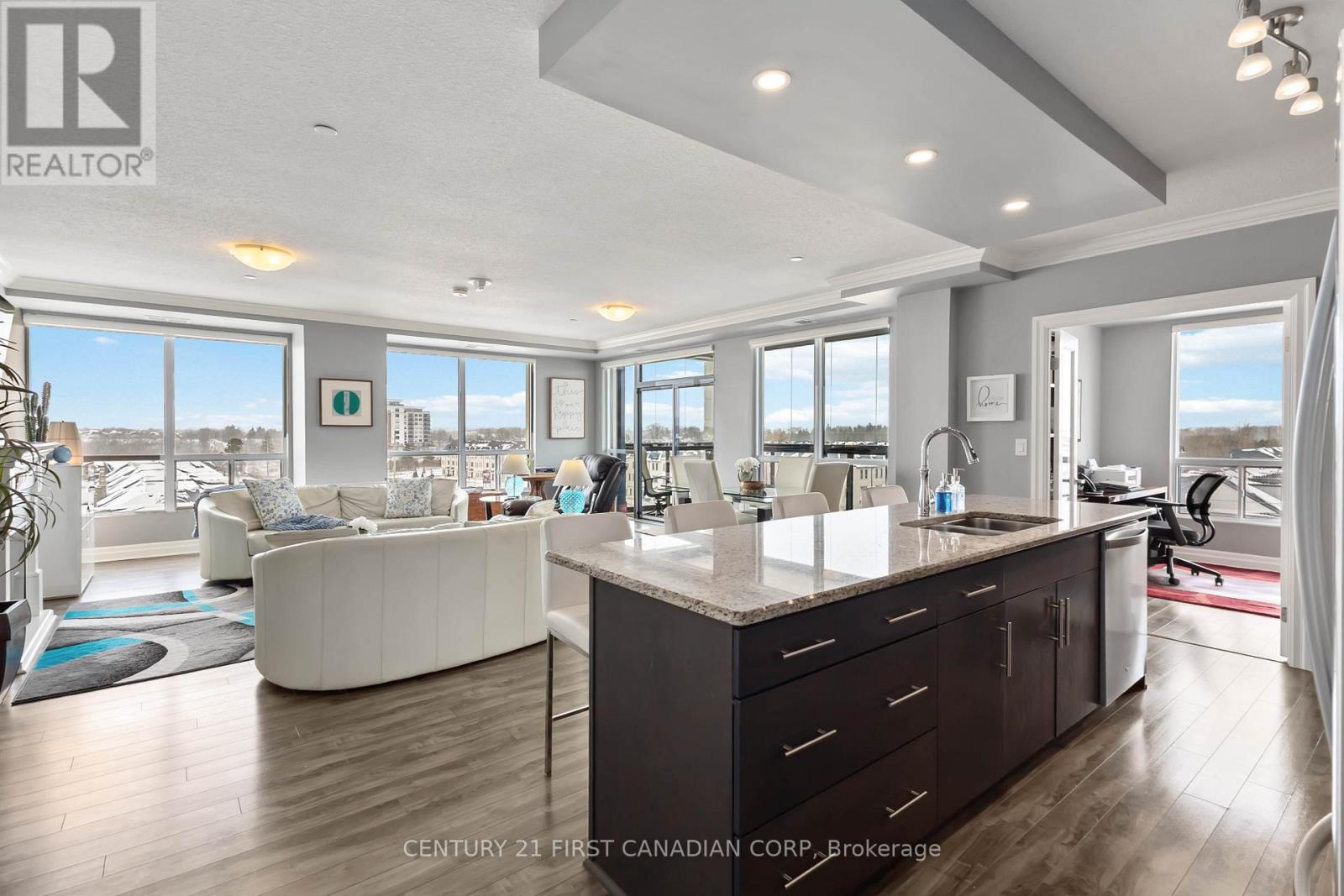 Experience refined condominium living in this spectacular sun-filled, north-west facing corner unit, where walls of windows invite an abundance of natural light & showcase breathtaking sunset views. Designed w/both elegance & comfort in mind, this sophisticated open-concept floor plan, the fireplace being the focal point, creates an exceptional setting for everyday living & stylish entertaining. The gourmet kitchen is truly the heart of the home, beautifully appointed w/granite countertops & a centre island, reflecting both quality & craftsmanship. The versatile den provides the perfect flex space-ideal as a private reading lounge, 3rd bedroom, guest retreat or an inspiring work-from-home office. With two large bedrooms & 2 full baths, the primary suite w/a walk -in closet, offers a serene escape, highlighted by a luxurious spa-inspired 4-piece ensuite w/a whirlpool soaker tub & a frameless glass shower designed for ultimate relaxation. Step outside to the private, carpeted balcony, enhanced w/a retractable glass enclosure that seamlessly extends your outdoor living season while allowing you to enjoy spectacular evening sunsets in comfort. Additional premium features include upgraded in-suite laundry w/custom cabinetry & additional storage, two underground parking spaces & an owned storage locker-offering convenience & peace of mind. As part of this prestigious Tricar development, residents can enjoy access to the high-end amenities such as an indoor salt water pool, golf simulator, fitness centre, billiards/lounge, dining room, theatre room w/wet bar, guest suites & quiet common spaces. Condo fees include heat & water. This sought-after location is steps from Sunningdale Golf & Country Club & walking trails & down the street from Masonville shopping centre, UWO, University Hospital, dining/grocery stores. This exceptional corner unit w/expansive NORTH & WEST facing views (over low rise developments), combines style & comfort to create an elevated living experience. (id:64974)