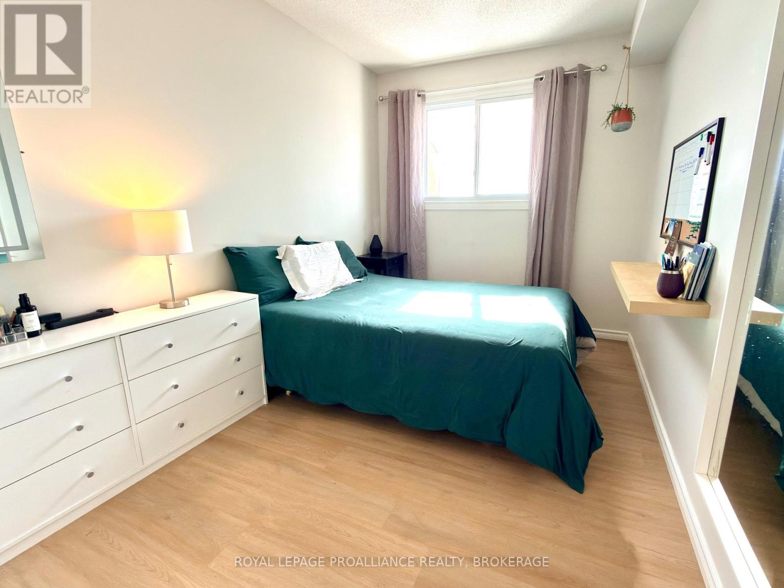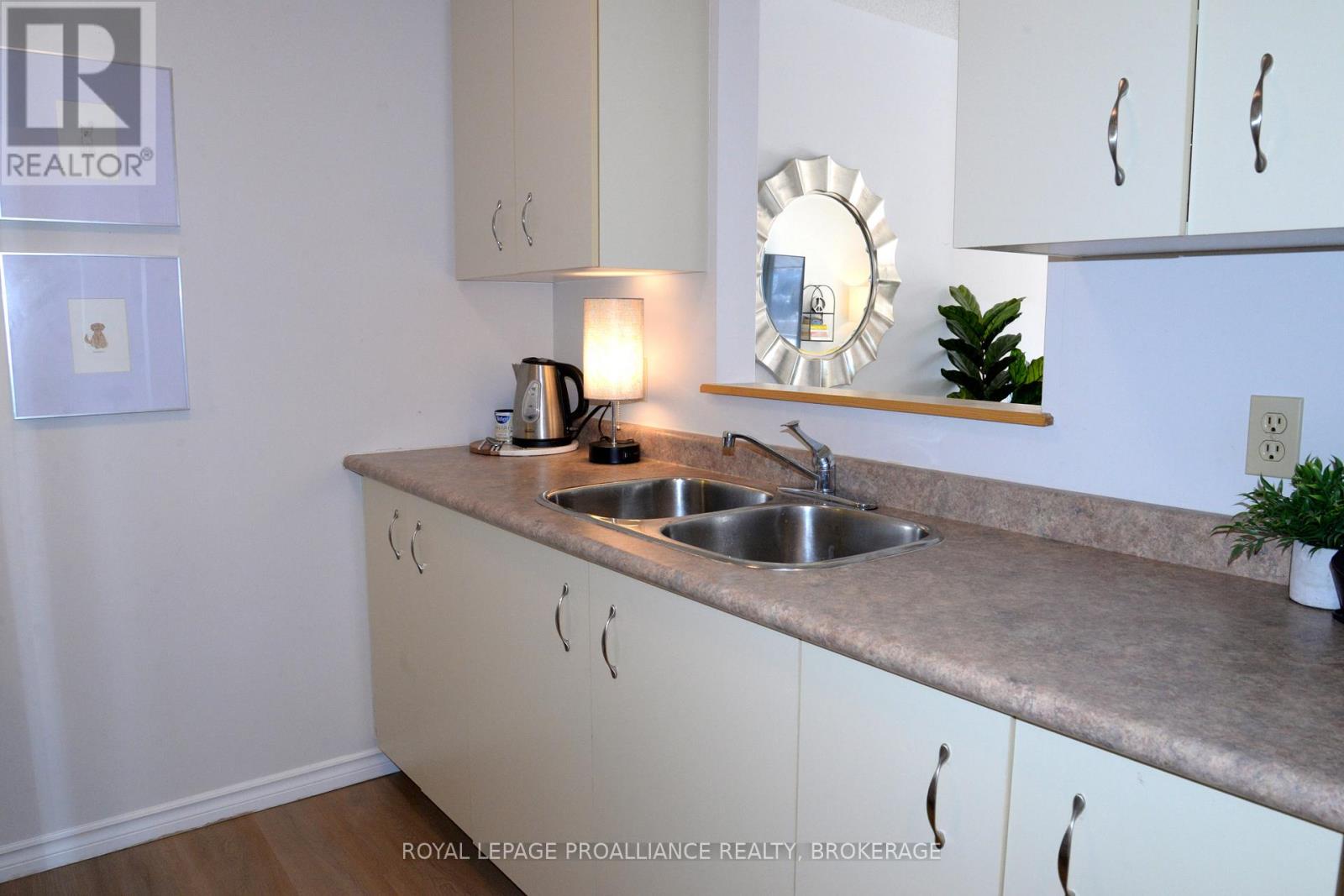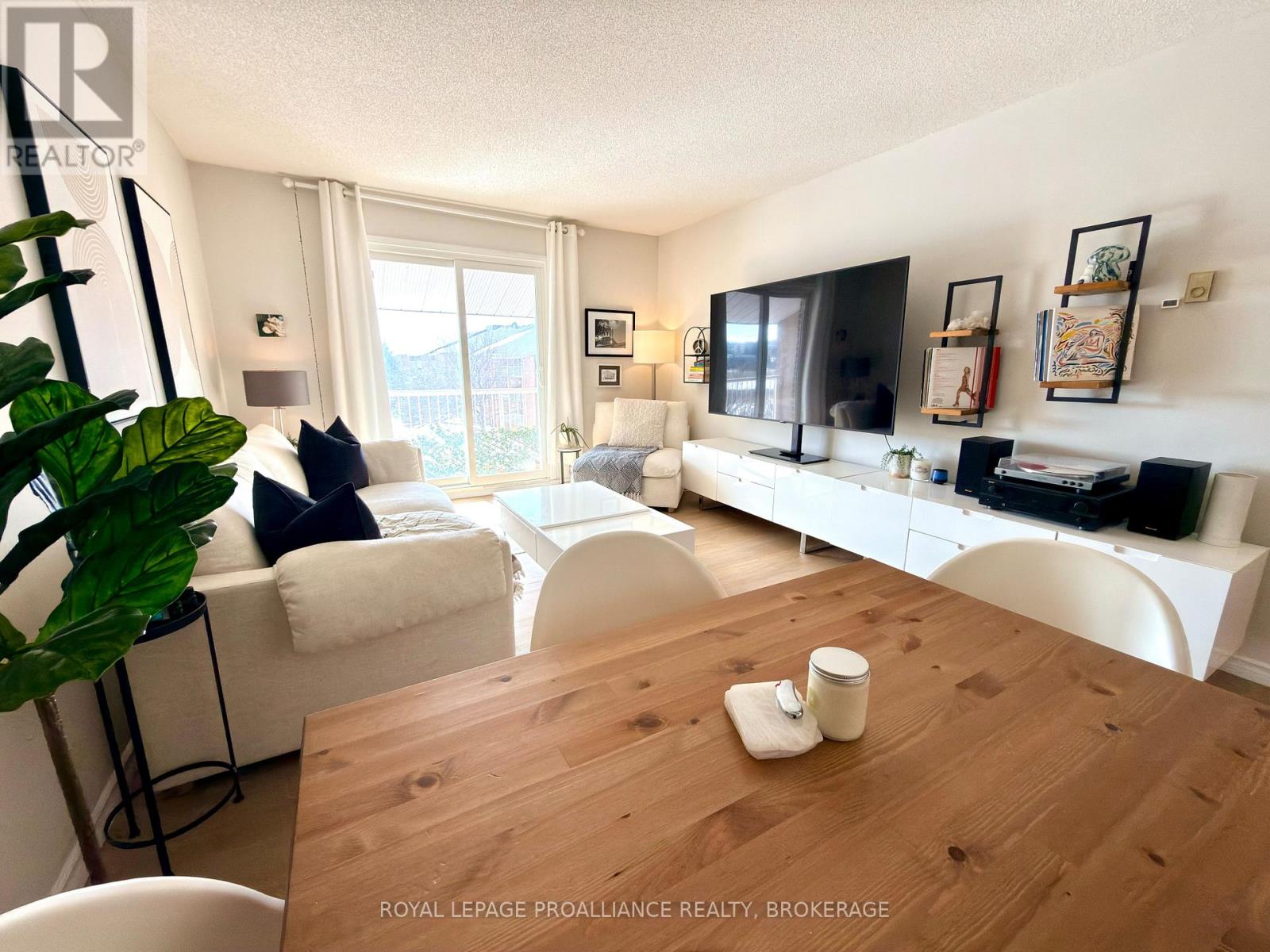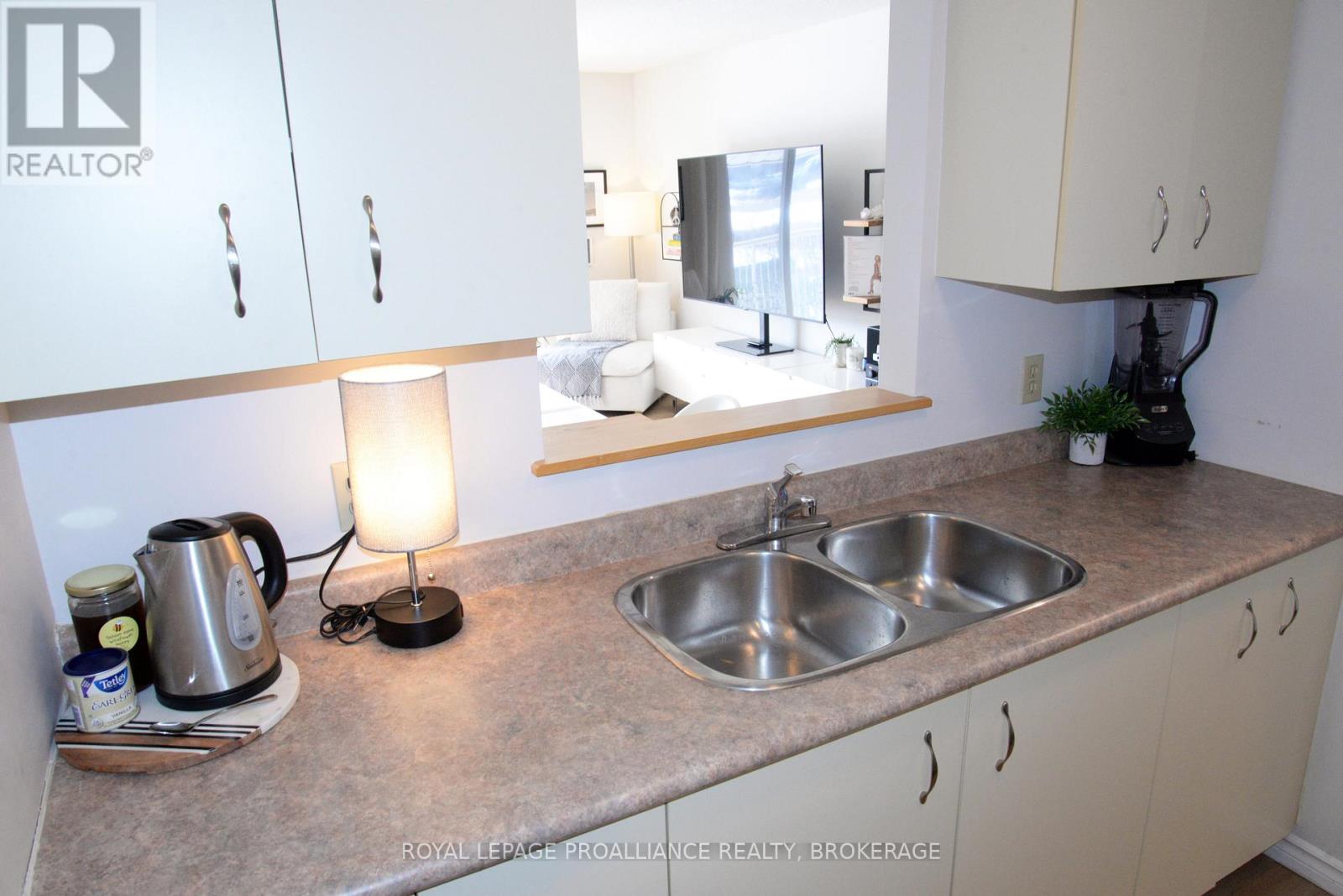 Welcome to this ideally located 2-bedroom condo in a great central city neighbourhood - perfect for students, professionals, or investors alike. Conveniently situated near transit with easy access to St. Lawrence College and Queen's University, this location makes commuting simple and stress-free. Inside, you'll find a bright and functional layout featuring a spacious living and dining area with sliding doors leading to a private south-facing balcony - the perfect spot to enjoy natural light throughout the day. The galley -style kitchen offers efficient workspace and a pass-through window overlooking the main living area, creating an open and connected feel. The unit includes two well sized bedrooms and a 4-piece bath. Additional features include in-building laundry and a secure entry system for piece of mind. Close to parks, shopping and public transit, this condo offers comfort, convenience and an unbeatable location in the heart of the city. This condo is updated and move-in ready! (id:64974)