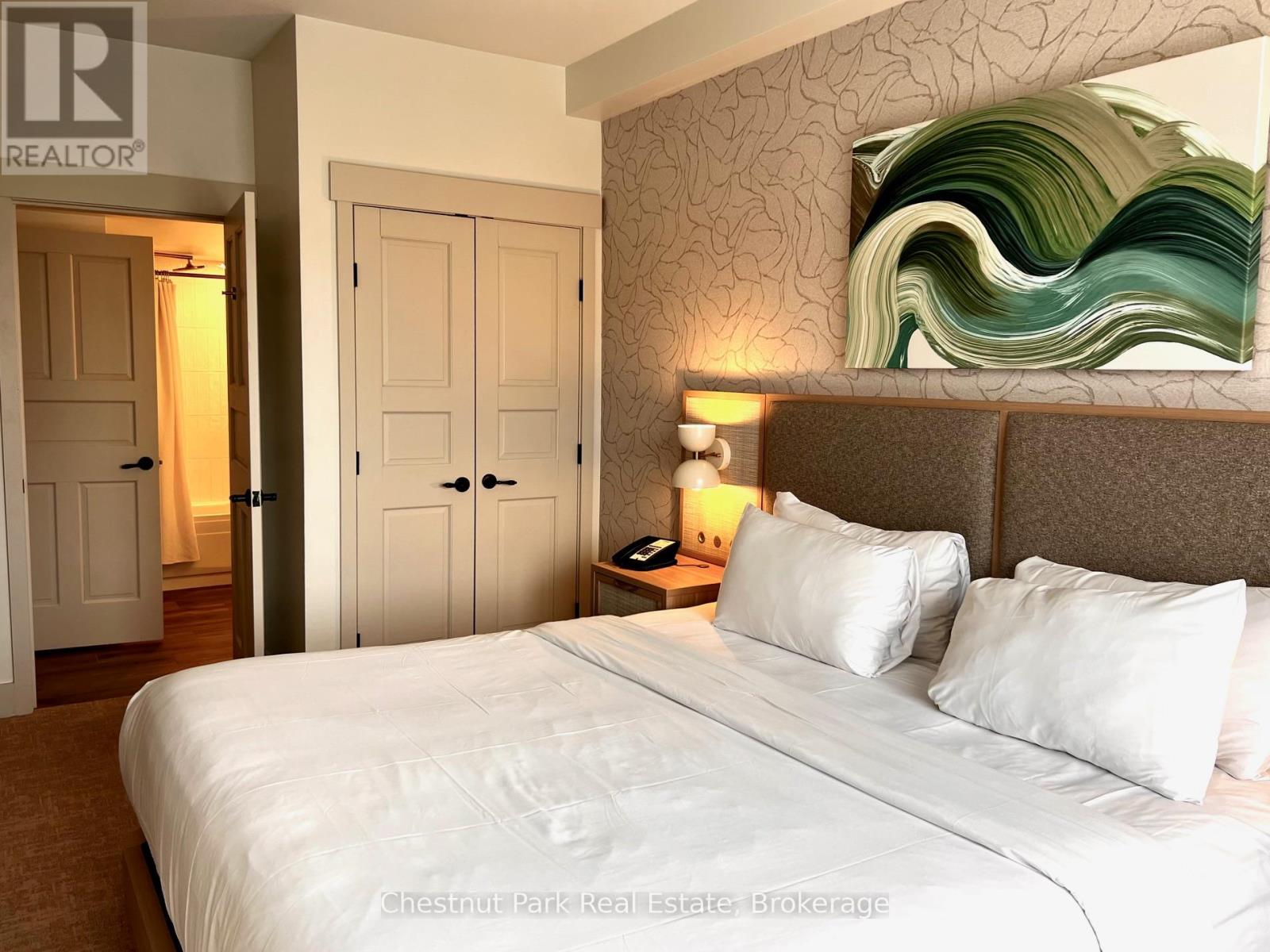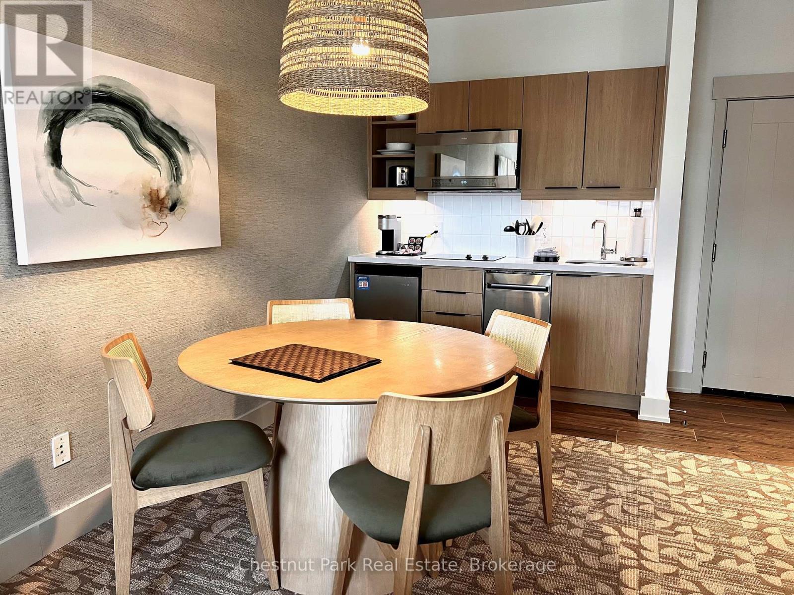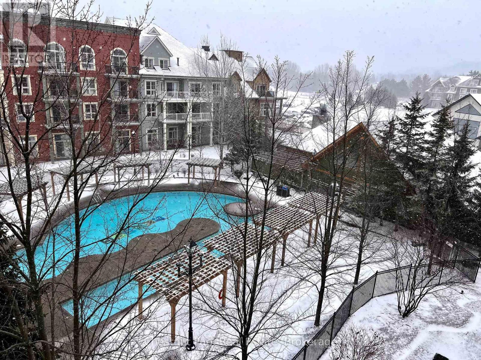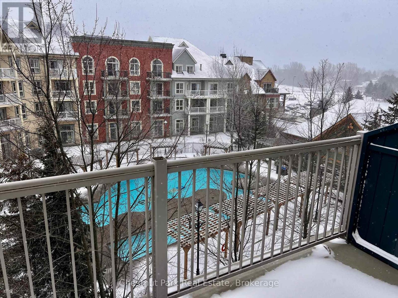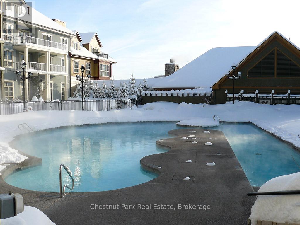 Top floor, desirable one bedroom, fully refurbished this past Fall, located in the popular boutique inspired Mosaic at Blue. Unit 412 is a rare find being one of only three of this specific type that has a full width balcony with two sets of sliding doors, one off the living room and the second from the bedroom. Step out to the fabulous private space that overlooks the courtyard. Pleasing views of the colourful year-round heated outdoor swimming pool, with adjoining lap pool plus a free style hot tub awaits you. As well, beautiful trees provide some privacy, and you have views across the Millpond and to the ski hills to the south. Pull on your Mosaic robe first thing in the morning and step outside your bedroom to check out the day or perhaps a nightcap while you admire the lit-up amenities. Additional amenities include an Owners Lounge off the Lobby, a well-equipped exercise room, and a sauna. Your turn-key resort home is complete with a beautifully remodeled bathroom, a kitchenette with 2 stove top burners, bar fridge and dishwasher, dining area, and gas fireplace in the cozy living room. This unit is currently in the fully managed Rental Program with Blue Mountain. Owners can personally use their getaway homes for up to 10 days per month if they wish or take advantage of revenue potential when not occupying it themselves. Mosaic's location next to the Conference Centre makes it a desirable choice for guests to stay when attending conferences. Extra benefits of Mosaic - Front desk is fully staffed, entrance to Sunset Grill off the elevator lobby, heated separate underground parking, bicycle storage and owner storage locker off the lobby. HST may be applicable. 2% BMVA Entry fee payable on closing. BMVA annual fees are $1.08 per sq. ft. per year. This four- season resort property is surrounded with exciting year round entertainment, fantastic dining and shopping options, and even a beautiful sandy private beach for the summer with a shuttlebus at your service. (id:64974)