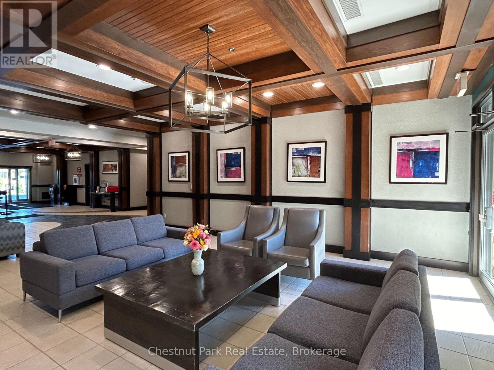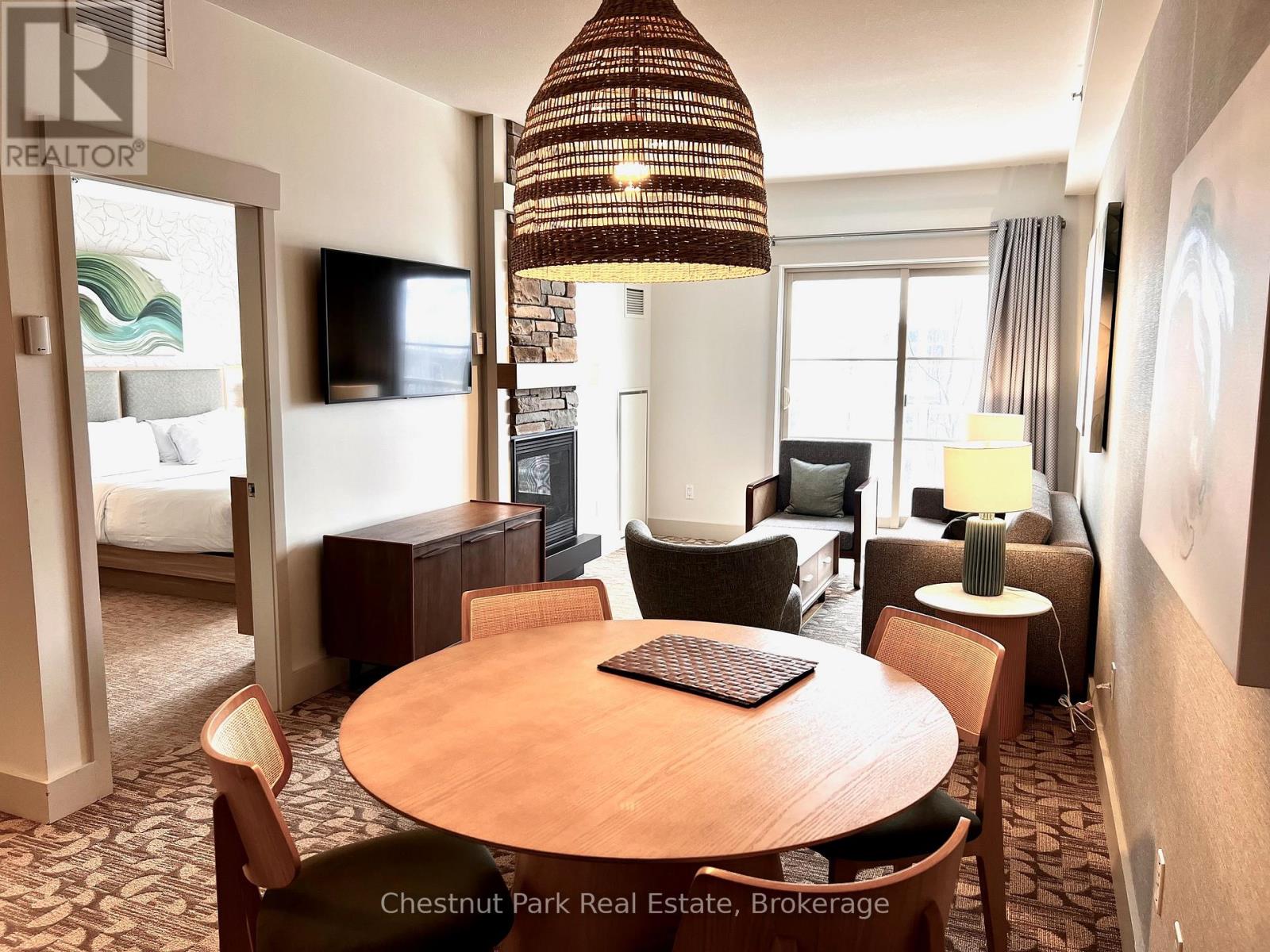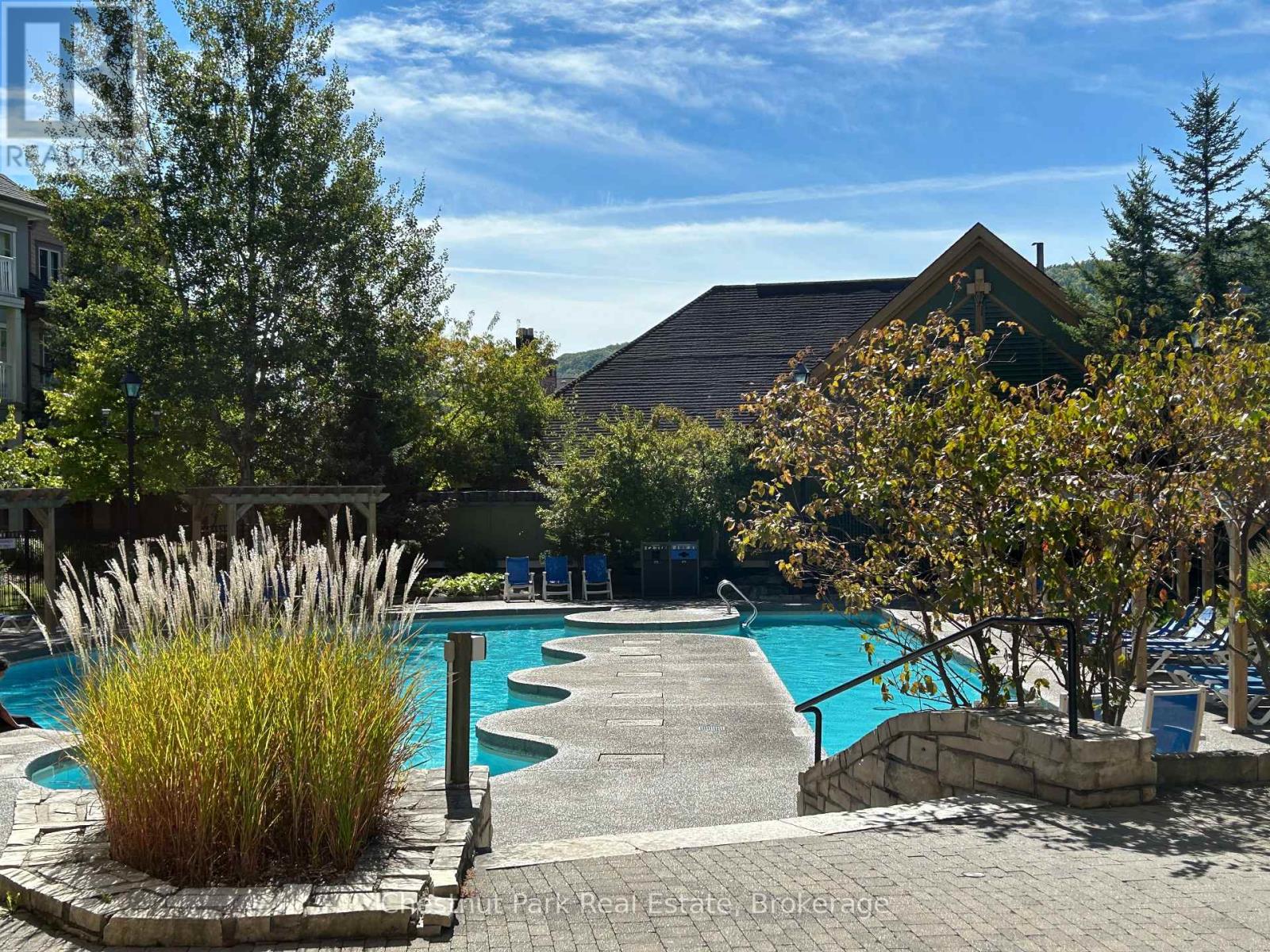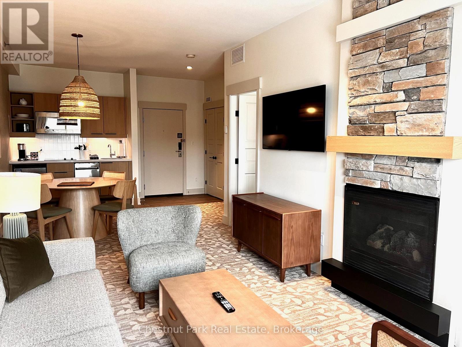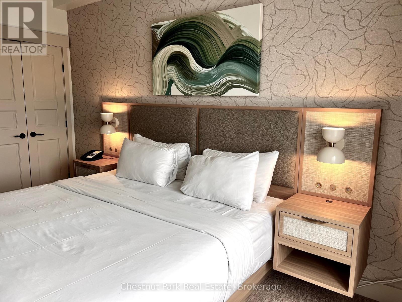 Top floor, desirable one bedroom, fully refurbished this past Fall, located in the popular boutique inspired Mosaic at Blue. Unit 412 is a rare find being one of only three of this specific type that has a full width balcony with two sets of sliding doors, one off the living room and the second from the bedroom. Step out to the fabulous private space that overlooks the courtyard. Pleasing views of the colourful year-round heated outdoor swimming pool, with adjoining lap pool plus a free style hot tub awaits you. As well, beautiful trees provide some privacy, and you have views across the Millpond and to the ski hills to the south. Pull on your Mosaic robe first thing in the morning and step outside your bedroom to check out the day or perhaps a nightcap while you admire the lit-up amenities. Additional amenities include an Owners Lounge off the Lobby, a well-equipped exercise room, and a sauna. Your turn-key resort home is complete with a beautifully remodeled bathroom, a kitchenette with 2 stove top burners, bar fridge and dishwasher, dining area, and gas fireplace in the cozy living room. This unit is currently in the fully managed Rental Program with Blue Mountain. Owners can personally use their getaway homes for up to 10 days per month if they wish or take advantage of revenue potential when not occupying it themselves. Mosaic's location next to the Conference Centre makes it a desirable choice for guests to stay when attending conferences. Extra benefits of Mosaic - Front desk is fully staffed, entrance to Sunset Grill off the elevator lobby, heated separate underground parking, bicycle storage and owner storage locker off the lobby. HST may be applicable. 2% BMVA Entry fee payable on closing. BMVA annual fees are $1.08 per sq. ft. per year. This four- season resort property is surrounded with exciting year round entertainment, fantastic dining and shopping options, and even a beautiful sandy private beach for the summer with a shuttlebus at your service. (id:64974)