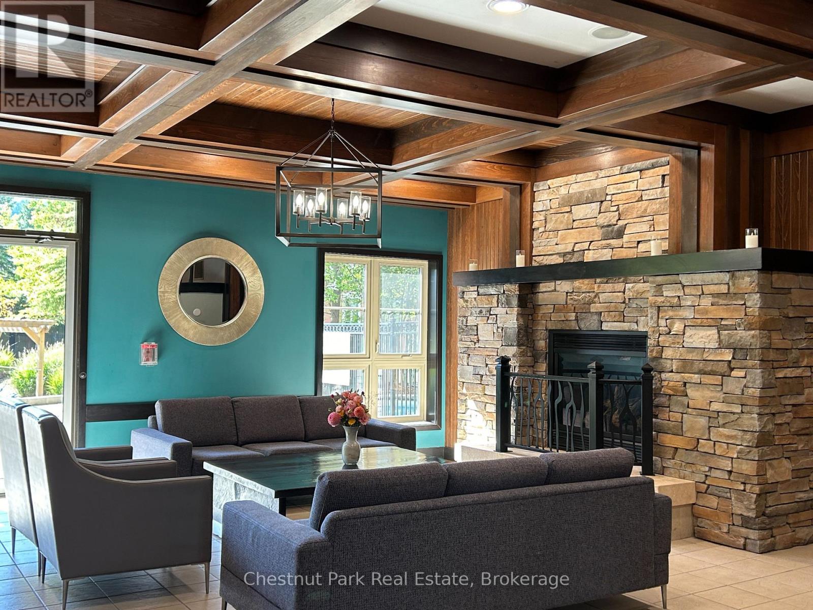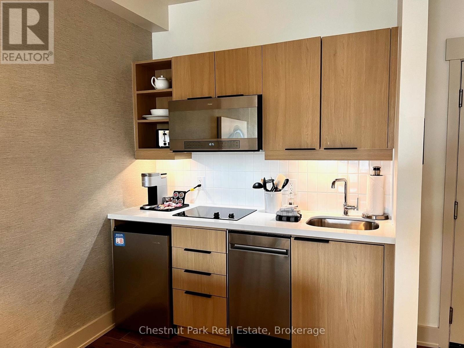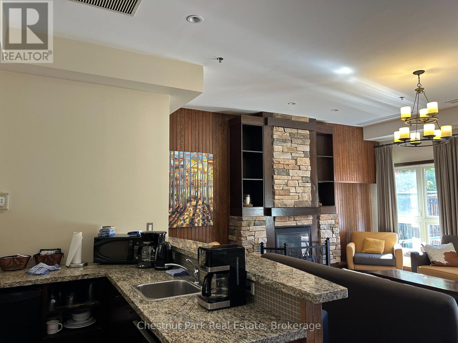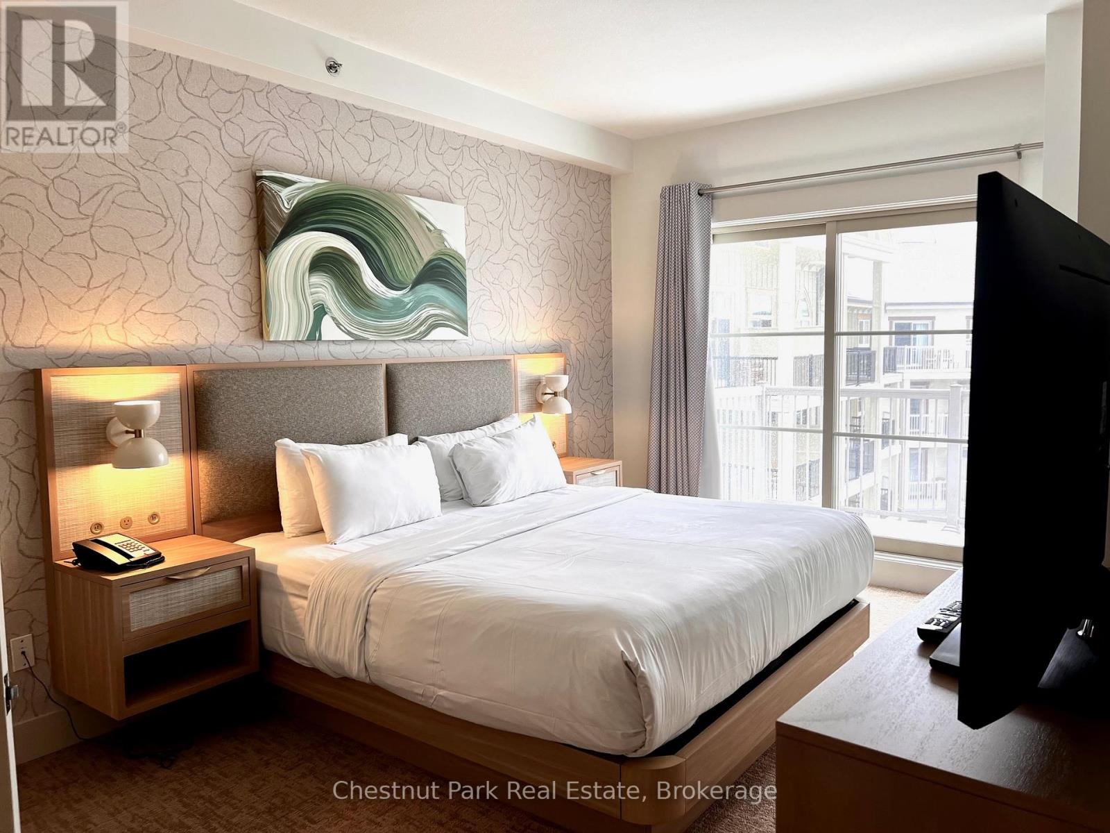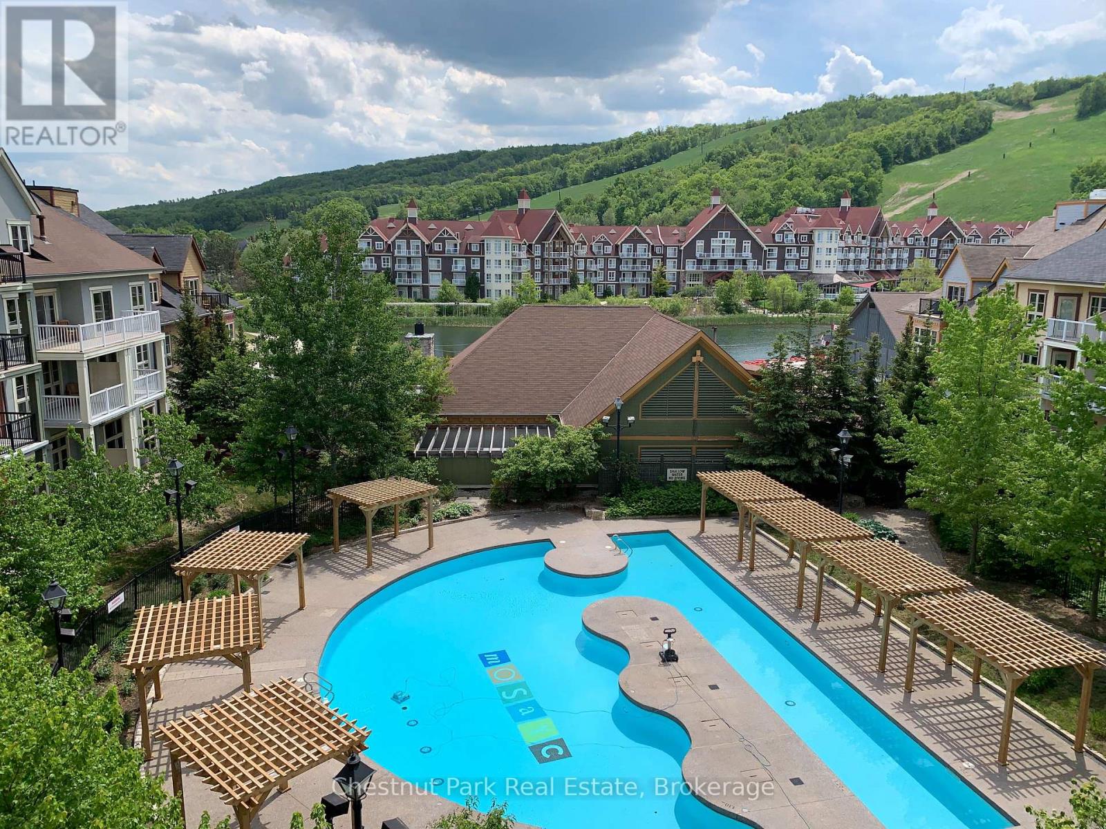 Top floor, desirable one bedroom, fully refurbished this past Fall, located in the popular boutique inspired Mosaic at Blue. Unit 412 is a rare find being one of only three of this specific type that has a full width balcony with two sets of sliding doors, one off the living room and the second from the bedroom. Step out to the fabulous private space that overlooks the courtyard. Pleasing views of the colourful year-round heated outdoor swimming pool, with adjoining lap pool plus a free style hot tub awaits you. As well, beautiful trees provide some privacy, and you have views across the Millpond and to the ski hills to the south. Pull on your Mosaic robe first thing in the morning and step outside your bedroom to check out the day or perhaps a nightcap while you admire the lit-up amenities. Additional amenities include an Owners Lounge off the Lobby, a well-equipped exercise room, and a sauna. Your turn-key resort home is complete with a beautifully remodeled bathroom, a kitchenette with 2 stove top burners, bar fridge and dishwasher, dining area, and gas fireplace in the cozy living room. This unit is currently in the fully managed Rental Program with Blue Mountain. Owners can personally use their getaway homes for up to 10 days per month if they wish or take advantage of revenue potential when not occupying it themselves. Mosaic's location next to the Conference Centre makes it a desirable choice for guests to stay when attending conferences. Extra benefits of Mosaic - Front desk is fully staffed, entrance to Sunset Grill off the elevator lobby, heated separate underground parking, bicycle storage and owner storage locker off the lobby. HST may be applicable. 2% BMVA Entry fee payable on closing. BMVA annual fees are $1.08 per sq. ft. per year. This four- season resort property is surrounded with exciting year round entertainment, fantastic dining and shopping options, and even a beautiful sandy private beach for the summer with a shuttlebus at your service. (id:64974)