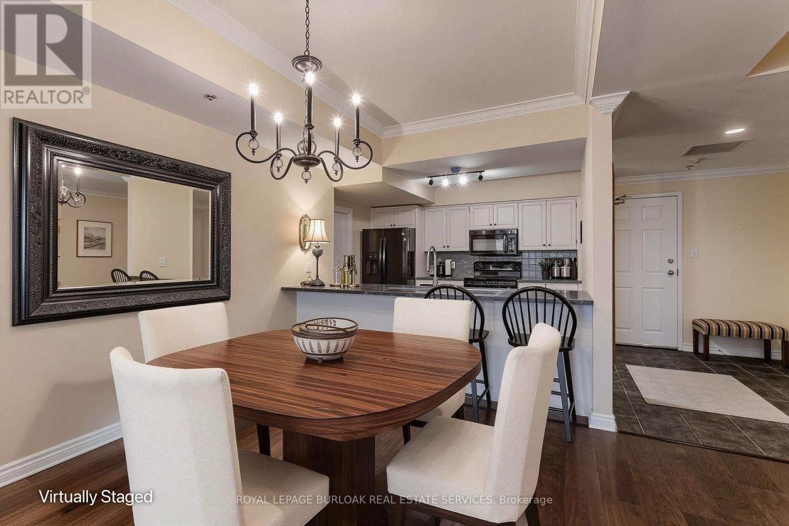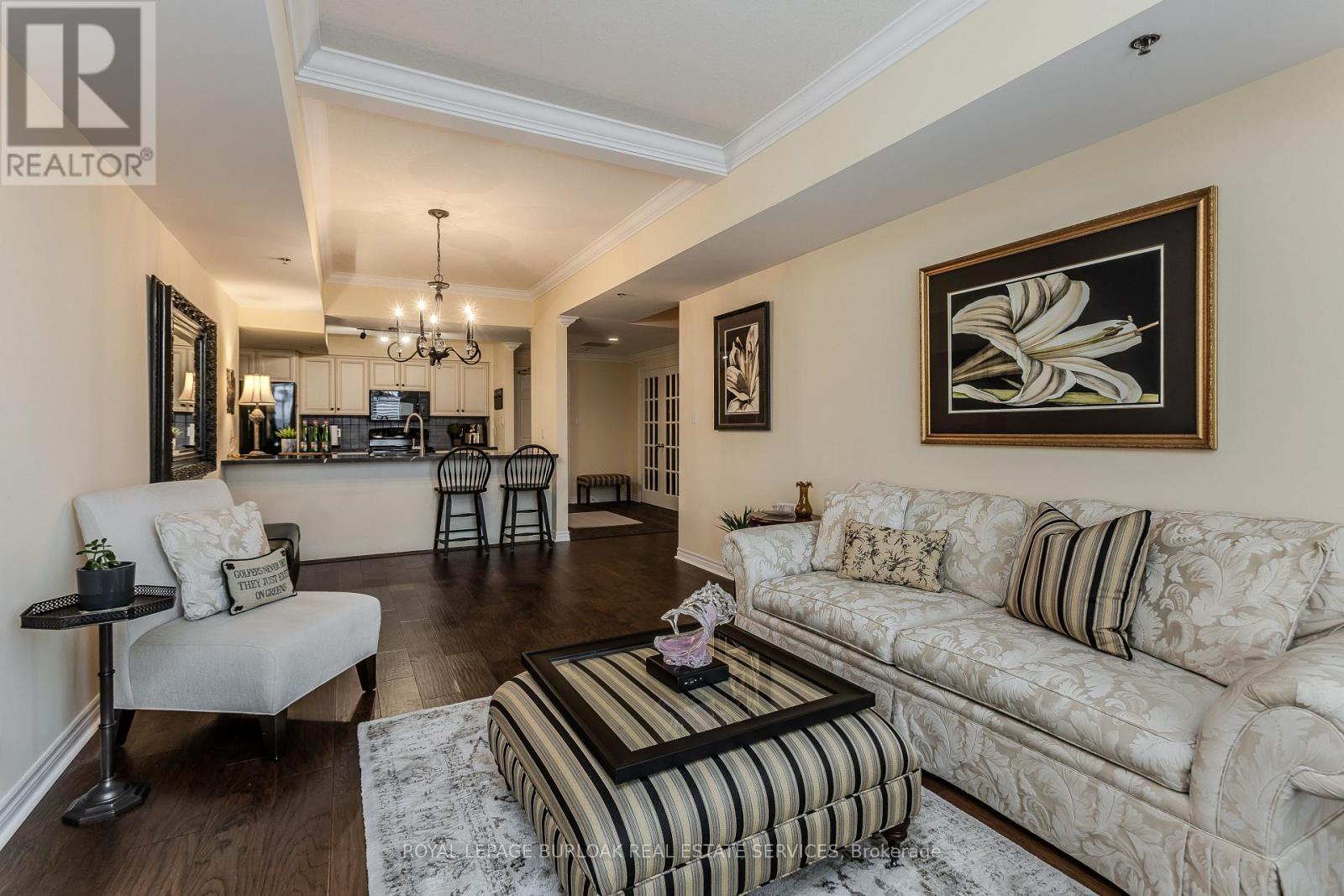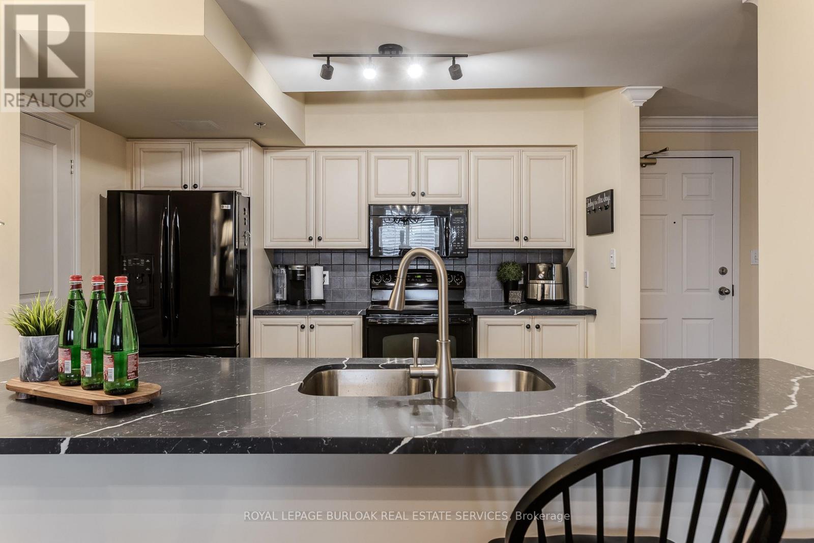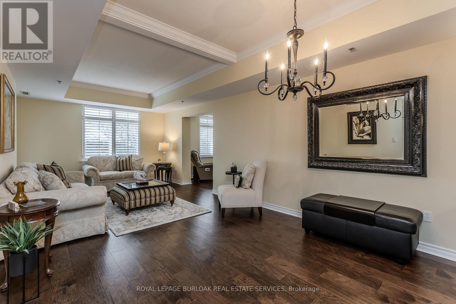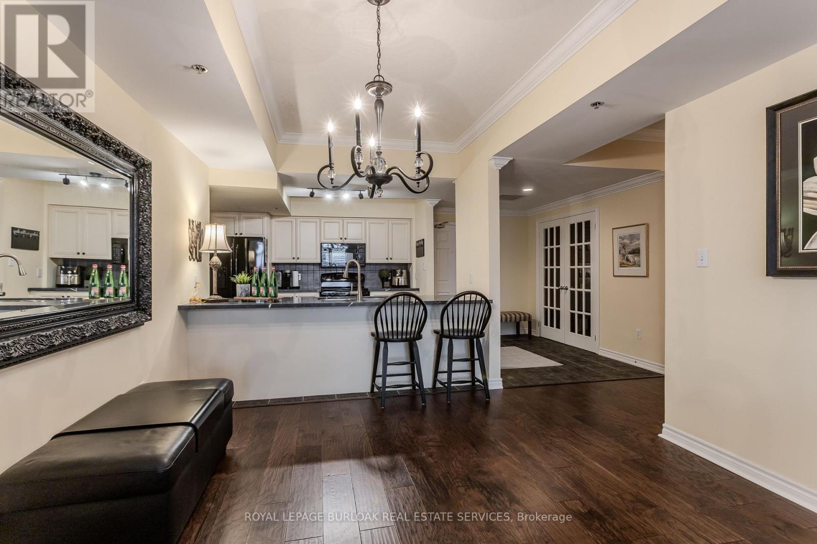 Welcome to this beautifully designed condo in The Dovercourt, a well-maintained low-rise building nestled in the sought-after Aldershot community. Offering one of the larger custom layouts in the building, this customized suite blends space, functionality, and style in a prime location-just mins to the GO Station, QEW, Royal Botanical Gardens, Burlington Golf & Country Club, and everyday amenities. Step inside to discover a bright and inviting open-concept layout, with hardwood flooring throughout the main living areas. The kitchen is a true focal point, featuring quartz countertops, an oversized breakfast bar perfect for casual dining or gathering with guests, a stylish tile backsplash, black stainless steel appliances, and ample cabinetry to meet all your storage needs. Overlooking the main living space, it connects beautifully to the dining and living areas. The spacious living room is filled with natural light and showcases a tray ceiling with a beam accent, along with walkout access to a private balcony. A versatile den offers the potential to convert into an additional bedroom, while a separate home office with French doors provides the ideal work-from-home setup. The primary bedroom is generously sized and designed as a private retreat, complete with dual closets and a well-appointed 3-piece ensuite featuring an oversized granite vanity and a walk-in shower. A second bedroom also offers direct access to the balcony, creating a bright and airy space for family or guests. A 4-piece main bathroom adds further convenience. Additional features include a storage locker and two parking spaces-one underground and one surface. Residents enjoy access to a party/media room within this well-managed building. This is a rare opportunity to own a spacious, move-in-ready condo with a flexible layout in one of Burlington's most convenient and connected locations-perfect for professionals, downsizers, or those seeking low-maintenance living without compromising on space. (id:64974)
