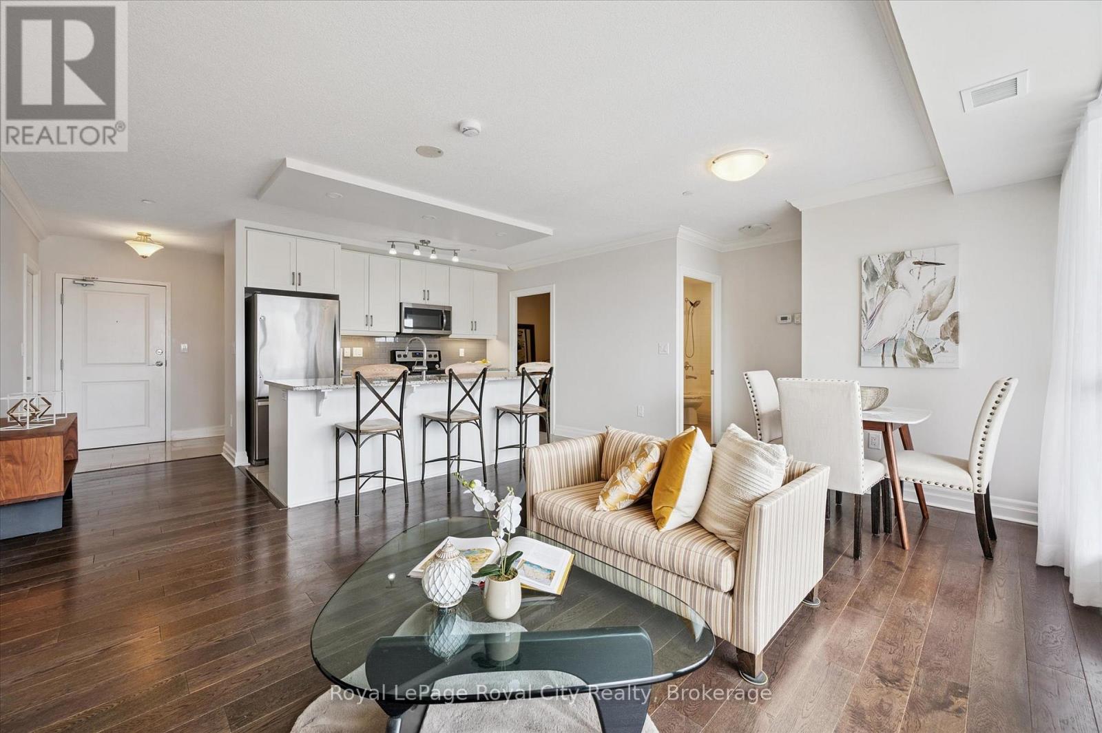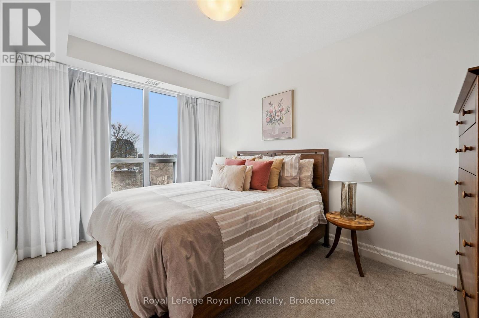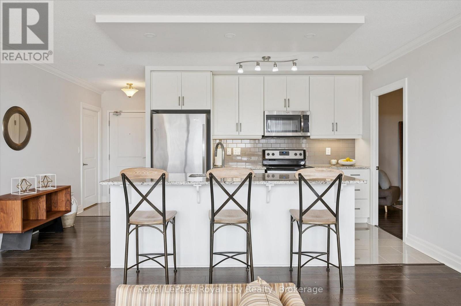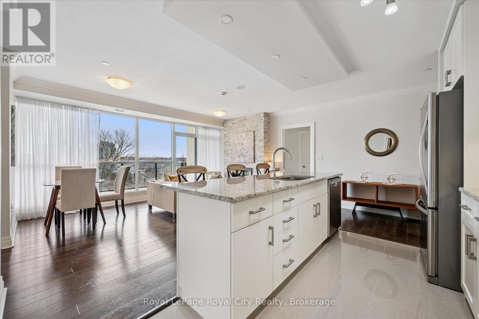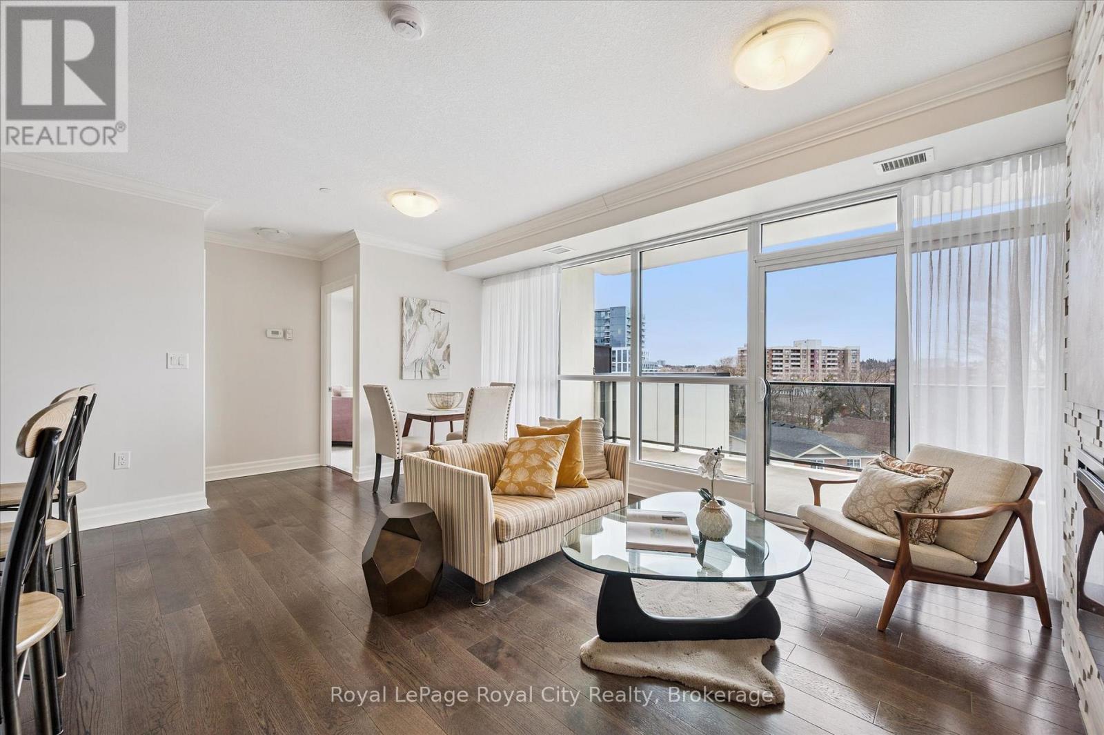 On Saturday at dawn, the kettle whistles in tune with the songbirds' chorus from the lush canopy covering this historic neighbourhood. Steaming mug in hand, they stand on the southeast-facing balcony and savour the stillness before the growing city stirs. Then they retreat to the sanctuary of their den, a versatile space they have made both a private library and media room. It provides calm and a sense of separation from the world's distractions. They need to plan tonight's dinner party! Living at River Mill means the car stays in secure underground parking because the city's best is available on foot. They stroll to the Guelph Farmers Market to gather fresh, local ingredients for their menu, and pick up special items at the boutique grocer a few blocks away. Homeward-bound, they pop into one of the clothiers on Old Quebec Street to buy a new jacket. Before prepping dinner, they decide whether to make a quick cycling trip along the Trans Canada Trail or hike through riverside paths connecting the heart of the city to nature. Their location is a cultural hub where they can readily walk to a gallery opening, visit the new central library, dine at top-end bistros, or catch a performance at the River Run Centre. For special events around the GTA, the nearby GO Station provides a reliable link for a day trip to Toronto. At home, they prepare savoury dishes and then arrange a table for six on their tiled terrace, the suite's crown jewel. They love this space, a private venue for alfresco dining on a lovely evening. River Mill offers a lifestyle that balances sophisticated indoor living and unfettered outdoor freedom. It is a retreat for those who want the vibrancy of a connected urban life without sacrificing the peace of a beautiful two-bedroom suite in a well-managed, friendly building with a terrace made for hosting. Here, Saturday feels like a getaway. This one ends with friendly banter against the soft glow of sunset over the university campus on the horizon. (id:64974)