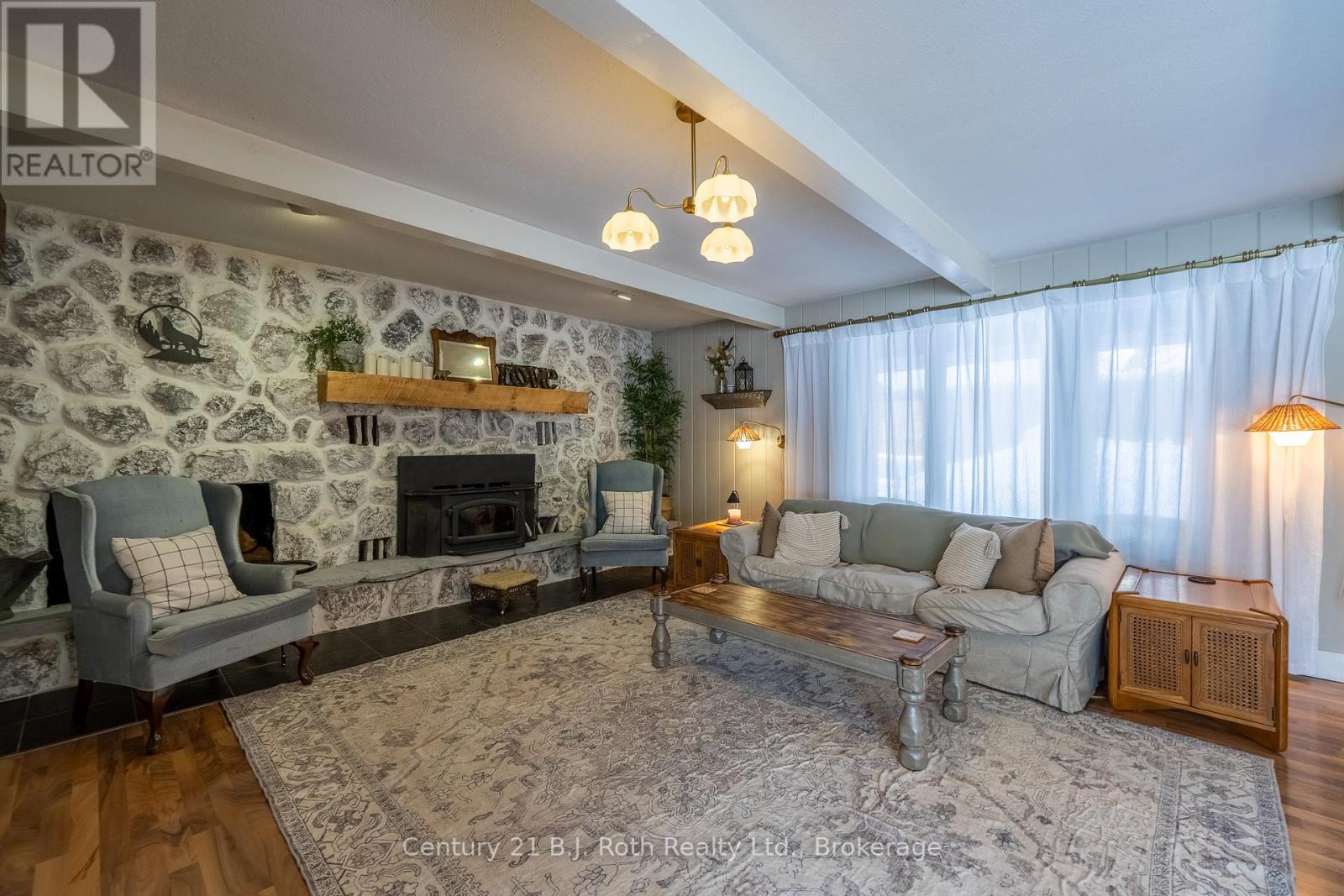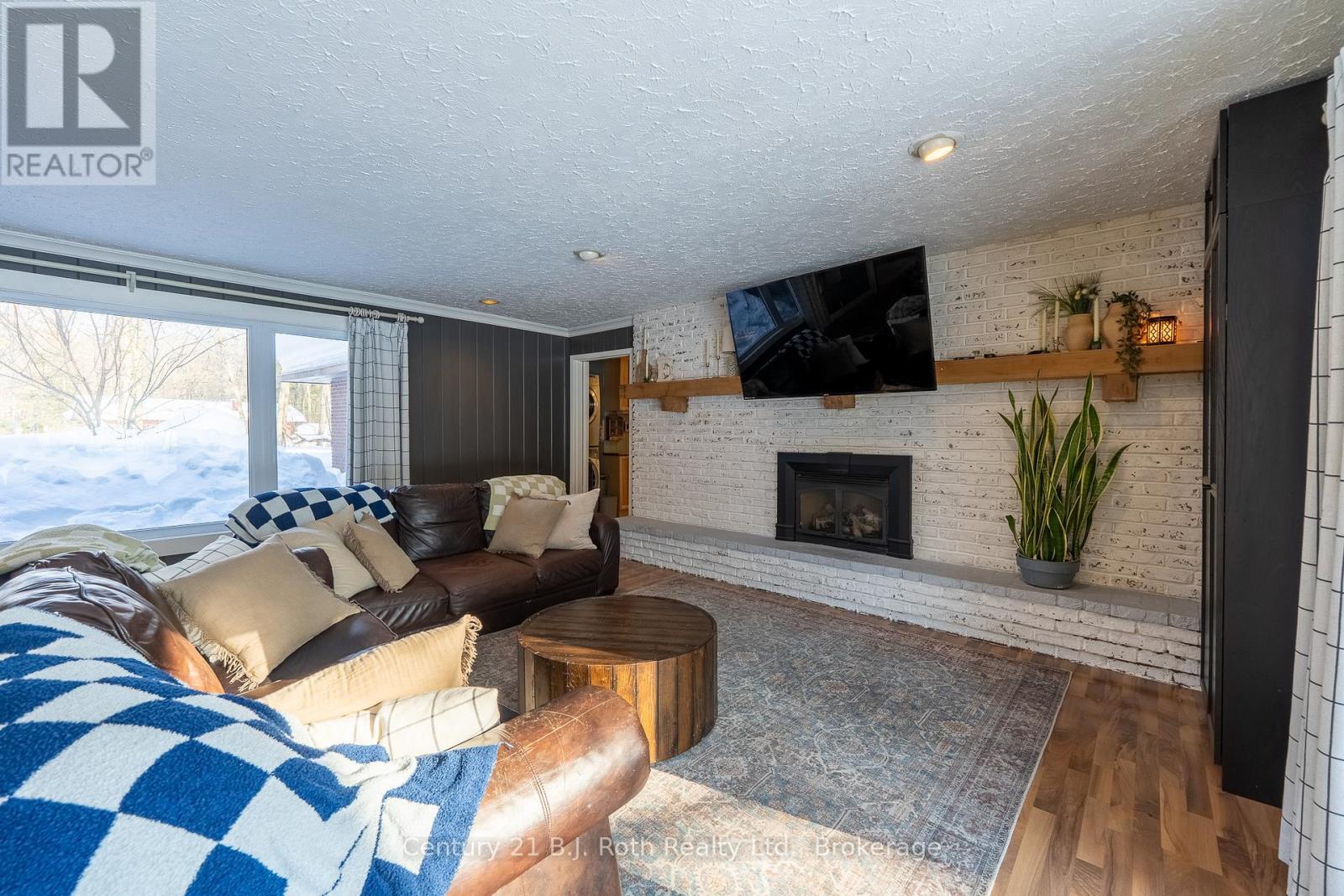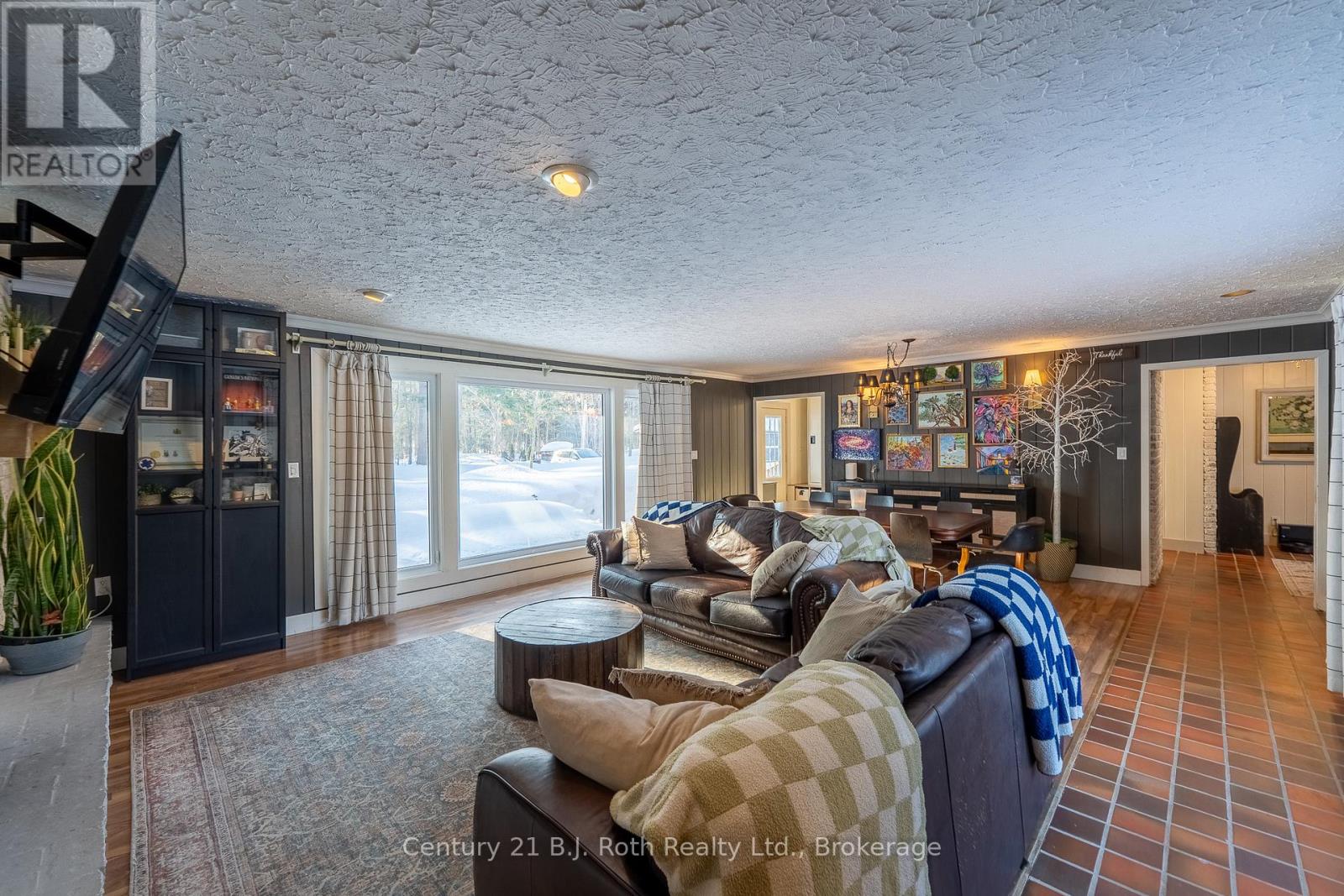 Tucked well back from the road this classic 1970's brick ranch offers nearly 2 acres of privacy in the heart of the highly sought-after Marchmont/Bass Lake community. With over 2,700 sq. ft. of thoughtfully designed main floor living, this home was built for families who value space, connection, & comfort. From the moment you arrive, the covered arched entry & private unistone courtyard set the tone. Step inside to bright, welcoming foyers at both the front & rear of the home - practical for busy family life & ideal for entertaining. A convenient 2-pc powder rm & walk-in pantry/storage closet add everyday functionality. At the centre of the home, the open-concept kitchen, dining, & family rooms create a natural gathering place. The kitchen offers generous cabinetry, granite counters, stainless appliances, & ample prep space, all flowing seamlessly into the dining area & family room. The woodstove anchors the space, adding warmth & charm, while large windows draw in natural light. When it's time to unwind, the separate living room offers a quieter retreat, complete with oversized windows front & back & a cozy gas fireplace. The layout thoughtfully separates the living spaces from the private bedroom wing featuring 4 spacious bedrooms, incl. a Primary suite tucked at the rear of the home w/a walk-through closet, private 4-pc ensuite & walkout to unistone patio. A fully renovated 5-pc bathrm w/dble vanity, & main floor laundry add convenience where families need it most. Full basement under 1/2 the home w/Rec.rm. w/Gas FP, Storage/Utility rm. w/direct walk up access to the side yard. Backing onto township-owned open space, the yard feels endless; perfect for kids & pets! Detached 35'5" x 27' oversized double garage (with newly built roof) provides exceptional storage and workspace flexibility. 2 Gas Furnaces & central air units recently replaced. Minutes to amenities, in an excellent school district, & within one of Severn's most desirable areas. (id:64974)