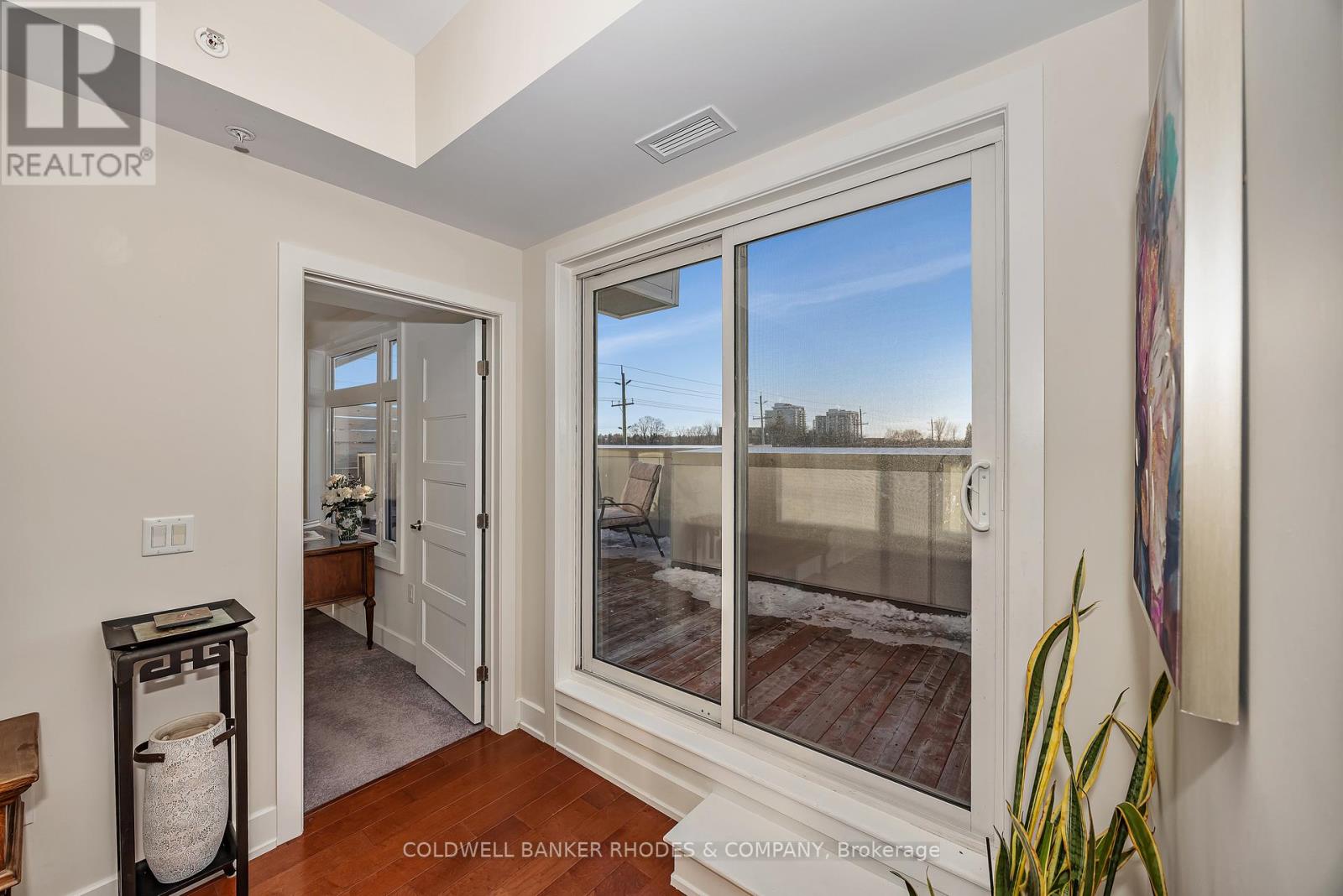 Perched on the top floor with western exposure, this sun-filled corner unit offers exceptional light, privacy and airy living space! Featuring approximately 1034 sq ft of interior space plus over 450 sq ft of exterior space , this generously proportioned 2 bedroom, 2 full bathroom unit offers windows on two sides, soaring ceilings, and warm hardwood floors flowing throughout the inviting main living space. With generous cupboard space and a centre island, the functional kitchen anchors the unit and provides easy access to the secondary balcony with gas BBQ line. The adjoining living and dining area is bright and welcoming, easily accommodating comfortable furnishings for relaxing or hosting friends. This space extends to a roomy west-facing terrace-perfect for sunset lounging, al fresco meals, and container gardening. The primary bedroom offers ample proportions, roomy walk-in closet and a 3 piece ensuite bath with walk in shower. Situated on the opposite end of the unit, the second bedroom provides flexibility for guests or a home office. This room benefits from a large closet and ensuite access to the main 4 piece bathroom, also accessed from the main foyer. Cross-breezes, sky views, and the quiet of a top-floor position enhance everyday comfort, with the thoughtful layout maximizing both openness and function. In suite laundry, underground heated parking and storage locker. With rare expansive outdoor space, abundant natural light, and a refined yet relaxed atmosphere, this residence delivers elevated condo living in a sunsplashed setting. Within close proximity of amenities, transit, shopping, Queensway Carleton Hospital, as well as nearby access to both 416 and 417, this welcoming unit boasts the perfect combination of lifestyle and convenience within close proximity of everyday essentials! (id:64974)