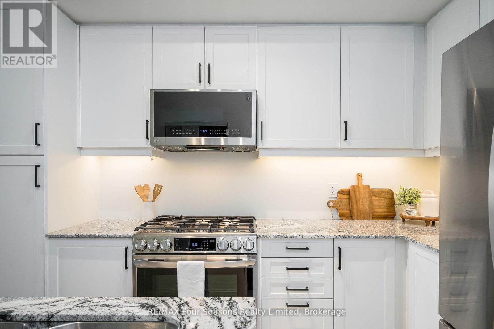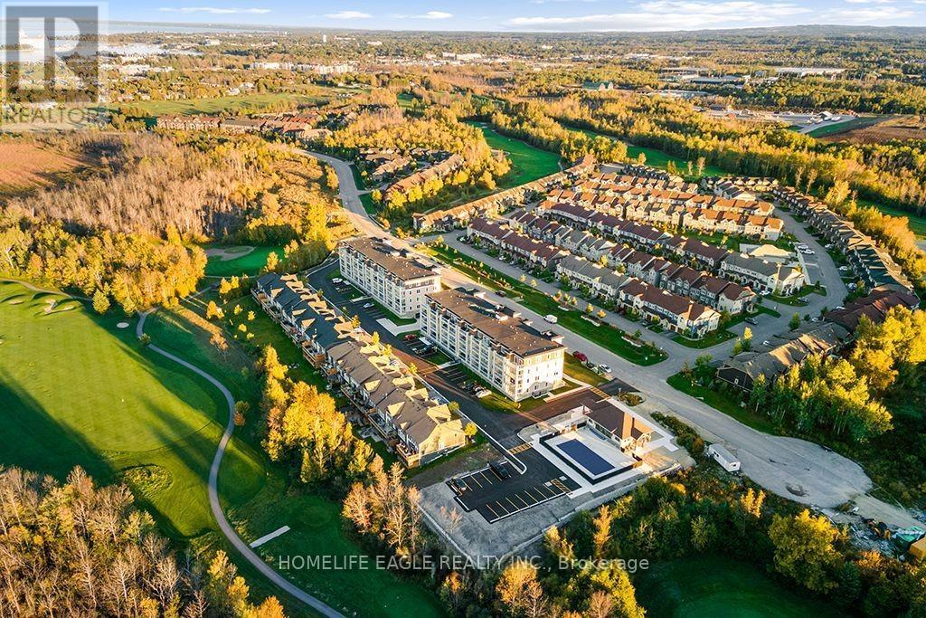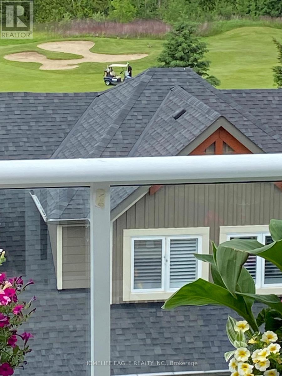 The View - this brand new building in the Cranberry Golf Course community doesn't need an introduction. Top-floor unit with breathtaking views of the golf course and Blue Mountain. This 887 sq. ft. suite features 2 spacious bedrooms, 2 full bathrooms, and a large 17' x 8' terrace balcony with glass railings, BBQ gas line, water bib, light fixture, and electrical outlet - ideal for four-season living. The unit offers upgraded flooring in the main living areas, 9-foot ceilings, smooth ceilings in the kitchen and bathrooms, and California knockdown ceilings throughout. The gourmet kitchen includes granite countertops, under-cabinet lighting, an upgraded under-mount stainless steel sink, gas stove, venting microwave, and brand-new appliances. The primary bedroom features a walk-in closet and ensuite with granite countertop, while the second bedroom includes a regular closet and its own ensuite with granite countertop and a glass walk-in shower. Additional features include an oversized attached storage locker next to the entry door and one indoor parking space. Amenities include an outdoor pool, clubhouse, and gym. Enjoy true bungalow-style, one-level living with self-controlled heating and air conditioning, plus an open-air terrace balcony that feels like a private backyard in the sky. (id:64974)