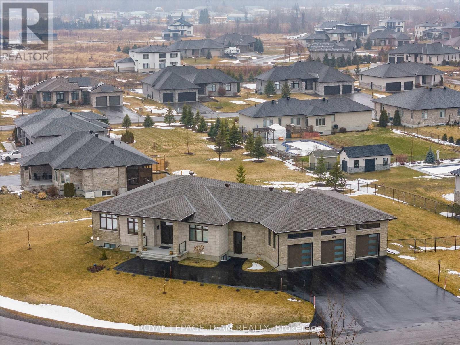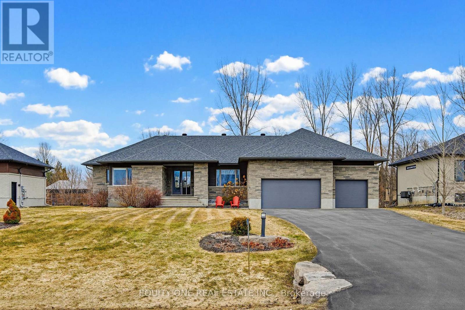 Welcome to this spectacular 4+1 bedroom, 4 bathroom bungalow in the highly sought-after Lakewood Trails community of Greely where modern luxury meets peaceful estate living. Built by Mackie Homes, this beautifully designed residence offers exceptional craftsmanship, thoughtful upgrades, and an ideal layout. The main level features a bright, open-concept design anchored by a stunning great room with a cozy natural gas fireplace, seamlessly flowing into a designer kitchen with quality cabinetry, stone countertops, and generous prep space ~ perfect for hosting family and friends. Designed for privacy, the primary suite is set on one side of the home, offering a peaceful retreat complete with his & hers walk-in closets and a luxurious ensuite featuring a freestanding soaker tub, glass shower, and heated floors. On the opposite side of the home, you'll find three additional well-sized bedrooms and a full bathroom-ideal for family living or guests. A spacious mudroom with built-in cabinetry provides excellent everyday storage and organization, while the main floor laundry room adds convenience and functionality.The fully finished lower level expands your living space with a large recreation area, dedicated exercise space, additional bedroom, and full bathroom. A separate theatre room with a second gas fireplace creates the perfect setting for movie nights and entertaining ~ ideal for multi-generational living or a private retreat. Car enthusiasts and families alike will appreciate the heated oversized 3-car garage, complete with built-in shelving for storage and direct access to the basement ~ an incredibly practical feature. Storage is abundant throughout the home, making it easy to stay organized and clutter-free. Outside, enjoy a beautifully landscaped backyard, rear patio, and upgraded exterior featuring stone and brick finishes, all set within one of Greely's most desirable communities featuring a community rec centre, pool and gym. Association fee of $400/year. (id:64974)