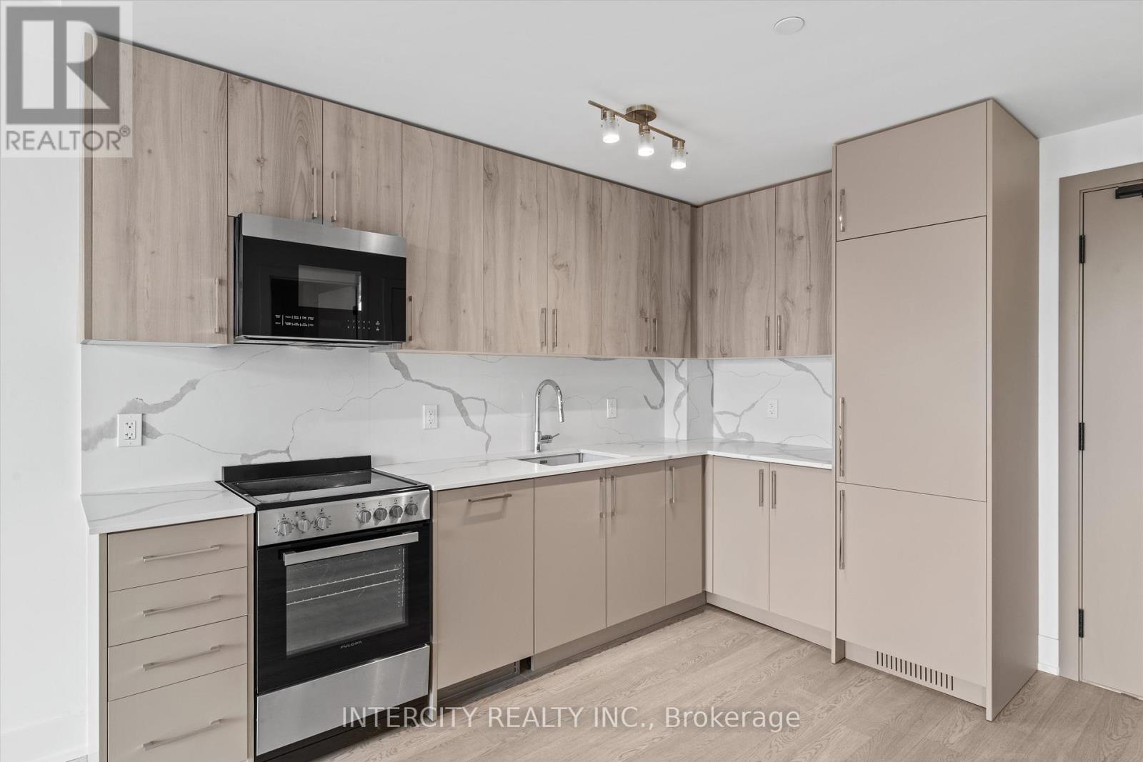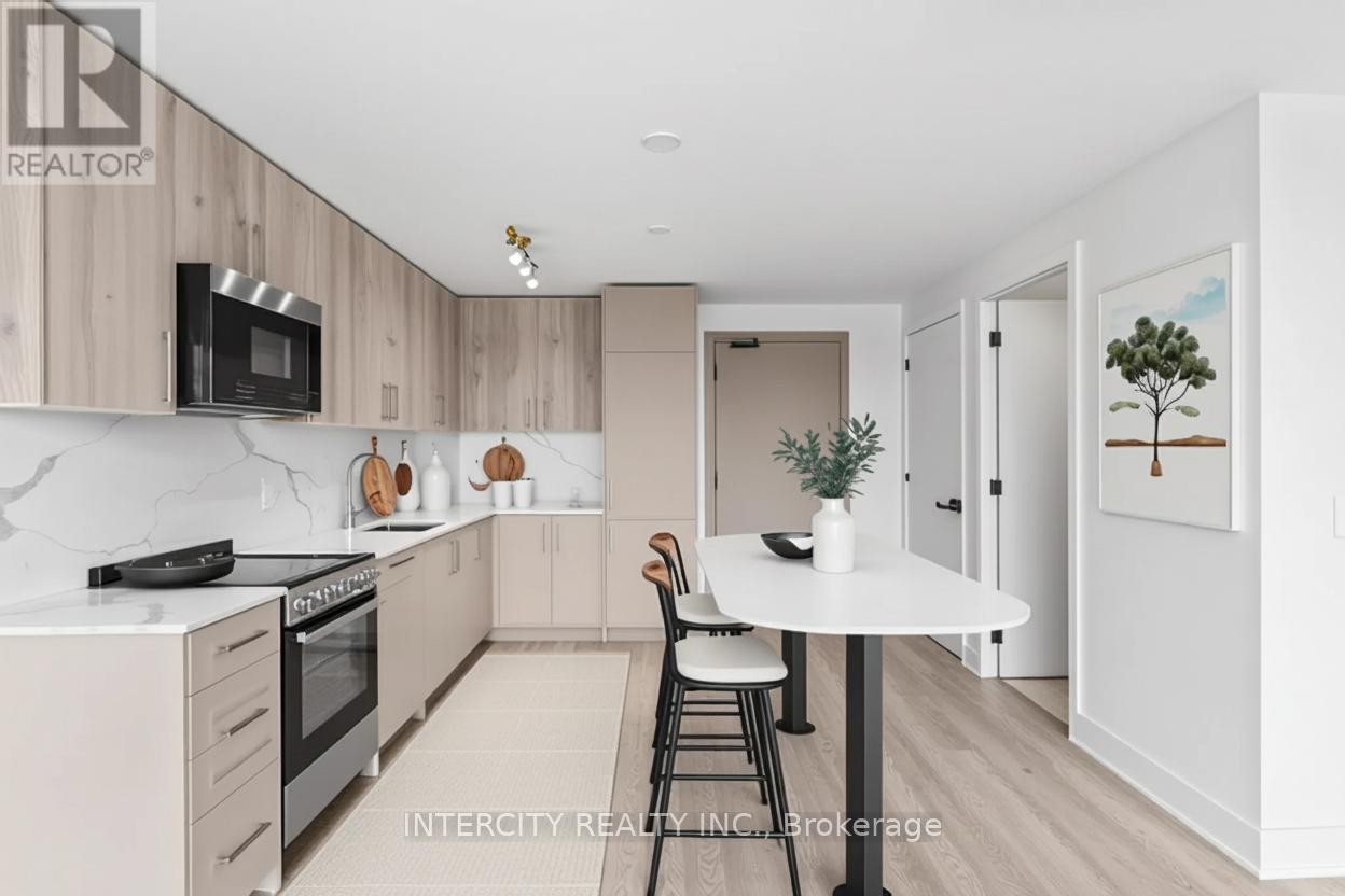Welcome to Suite 417, a stylish west-facing 612 sq. ft. residence designed for modern living. With its smart open-concept layout and sunset-facing views, this Suite combines everyday comfort with contemporary elegance. The sleek kitchen features quartz countertops, integrated appliances, and modern cabinetry, flowing seamlessly into the bright living and dining area. The primary bedroom offers a peaceful retreat, while the versatile den provides the perfect space for a home office or guest area. A well-appointed bathroom completes the suite with clean, sophisticated finishes. As a resident of King Terraces, you'll enjoy access to resort-style amenities, including a rooftop terrace, outdoor pool, fitness centre, stylish lounge, and 24-hour concierge. Suite 417 is perfect for those seeking style, convenience, and sunset living. With top-rated schools, parks, shopping, and dining just minutes away, everything you need is right at your doorstep. King Terraces is a welcoming community, ideal for families, young professionals, or anyone seeking a peaceful yet vibrant atmosphere. This is where you can create memories, build your future, and truly live your best life. (id:64974)