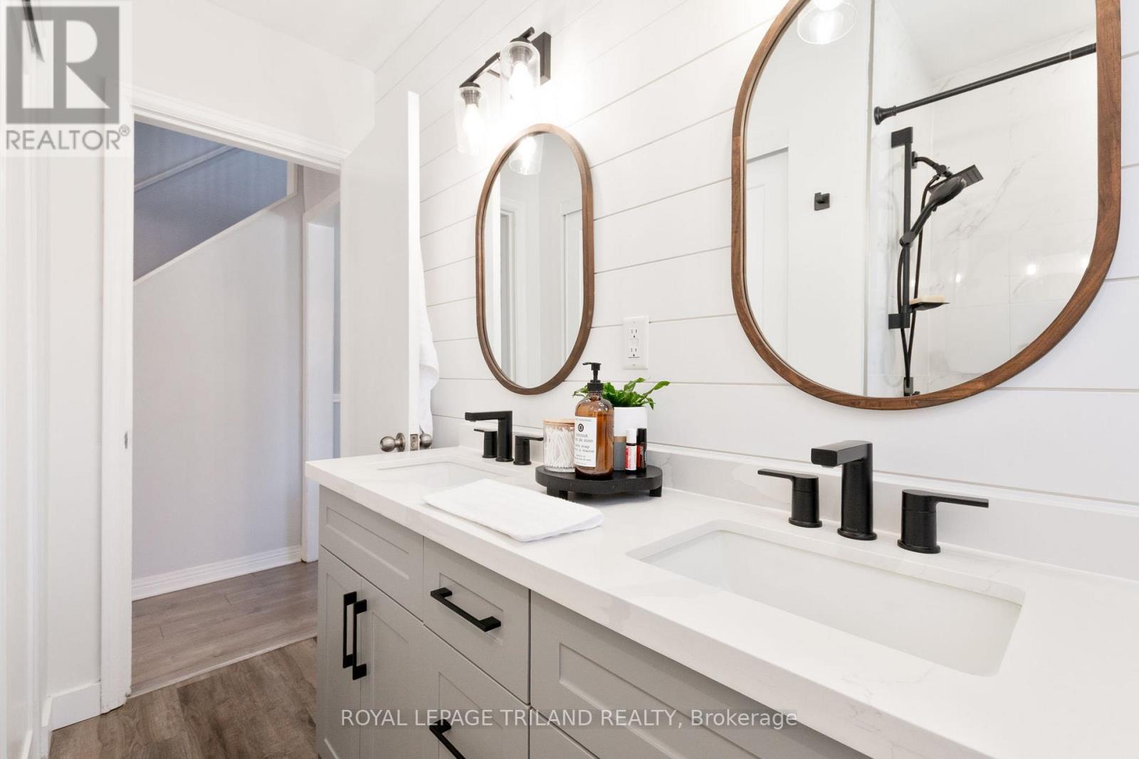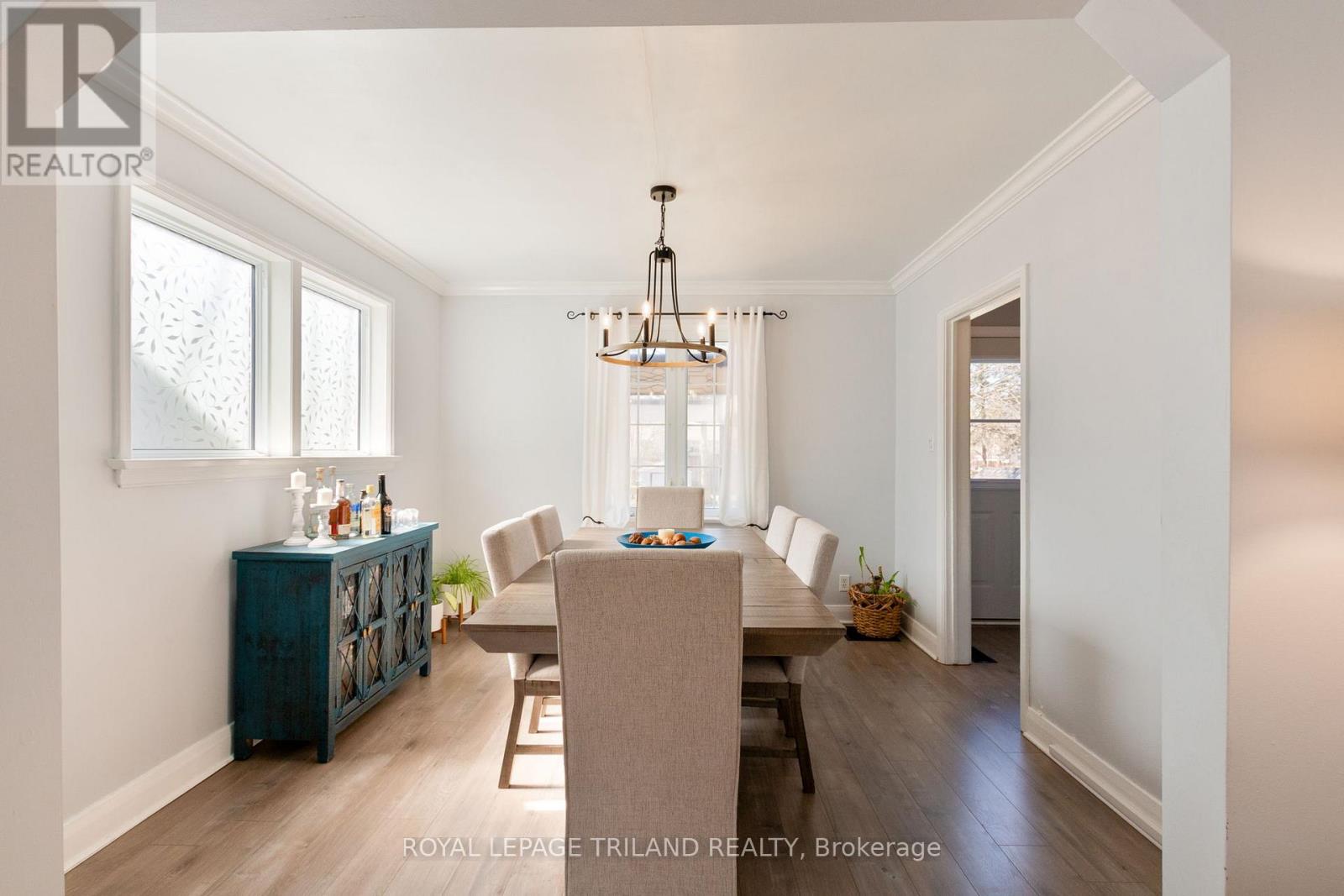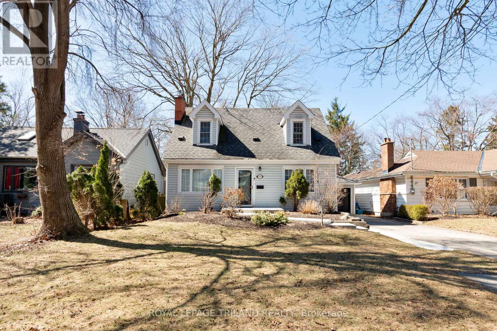 Welcome to 417 Byron Blvd, a charming 1.5 storey Cape Cod style home in the heart of Byron. Built in 1950, this property sits on an impressive 50 x 187 ft lot, approximately 0.215 acres, offering exceptional space and future potential for renovation or expansion if required. Surrounded by mature trees, the expansive backyard is perfect for gardening, entertaining, or letting kids and pets play. The property features parking for 5+ vehicles, a detached single car garage built in 2016, and a recently updated concrete walkway and front porch completed in 2025. Inside, the front entry opens to a bright formal living room with a gas fireplace and large front and side windows. The adjoining dining room is also filled with natural light, creating a warm and inviting space for gatherings. The main floor includes a versatile third bedroom (also ideal as a home office or playroom), along with a spacious galley style kitchen featuring updated white cabinetry, ample storage, and prep space. A fully updated 5 piece bath with dual sinks and a tiled tub/shower adds both style and function. The entire main floor is finished in updated laminate flooring. Just off the kitchen, step out to the large sundeck built in 2010, perfect for summer entertaining and BBQs. Upstairs offers two generously sized bedrooms with recently replaced carpeting, providing comfortable and private spaces ideal for family living. The lower level is partially finished with a rec room, fourth bedroom, 3 piece bath, laundry, and plenty of storage. Notable updates include shingles in 2019 and furnace in 2012. Located in one of Byron's most sought after communities, this home is just minutes to top rated schools, shopping, restaurants, and the natural beauty of Springbank Park with its scenic trails along the Thames River. Enjoy the perfect blend of a quiet, established neighbourhood with convenient access to all amenities. (id:64974)