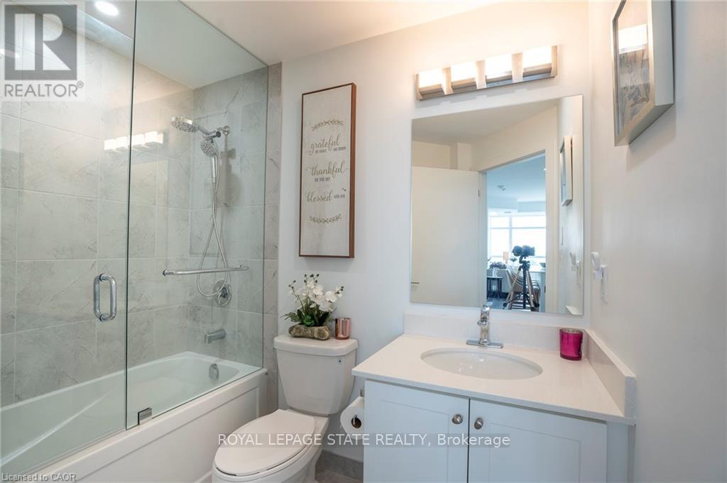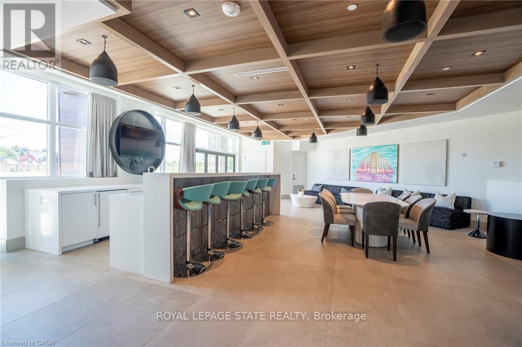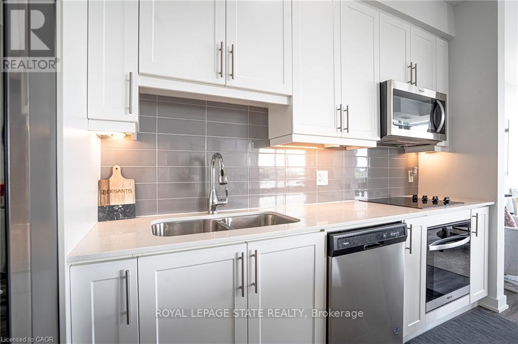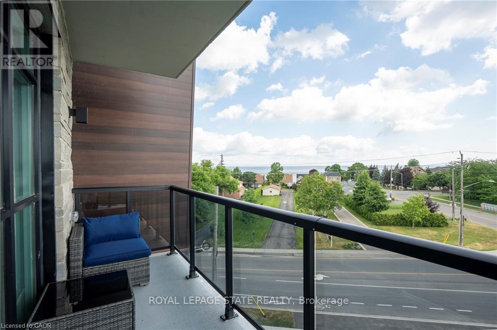Nestled along the pristine shores of Lake Ontario in the heart of Stoney Creek, this exceptional 2-bedroom, 2-bathroom corner suite at Como delivers a rare blend of style, space, and panoramic lakefront views - including the breathtaking Toronto skyline. Offering 1,238 square feet of meticulously designed interior space, this residence exudes modern elegance with 9-foot smooth ceilings and luxury vinyl plank flooring throughout. Flooded with natural light and boasting two full balconies, this suite is perfectly positioned to capture unobstructed lake views from virtually every angle. The gourmet kitchen is a showstopper, equipped with quartz countertops, a center island, stylish backsplash, under-cabinet lighting, and premium stainless steel appliances, including a French door fridge, wall oven, built-in cooktop, microwave, and dishwasher. Thoughtfully designed slow-close cabinetry elevates both function and finish. The spacious primary bedroom is a private retreat, featuring a walk-in closet, dual sinks, and a spa-like ensuite with glass shower, plus direct balcony access where morning coffee meets lakeside serenity. Custom roller shades offer privacy without compromising the view. Additional features include a heat pump (rental at $69.59/month), ensuring year-round comfort with energy efficiency. As a resident of Como, you'll enjoy access to exceptional amenities: a media room, party room, a rooftop terrace-ideal for entertaining or relaxing while soaking in the sweeping lake and skyline vistas. With every detail curated for comfort and sophistication, Suite 418 is more than just a home - it's a lifestyle. Don't miss your opportunity to own one of Como's most desirable lake-facing units. (id:64974)