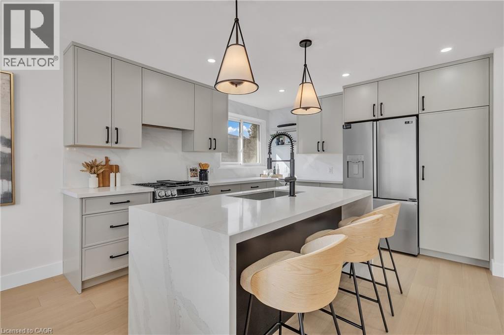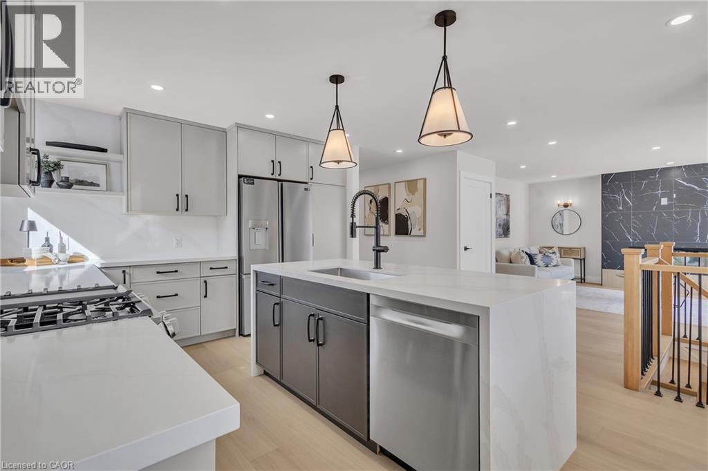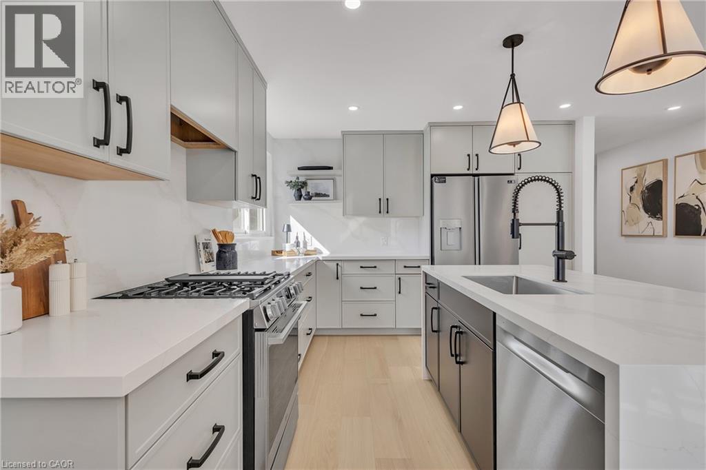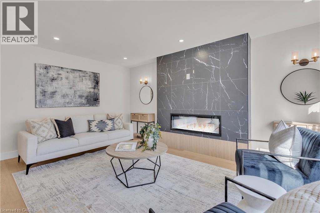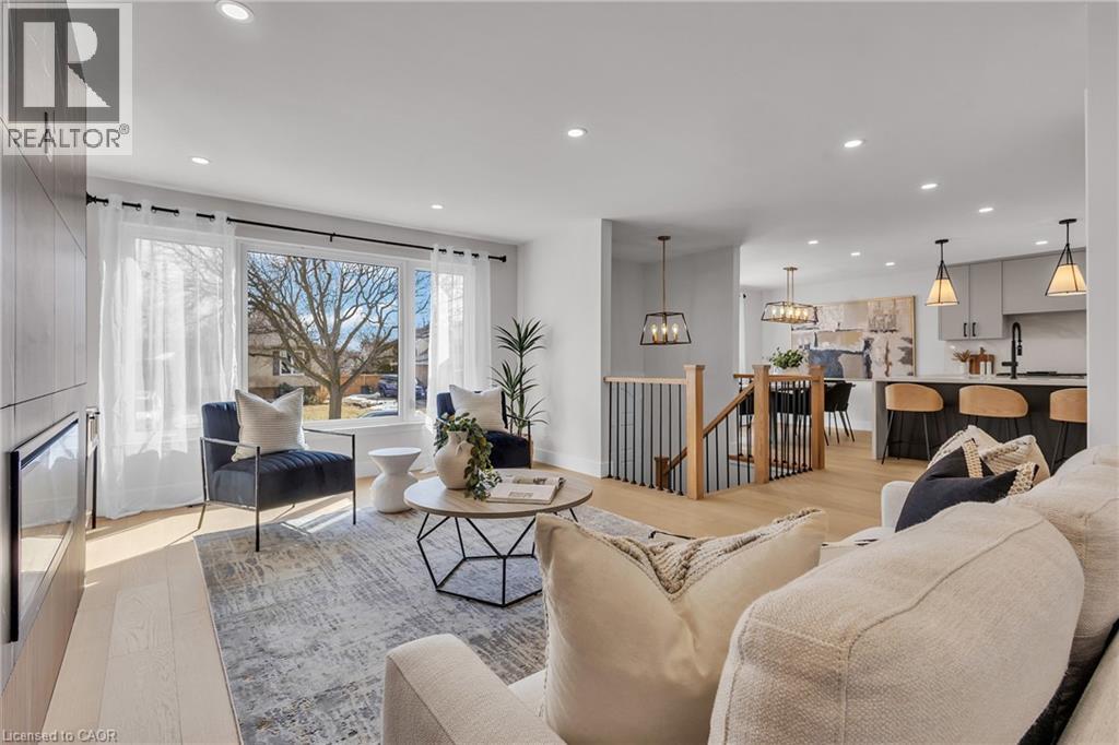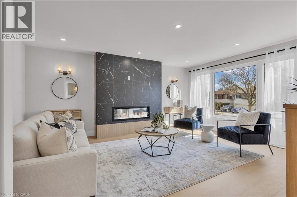 Welcome to 4185 Sutherland Crescent — a fully renovated raised bungalow in the heart of Burlington’s desirable Longmoor neighbourhood. Thoughtfully redesigned from top to bottom, this 3+1 bedroom, 3-bath home offers the ideal blend of refined finishes and versatile living space. The open-concept main level is designed for connection and entertaining, anchored by a two-tone contemporary chef’s kitchen featuring an oversized island, stainless steel appliances, and seamless flow into the dining area. Engineered hardwood flooring, pot lights, and curated designer finishes create a bright, cohesive aesthetic throughout. The spacious family room with a sleek electric fireplace provides a warm and inviting gathering space, while the primary suite offers a private retreat complete with a spa-inspired 3-piece ensuite and custom glass shower. A beautifully appointed 4-piece main bath showcases elevated finishes and thoughtful design. The fully finished lower level expands the home’s functionality with a sunlit recreation room highlighted by a gas fireplace, an additional bedroom, full bathroom, and a secondary kitchen with walk-up access to the rear patio. Ideal for multi-generational living, guests, teenagers, this level adds exceptional flexibility rarely found in homes of this caliber. Outside, the landscaped backyard with interlock patio creates the perfect setting for summer entertaining, family gatherings, or quiet evenings outdoors. Situated on a quiet, tree-lined crescent near top-rated Nelson High School, parks, shopping, GO Transit, and convenient QEW access, this turnkey property delivers luxury, utility, and location — perfectly suited for families who value both style and substance. (id:64974)