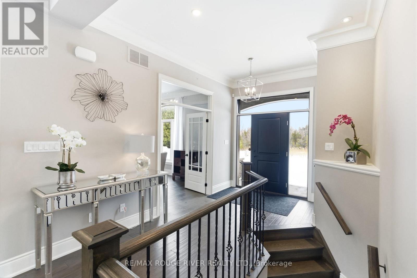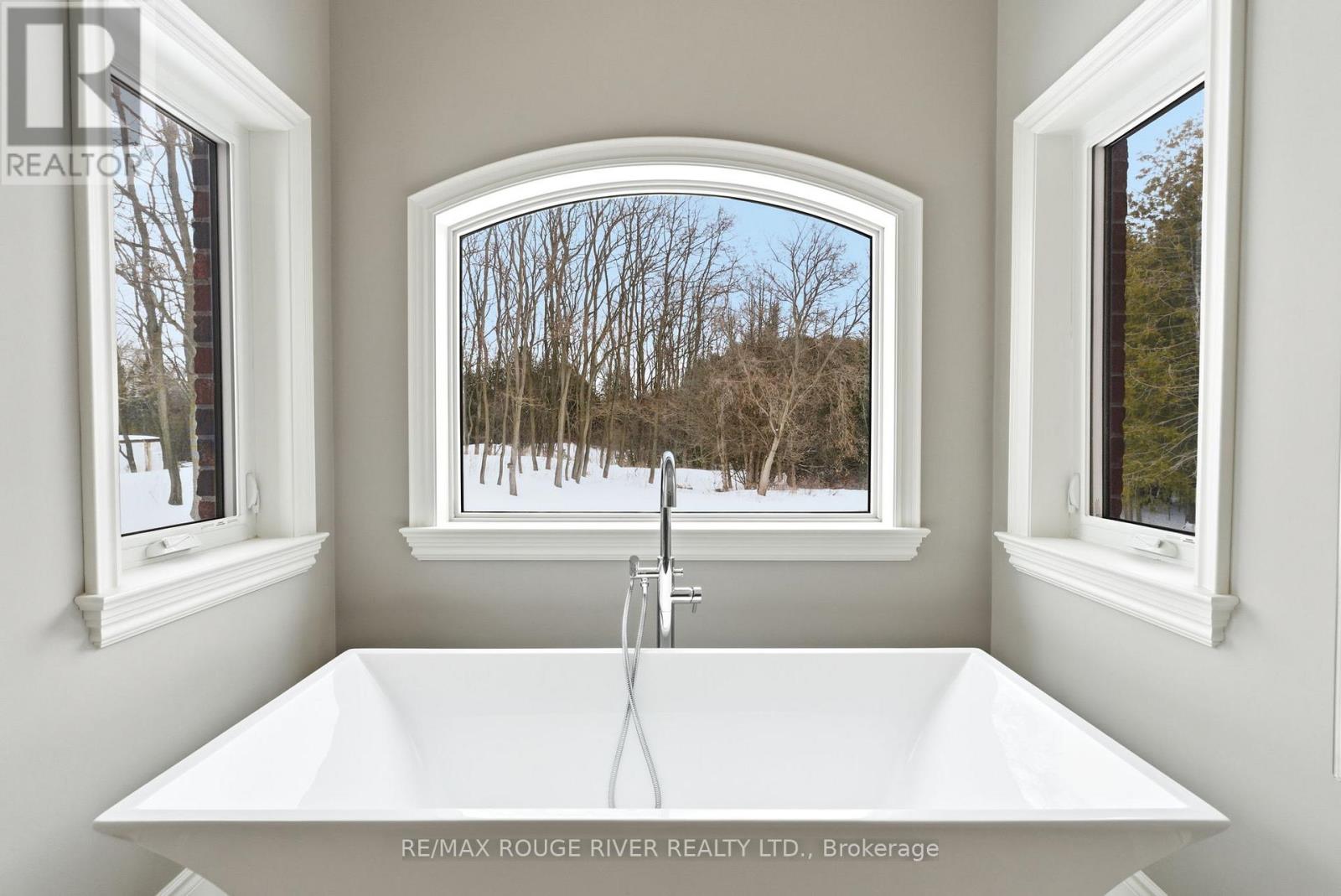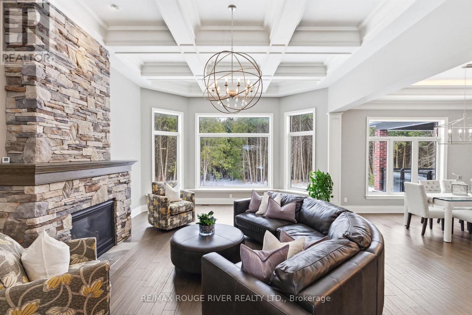 Welcome to this one-of-a-kind, custom-built Andelwood Homes bungalow (approx 4100 sq ft), nestled on 80+ private acres surrounded by trees and the peace & calm of nature in Newcastle. Set well back from the road & completely hidden from view, this extraordinary estate offers unmatched privacy and a true retreat-like setting while remaining just minutes from city amenities & convenient access to Hwy 401, 115/35, 407 & 418. Southern exposure & expansive windows offer spectacular views of the forest, which are also enjoyed from the covered Deck. Designed with impeccable craftsmanship, the home features custom millwork, soaring ceilings, plaster crown mouldings, both interior & exterior transom windows that enhance natural light throughout. Illuminated closets, multiple ceiling treatments, large mudroom with bench, & a laundry room with custom dog shower add both elegance & function. The open-concept main floor is ideal for entertaining & family living. Stunning Great Room showcases a dramatic waffle ceiling & dry-stacked fireplace, creating a sophisticated focal point. The dream kitchen is a true showpiece with custom cabinetry, Cambria countertops & backsplash, WOLF & Sub-Zero appliances, & a custom walk-in pantry. Primary suite offers a spa-inspired ensuite with heated floors & towel rack, stand-alone tub, serene forest views, & a frameless glass shower, porcelain tiles, separate rain shower head, bench, & shampoo niche. Additional bedrooms provide ample room for family & guests. Fully finished lower level includes a separate entrance & rough-in for a bar or second kitchen, offering in-law or multi-generational living potential. Car enthusiasts & hobbyists will appreciate 3 oversized garages & a dedicated ATV garage, providing exceptional space for vehicles, storage, & recreational equipment. Explore private trails, open green space, & endless outdoor possibilities all within your own property. A rare offering that combines luxury, tranquility & Picturesque privacy. (id:64974)
