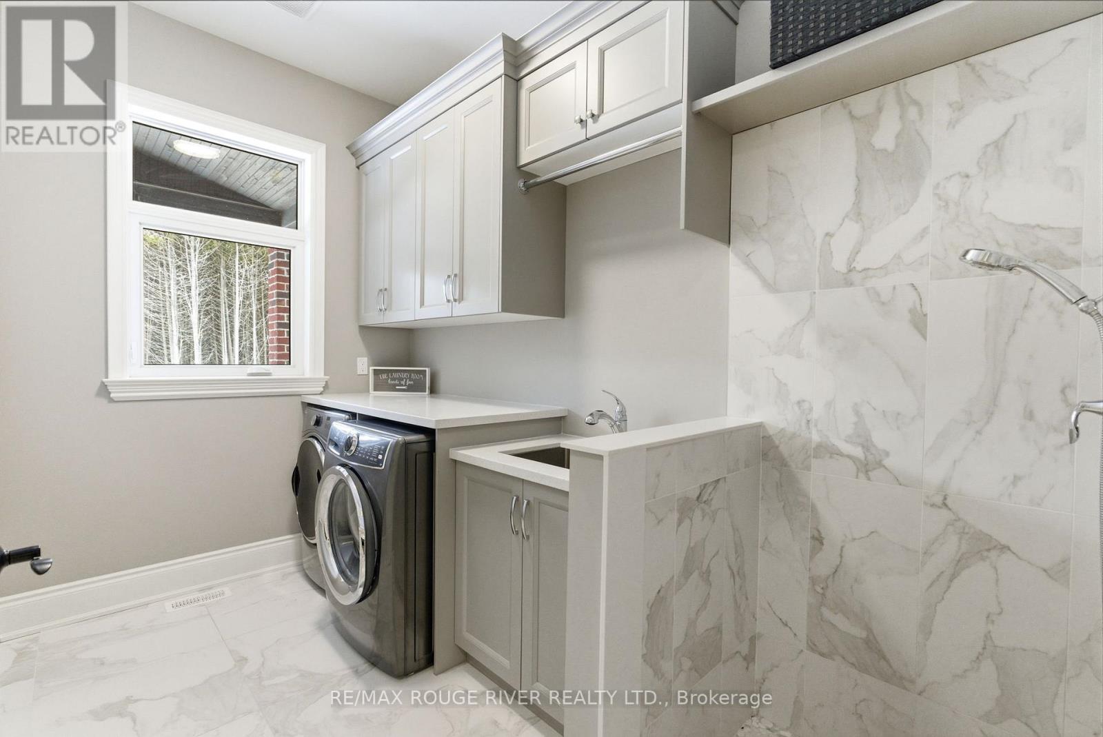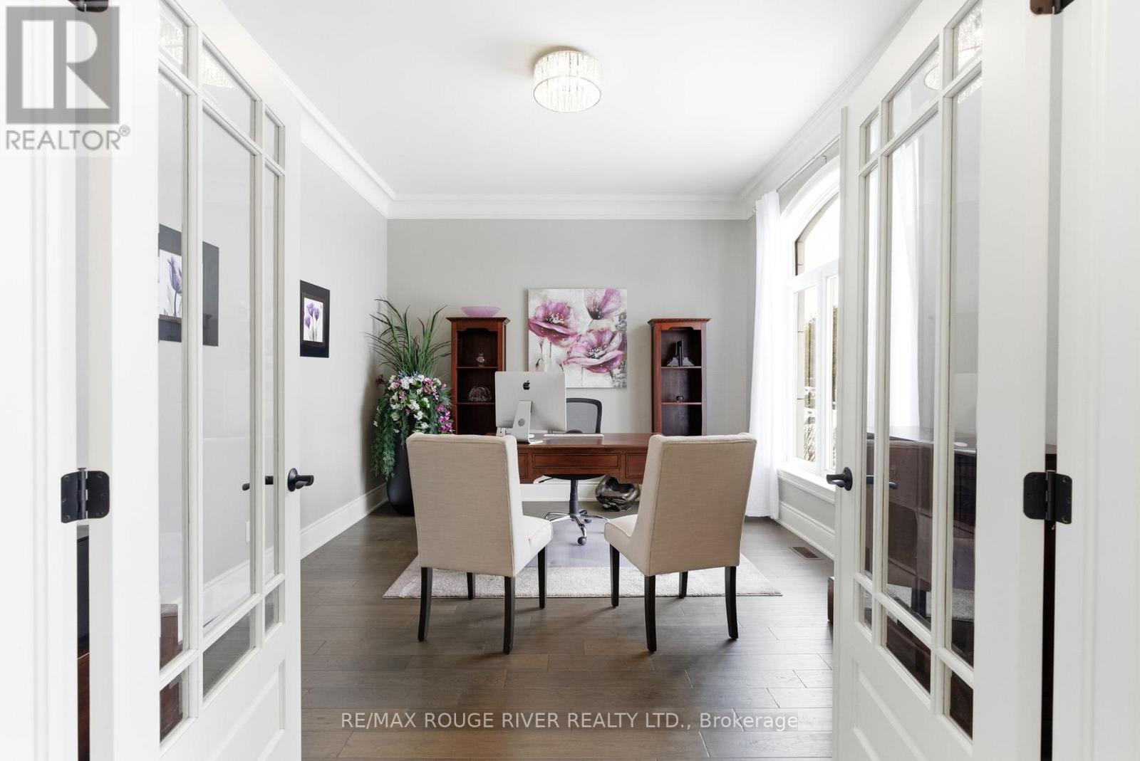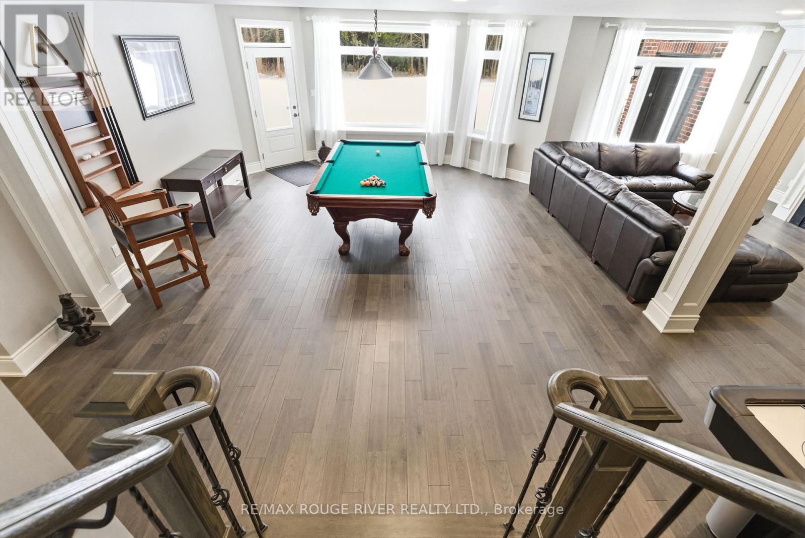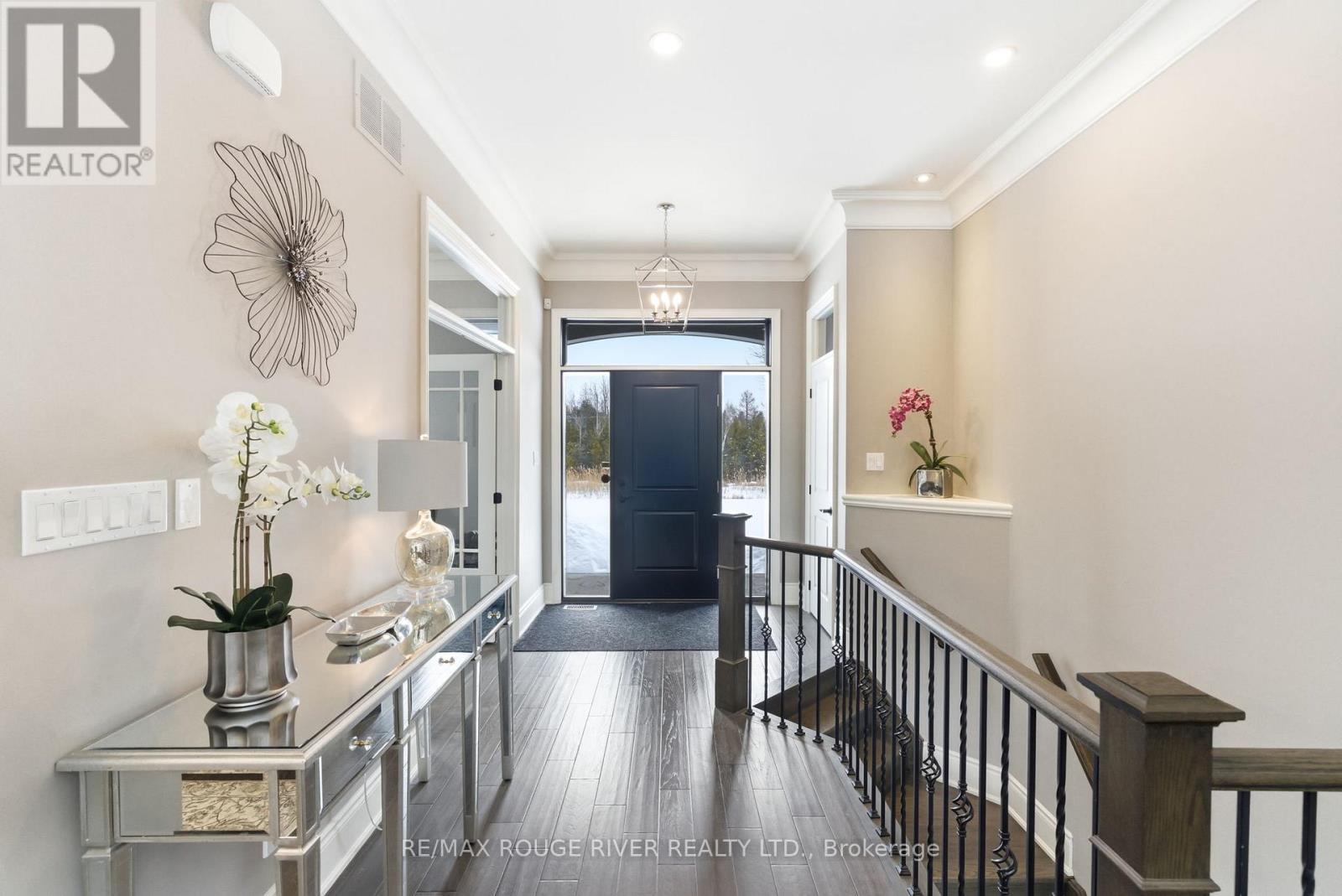 Welcome to this one-of-a-kind, custom-built Andelwood Homes bungalow (approx 4100 sq ft), nestled on 80+ private acres surrounded by trees and the peace & calm of nature in Newcastle. Set well back from the road & completely hidden from view, this extraordinary estate offers unmatched privacy and a true retreat-like setting while remaining just minutes from city amenities & convenient access to Hwy 401, 115/35, 407 & 418. Southern exposure & expansive windows offer spectacular views of the forest, which are also enjoyed from the covered Deck. Designed with impeccable craftsmanship, the home features custom millwork, soaring ceilings, plaster crown mouldings, both interior & exterior transom windows that enhance natural light throughout. Illuminated closets, multiple ceiling treatments, large mudroom with bench, & a laundry room with custom dog shower add both elegance & function. The open-concept main floor is ideal for entertaining & family living. Stunning Great Room showcases a dramatic waffle ceiling & dry-stacked fireplace, creating a sophisticated focal point. The dream kitchen is a true showpiece with custom cabinetry, Cambria countertops & backsplash, WOLF & Sub-Zero appliances, & a custom walk-in pantry. Primary suite offers a spa-inspired ensuite with heated floors & towel rack, stand-alone tub, serene forest views, & a frameless glass shower, porcelain tiles, separate rain shower head, bench, & shampoo niche. Additional bedrooms provide ample room for family & guests. Fully finished lower level includes a separate entrance & rough-in for a bar or second kitchen, offering in-law or multi-generational living potential. Car enthusiasts & hobbyists will appreciate 3 oversized garages & a dedicated ATV garage, providing exceptional space for vehicles, storage, & recreational equipment. Explore private trails, open green space, & endless outdoor possibilities all within your own property. A rare offering that combines luxury, tranquility & Picturesque privacy. (id:64974)