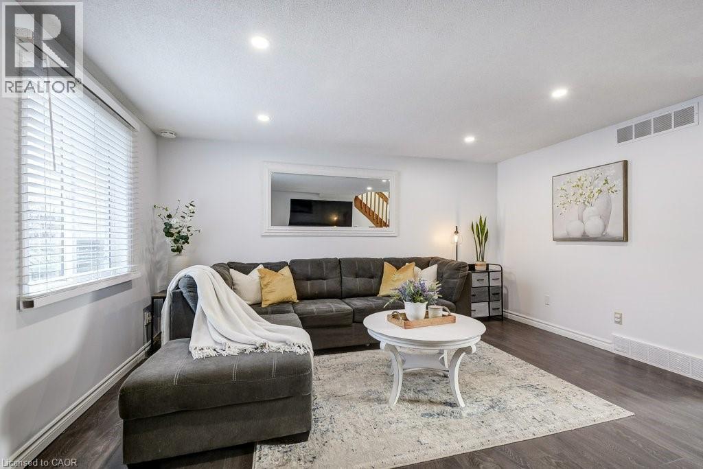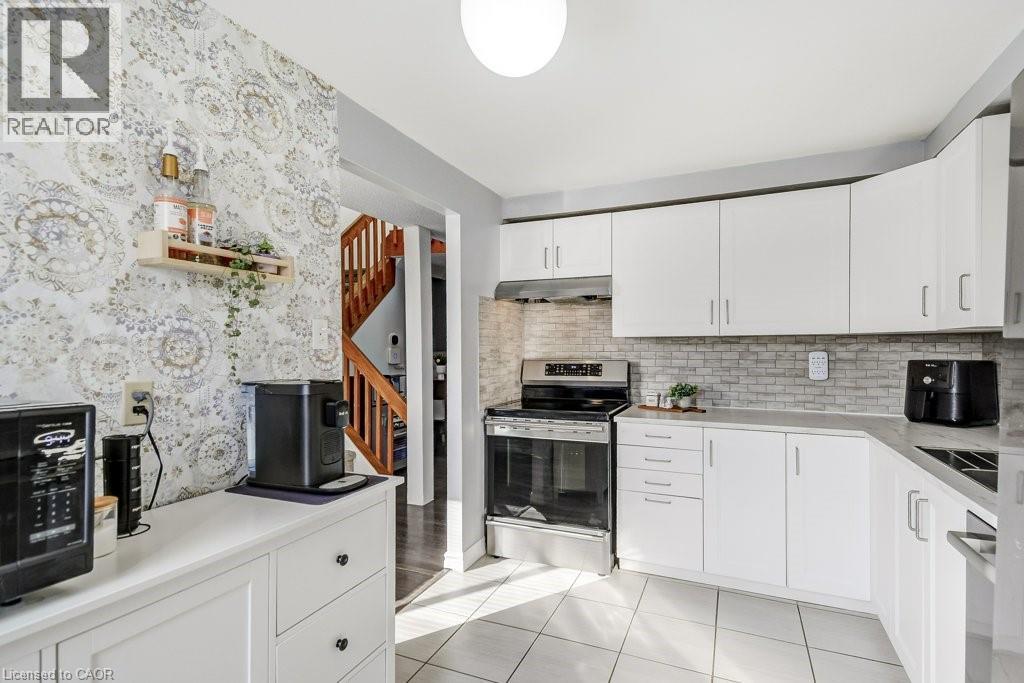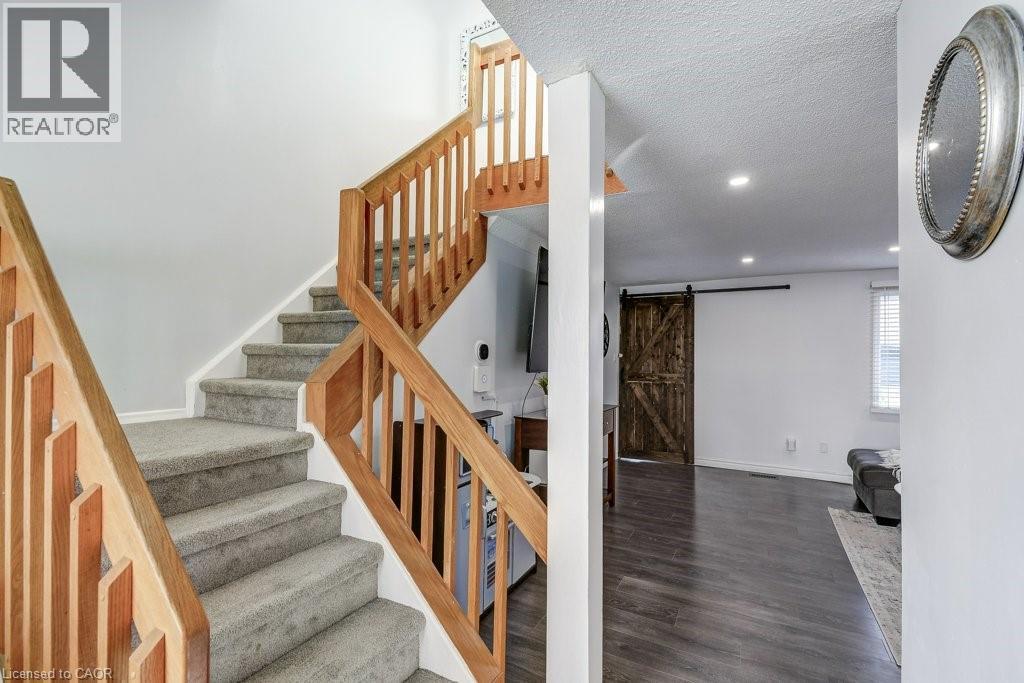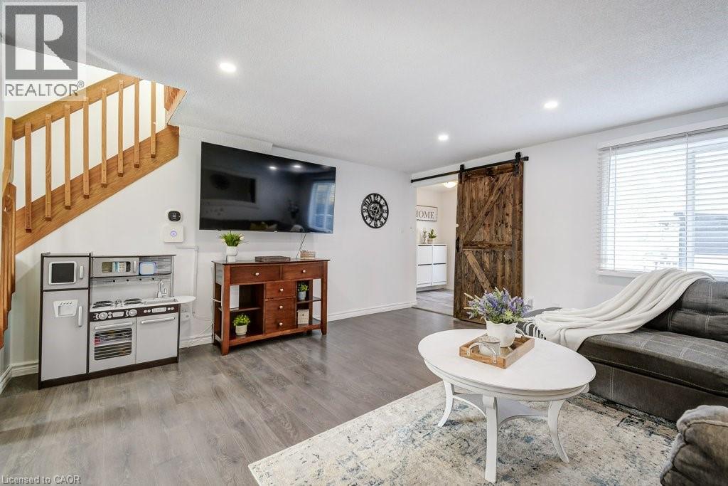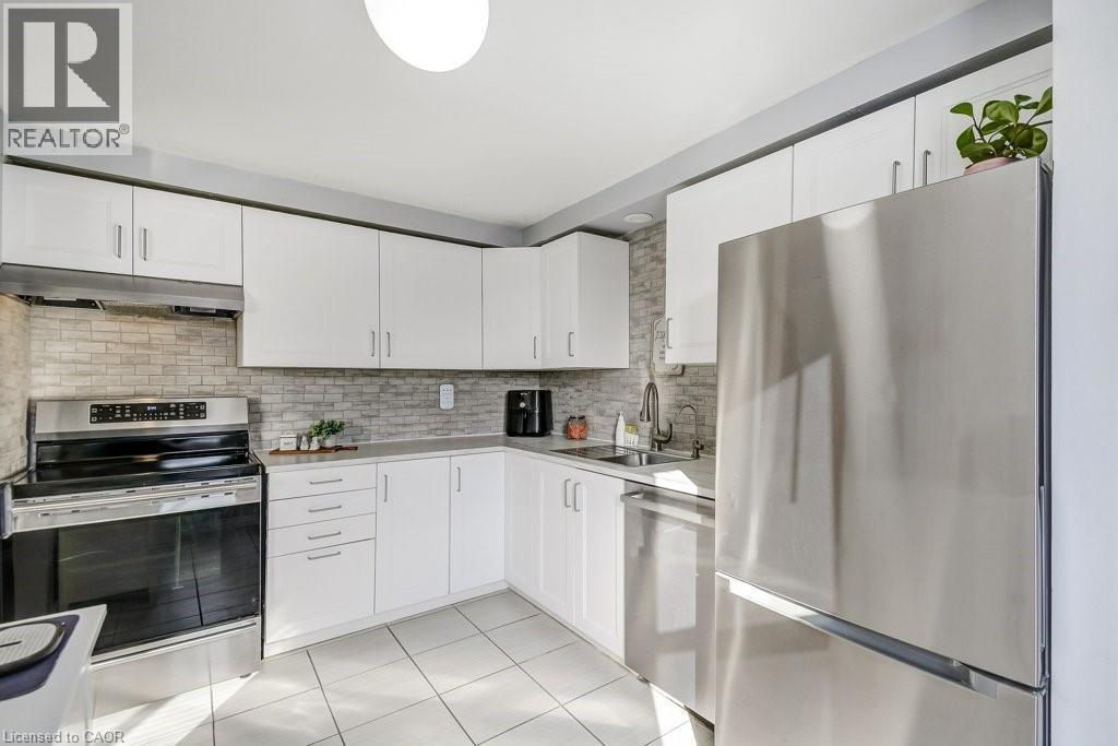 Opportunity is knocking with no condo fees! This bright and inviting freehold townhome offers a spacious layout and vibrant interior - perfect for entertaining family and friends. You'll love the easy flow of the main level which comes complete with a generous living room as well as a dining area with a vaulted ceiling. The fully remodeled kitchen with crisp white cabinetry, additional pantry and stainless steel appliances make it both stylish and functional. Upstairs, you’ll find three good-sized bedrooms and an updated 4-piece bathroom. This home has been freshly painted throughout and features brand new vinyl flooring. A large unfinished walk-out basement offers an ideal blank canvas for future living space and includes a rough-in for a second bathroom. Step outside to a large partially fenced backyard perfect for kids to play or simply just relaxing in the sun. Two new sheds provide outside storage space. A beautifully stamped concrete front patio and a freshly paved driveway (2022) with carport accommodates up to three vehicles. Enjoy peace of mind with several recent upgrades, including a newer furnace, humidifier, and smart thermostat (2021), all with transferable warranties. Additionally, the home comes equipped with a Ring security system which will be staying with the house. Ideally located in a family friendly neighbourhood close to parks, shopping, schools, and is just minutes from Highway 401. This property is a fantastic opportunity you won’t want to miss. Book your showing today! (id:64974)