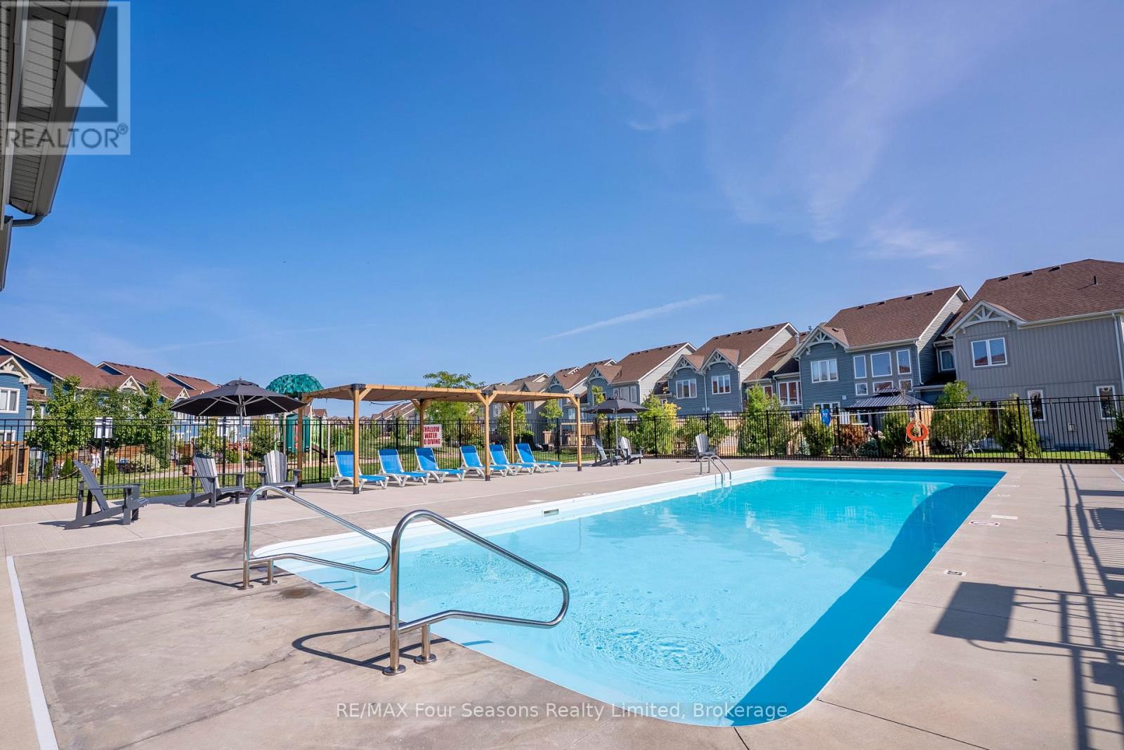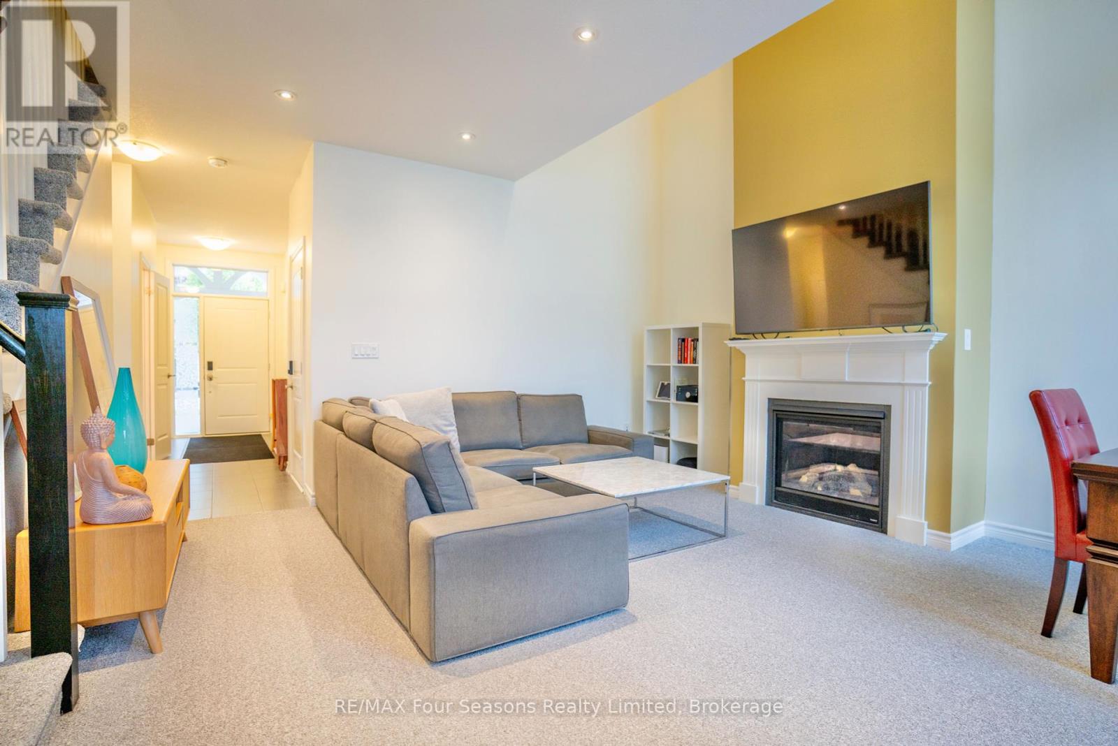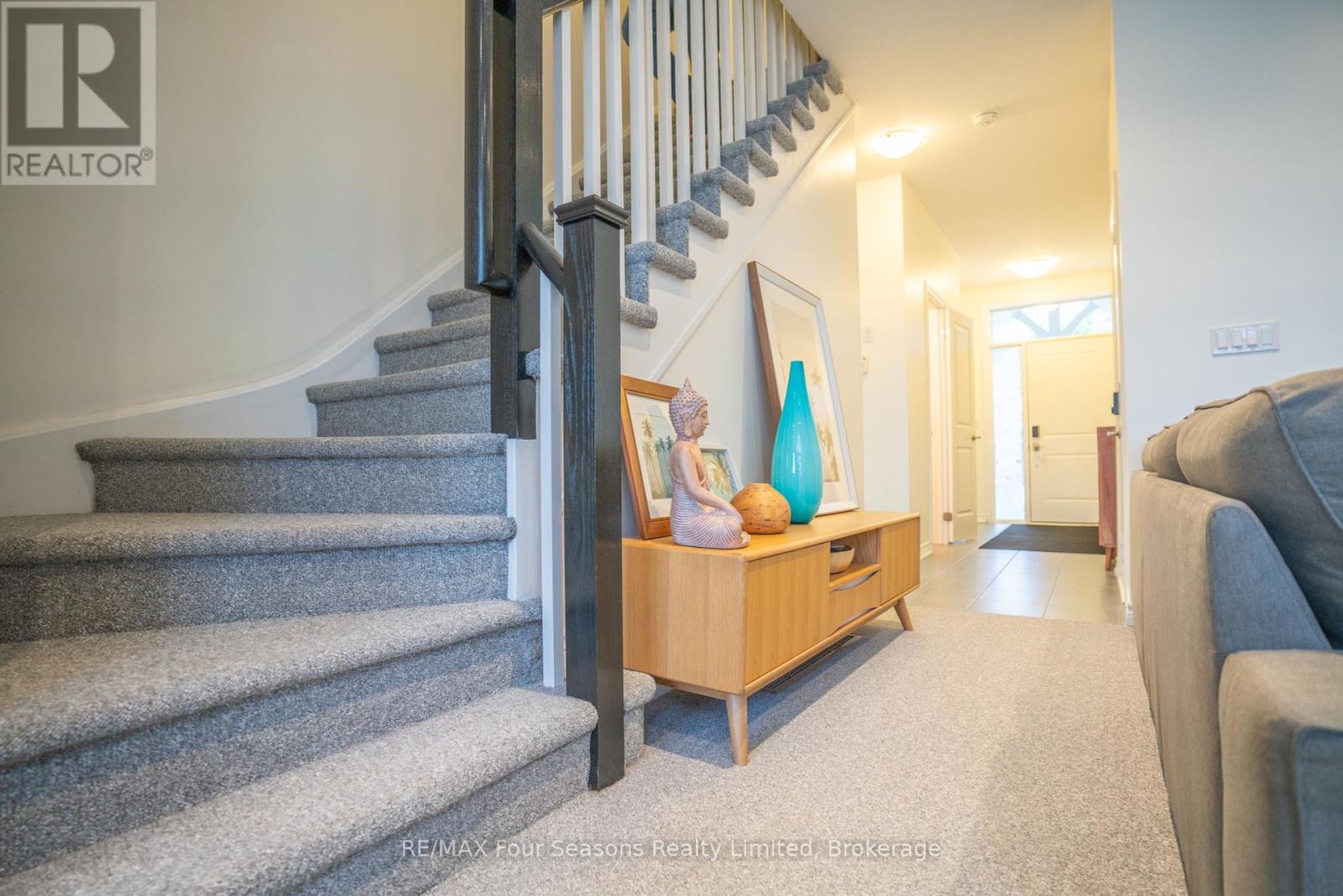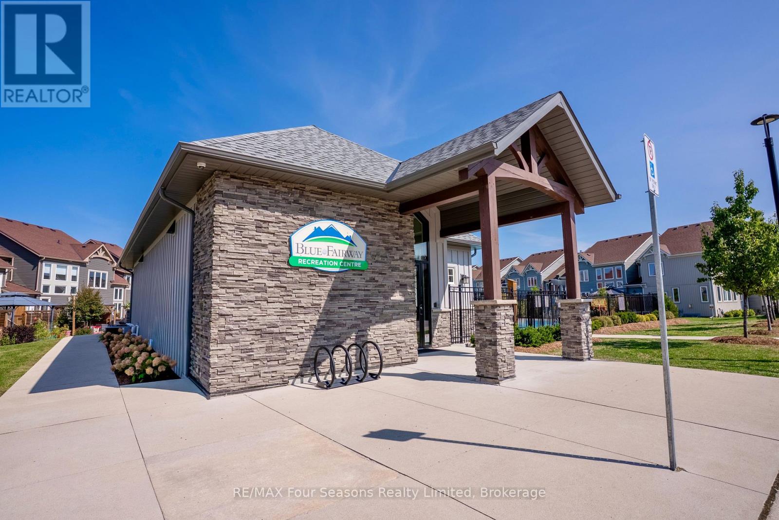 Price Drop! A fantastic opportunity to own a freehold townhouse in the Blue Fairway community conveniently located minutes away from downtown Collingwood and Blue Mountain. With 2 bedrooms and 2.5 bathrooms, this modern two-storey townhouse is perfect for a weekend vacation property or an older couple looking for a quiet and safe neighbourhood. The main entrance welcomes you with a covered porch that leads into a spacious foyer with lots of closet space, access to the attached garage and a powder room. Continuing on is the open concept kitchen and bright living room with vaulted ceilings and sliding doors to the backyard space. On the second level you will find the sizeable primary bedroom with a walk-in closet and a 4-piece ensuite offering lots of natural light. The additional bedroom is great for guests or office space with the second 4-piece bathroom ideally located next to it. You will also find the stackable washer and dryer neatly tucked away in a closet on the landing. The full size, unfinished, new framed basement presents lots of opportunity for additional storage or future living space with roughed-in plumbing already in place. Enjoy worry-free living by reaping the benefits of a townhouse that is only 7 years old with high-efficiency natural gas forced air, central air and remaining transferable Tarion warranty. This lot was originally sold as a premium lot due to its ideal location, situated just mere steps from the exclusive Blue Fairway gym, games room and the incredible heated outdoor pool. This prime location is also near the Cranberry trail and boardwalk, Cranberry golf course, White's Bay and so much more. If you are looking to live in a community that offers a sense of peace and tranquility, then this is the home for you. Update: Owners have installed beautiful new engineered white oak hardwood flooring to the entire main floor, pictures have been added to reflect this upgrade. (id:64974)