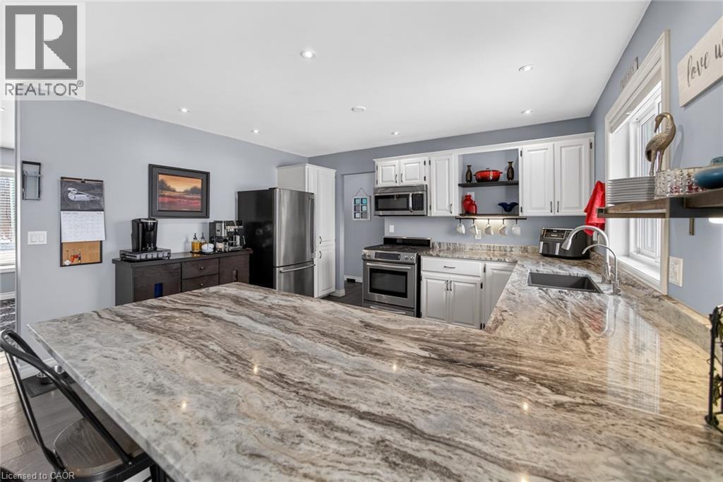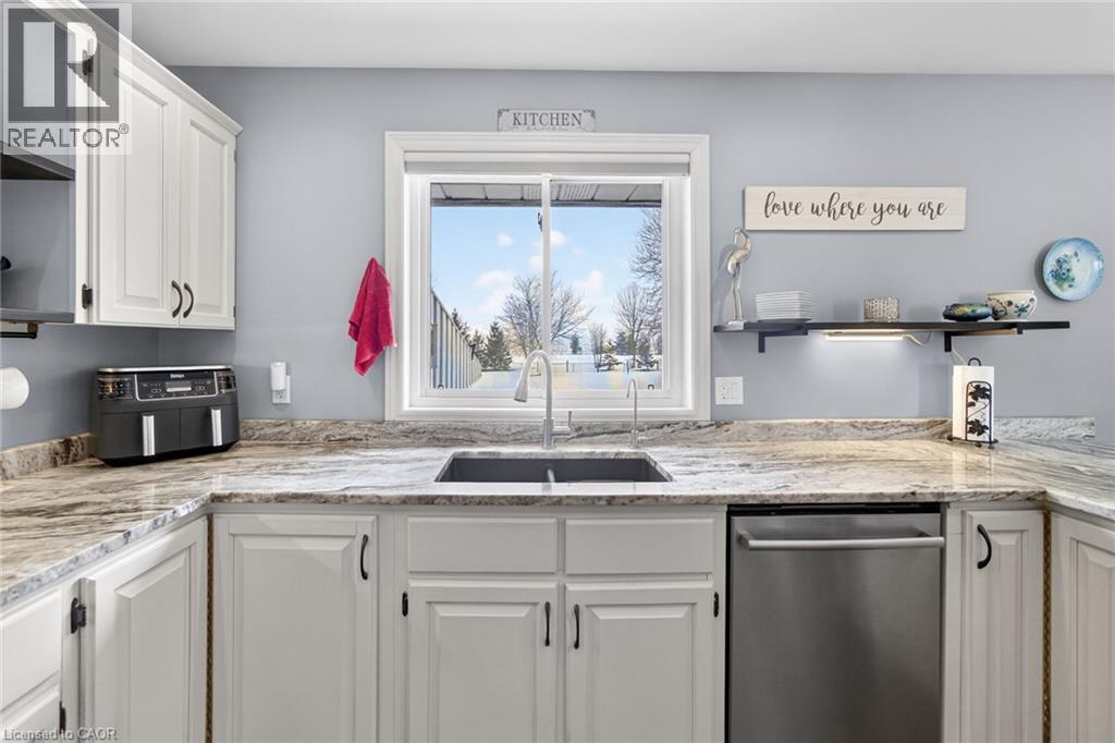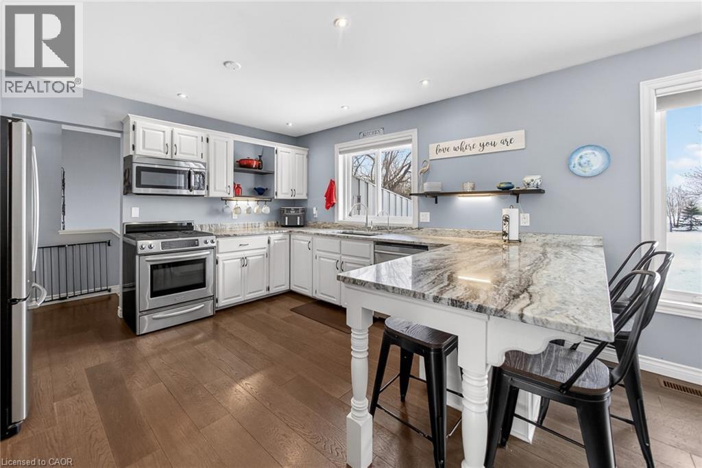 Immaculate raised brick bungalow in the heart of Wainfleet, just a short walk to schools, library, playgrounds, sports fields and the arena. Set on just over 1 acre with no rear neighbours, this beautifully maintained home offers privacy, open views and incredible sunsets. The inviting main floor features an open concept layout with a bright kitchen and dining area, spacious living room, and three generous bedrooms including a primary with walk-in closet. Wide plank hardwood floors add warmth throughout. The finished lower level offers large windows, a spacious rec room with gas fireplace, an additional large bedroom, bonus room and 3-piece shower. Ideal potential for an in-law suite setup. Exterior highlights include a private covered porch overlooking the expansive backyard, 15x24 pool with deck (2022), and chainlink fence (2021). Major updates provide peace of mind: furnace (2021), water heater (2024), full home filtration system (2025), three pumps replaced (2023), rear windows (2023), extended kitchen island with granite counters (2022), and Generac generator maintenance (2024). Attached double car garage completes this move-in ready property. Meticulously cared for inside and out. (id:64974)