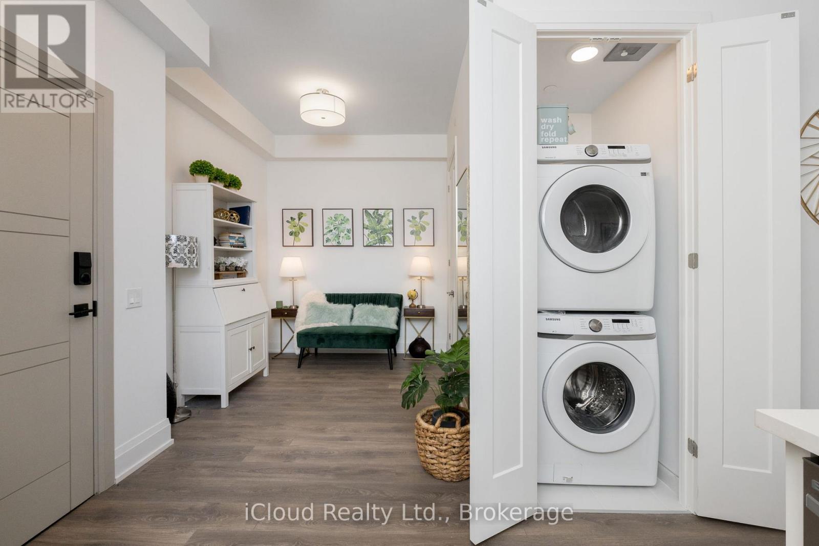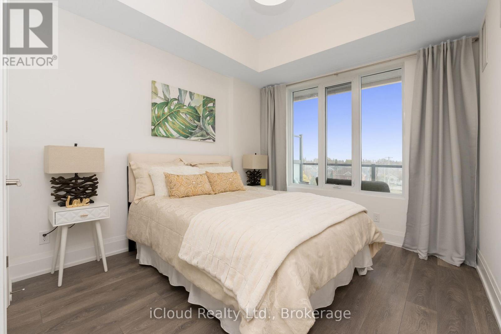 Welcome to the bright east facing 4th floor, Edward Suites, a 1 bedroom plus den with 10ft ceilings, upgraded 8ft interior doors, an open concept layout and a large balcony (142 SF) with space to lounge and dine. The kitchen includes quartz countertops with upgraded edges, extended 42 inch upper cabinets, a tile backsplash, under cabinet lighting, stainless steel appliances and breakfast bar, a walk in closet in the bedroom and ensuite full sized laundry units. The condo comes with one parking space equipped with bike rack for 2, a storage locker in heated locker room. Come experience luxurious living at Monoco Condo in downtown Collingwood where you will delight in a wealth of exclusive amenities. Relax or entertain on the magnificent rooftop Terrence with secluded BBQ area, fire pit, water feature and AI fresco dining while takin in the breath taking panoramic views of Downtown Collingwood, blue mountain & Georgian Bay. Other amenities include a rooftop fitness centre with mountain view a gorgeous party room. Enjoy an easy lifestyle with shops, restaurants and the Georgian bay waterfront all within walking distance. (id:64974)
