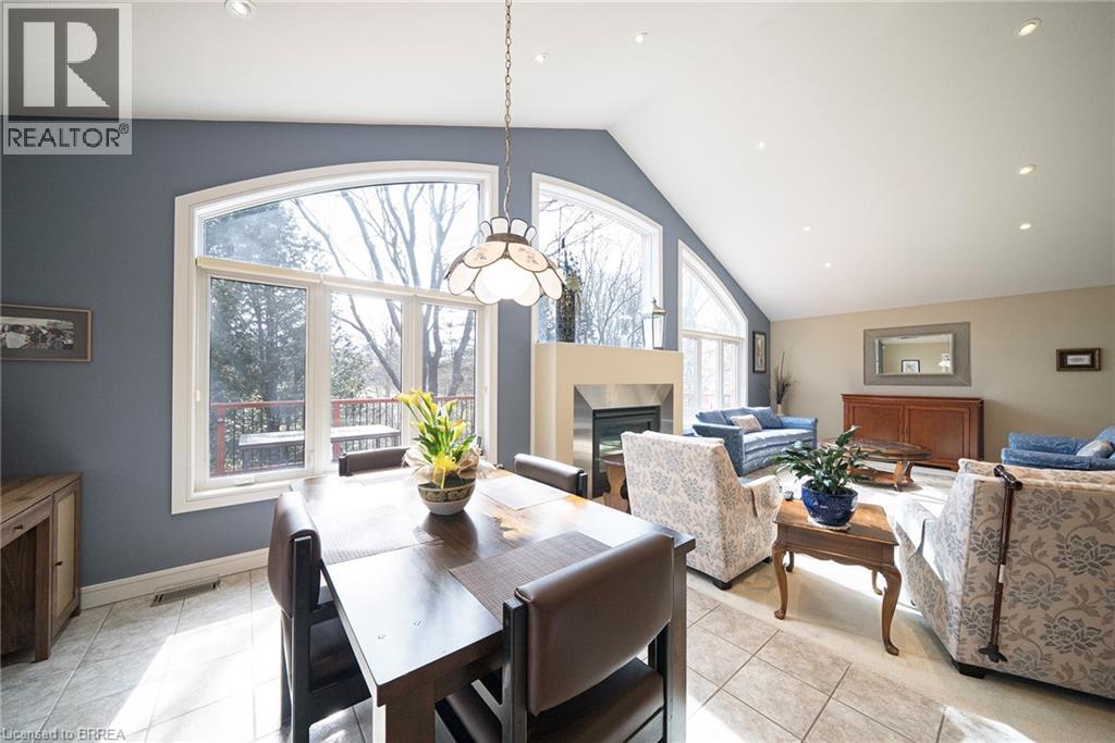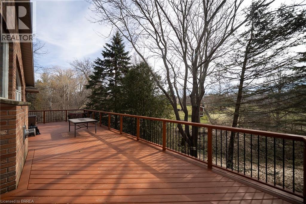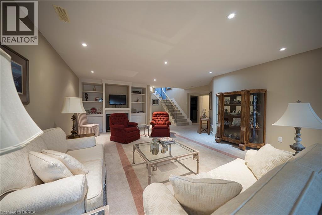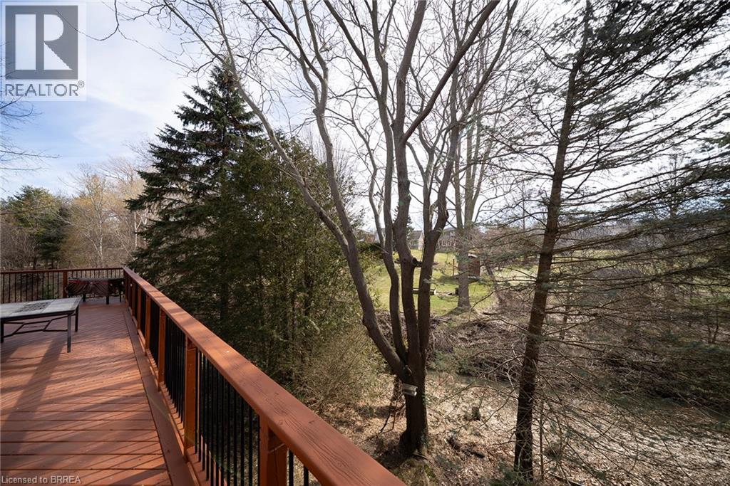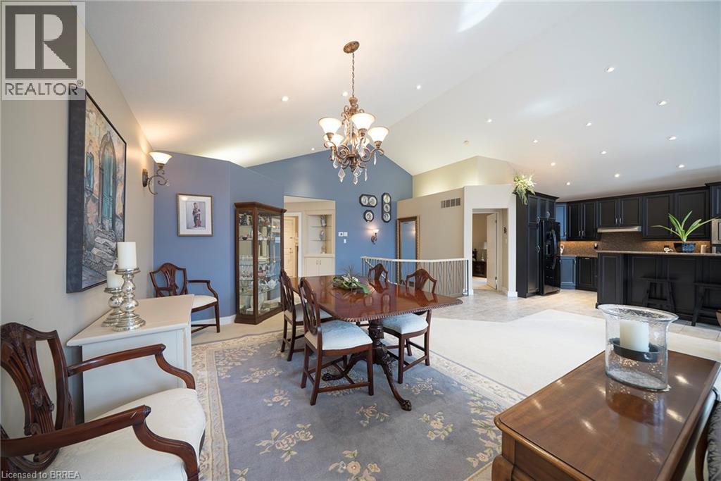 Welcome home to 422 Powerline Road, Unit 21, a detached all-brick bungalow condo in the highly sought-after Rosedale Estates, backing onto a peaceful ravine in Brantford’s north-end Rosedale neighbourhood. This well-appointed home offers 1+2 bedrooms, 2.5 bathrooms, 1,734 sq ft on the main level and a 1,513 sq ft finished basement. A 2-car garage and interlocking brick walkway lead to the front entrance, while landscaped grounds offer low-maintenance condo living. The tiled foyer features recessed lighting, built-in shelving, a 2pc bathroom, inside access to the garage and an updated (2021) laundry room. The main level opens to a bright open-concept great room with soaring ceilings, recessed lighting and large windows filling the space with natural light. The great room features formal dining space and a living room with gas fireplace & focal-point ravine windows. The updated (2012) kitchen features shaker-style cabinetry with crown moulding, granite countertops & matching backsplash. Built-in appliances include a wall oven, microwave and cooktop set into the granite. A granite island with seating and storage anchors the space. The breakfast area features patio doors to an expansive wraparound deck with gas BBQ rough-in overlooking the ravine. The primary bedroom features California shutters, recessed lighting, dual closets and a updated (2017) 4pc ensuite with double sinks, shower, heated tile floors and plenty of storage. The finished basement includes a recreation room with built-in shelving, speakers & recessed lighting, plus a walk-out to a rear patio. This level also offers 2 bedrooms, a den and a 3pc bathroom with California shutters throughout. The rear yard features an interlocking patio surrounded by mature trees, with no rear neighbours & a peaceful ravine view. Located in the prestigious and sought-after Rosedale Estates, this well-maintained bungalow condo offers quiet living in one of Brantford’s most desirable communities close to everyday amenities. (id:64974)