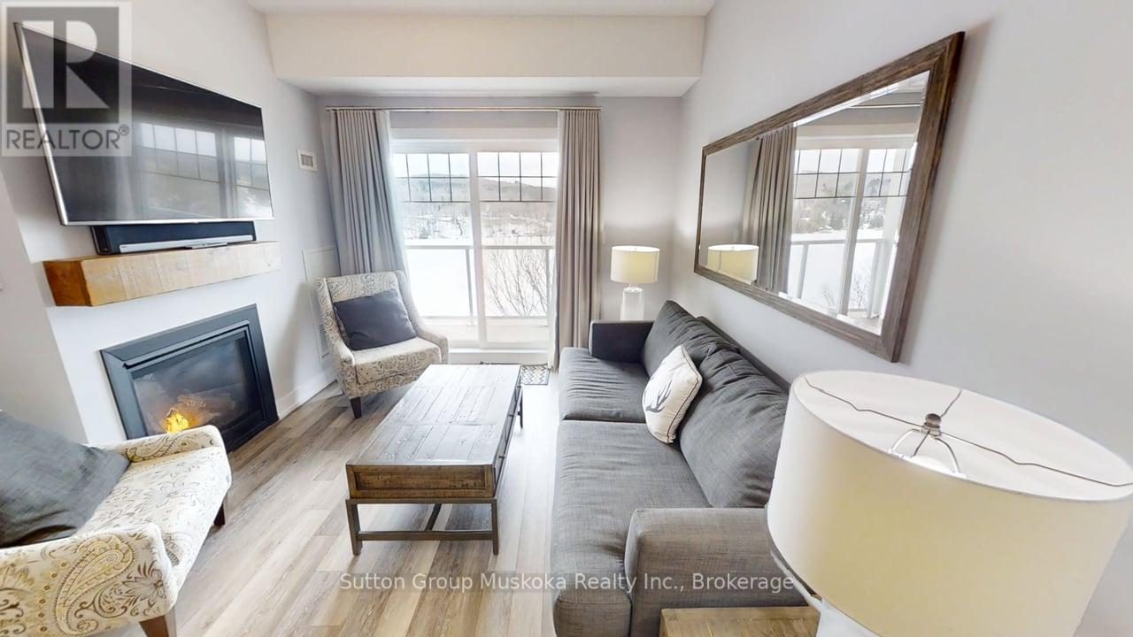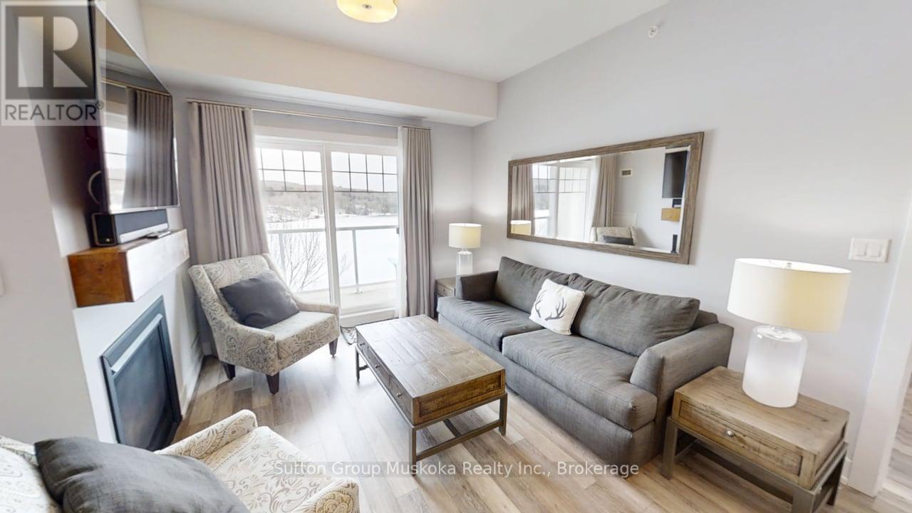 Top floor two-bedroom condominium located in the Lakeside Lodge at Deerhurst Resort Muskoka! This immaculate two-bedroom, two-bathroom unit offers a commanding view over Peninsula Lake. Enjoy a sunny afternoon and a cool drink on your large private balcony overlooking the lake - plenty of room for a large group. This luxury unit is ready for you to enjoy and is offered fully-furnished and includes a storage unit in the building. Inside the unit you will find a fully equipped kitchen with stainless steel appliances, natural gas fireplace, 9-ft ceilings, laundry room and 878 sq. ft of living space (one of the larger two-bedrooom units with a lake view) & more. The large primary bedroom includes an ensuite with huge glassed walk-in shower. The building includes elevators, a large recreational/games room with pool table, great for gatherings, a gym, plus a pool located on the lake-side of the building. The heat pump for the unit was replaced by the current owner in 2024. Deerhurst has something to offer for everyone beaches, multiple pools, golf, tennis, restaurants, docking, trails and many additional activities and special events at the resort including concerts and comedy shows all in one without having to travel. Unit includes a private locker in the lower area of the building. Condo fees include natural gas, TV cable, internet, building maintenance, along with other normal condo items. Deerhurst is located 5-minutes from the Town of Huntsville, 5-minutes to Arrowhead Provincial Park, 20 minutes to Algonquin Park & much more. Peninsula Lake is part of a chain of lakes offering over 40 miles of boating. Unit is not on the rental program but could be added if desired. HST does not apply to the sale. Annual property tax $5,866. Monthly condo fee $772.88. Ownership includes use of recreational facilities at the resort and discounts on certain of the resort amenities, such as golf and dining. Enjoy the resort lifestyle and live, vacation and invest in Canada! (id:64974)