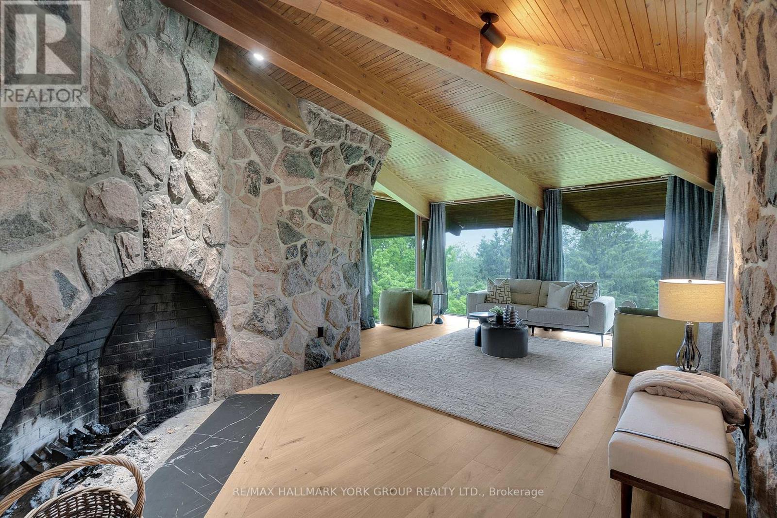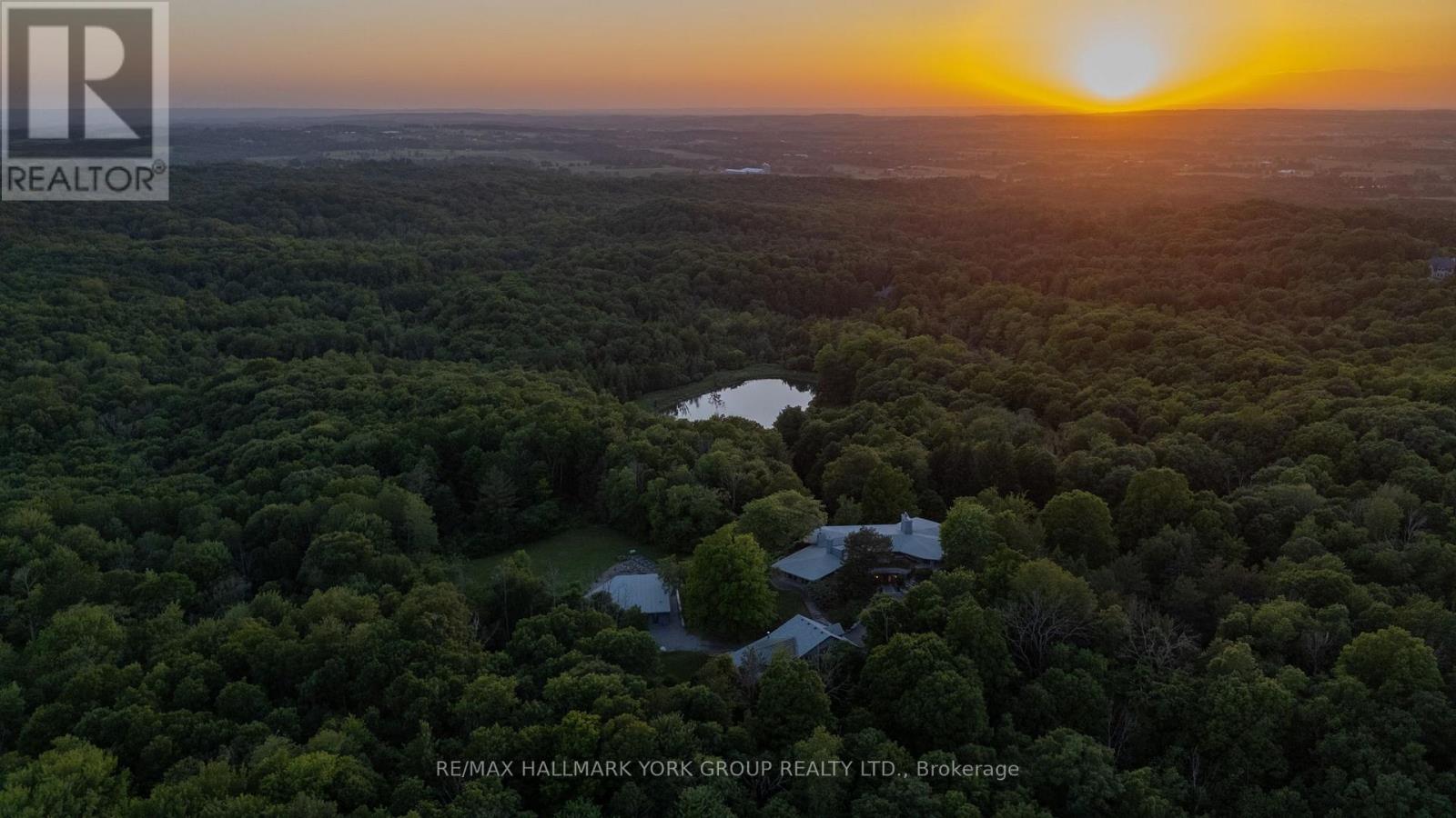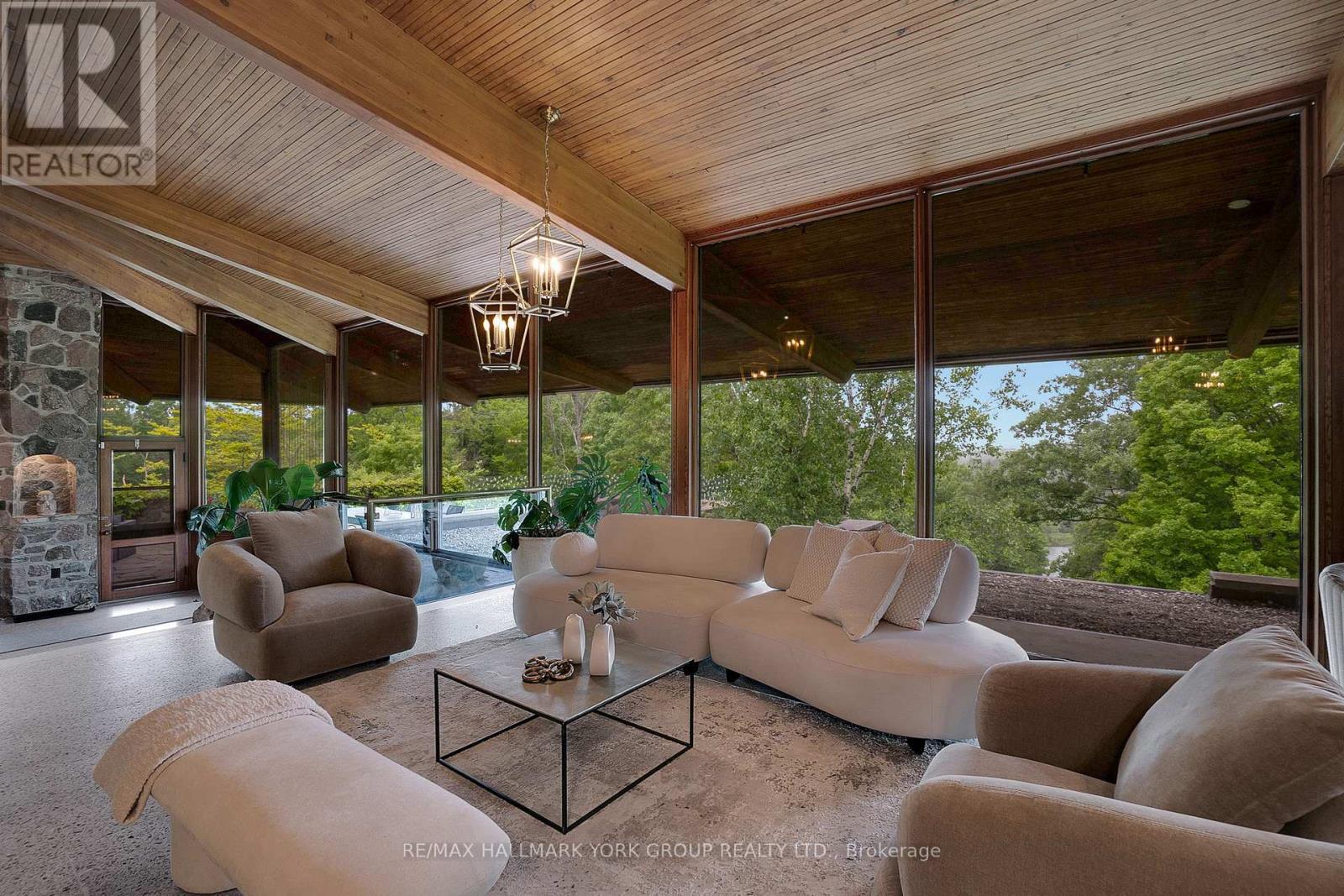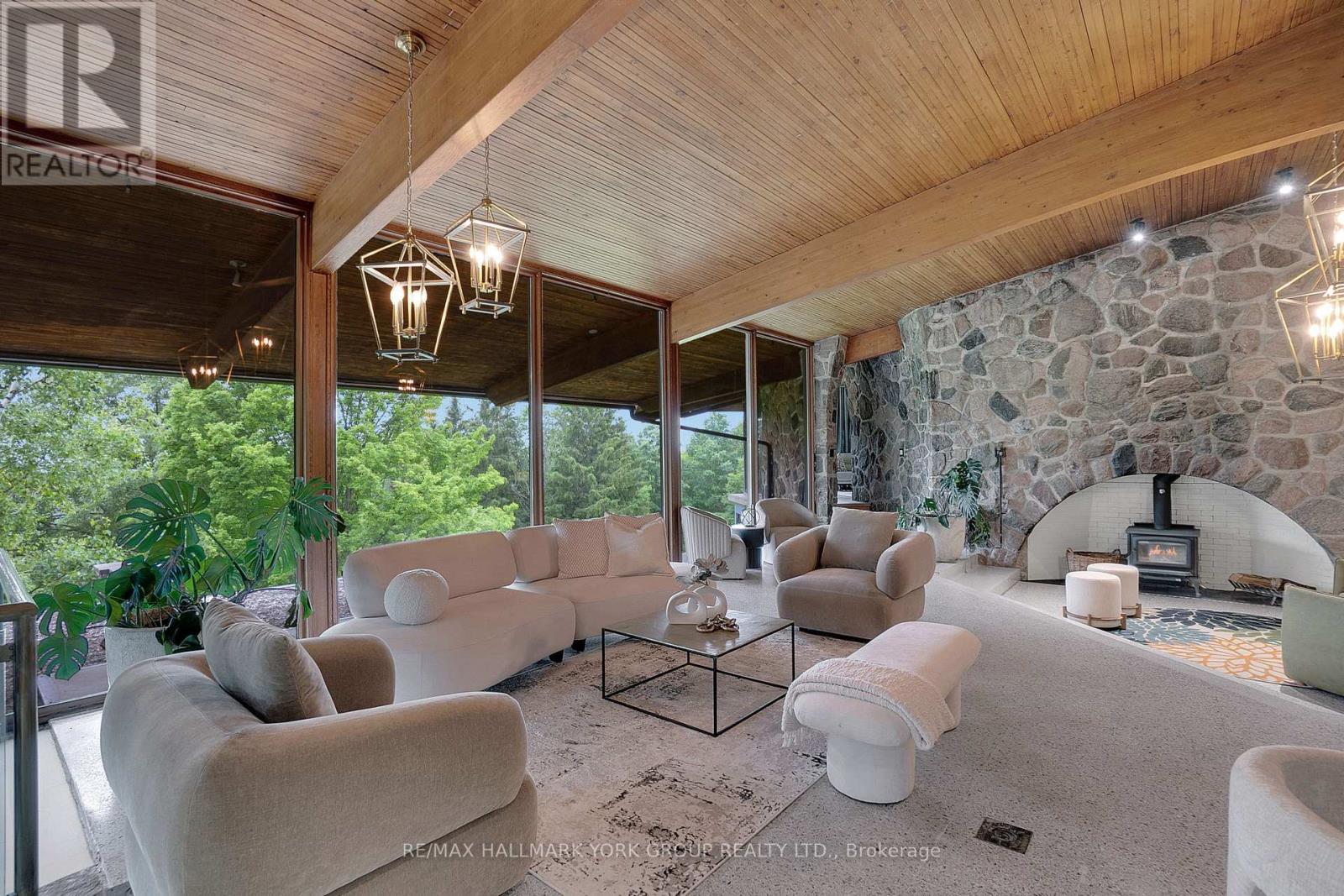 Welcome to an extraordinary estate tucked away behind welcoming stone pillars and a winding forested driveway! This is a work of art designed by the legendary Grant Whatmough and Gardiner Cowan, with distinctive Frank Lloyd Wright style of Architecture. This iconic Mid-Century Modern residence is gracefully integrated into 32 acres of majestic land, where nature and architecture exist in perfect harmony. From the moment you approach the stunning entry door, you're drawn into a world of timeless design and serene beauty. This home is lovingly maintained with extensive renovations, while preserving the character and soul of this home, Including Floor-to-ceiling windows bring the outdoors in, Stone fireplaces indoor and out, original stone walls and impressive wood beams throughout. Spanning approximately 5,000 sq ft, the main residence features 6 bedrooms, 7 bathrooms, an office, a meditation room, and a separate nanny suite. Multiple terraces and decks surround the home, offering breathtaking views of the land, and a tranquil lake creating the feel of a private luxury retreat. This property features a rare second home- fully renovated and approximately 3,500 sq ft-offering 3 bedrooms, 4 bathrooms, and a massive loft space! This second home is ideal for an extended family! There is an additional Yoga studio with an outdoor shower! a Detached garage/ workshop, a charming cedar Cabin with Sauna and Cold plunge, a Covered cabana for entertaining or relaxing on the property. This is a once-in-a-lifetime opportunity to own an architecturally significant estate in the prestigious King Township. With unmatched privacy, lush surroundings, and two beautifully appointed homes, this property is truly a timeless work of art. Don't Miss it! (id:64974)