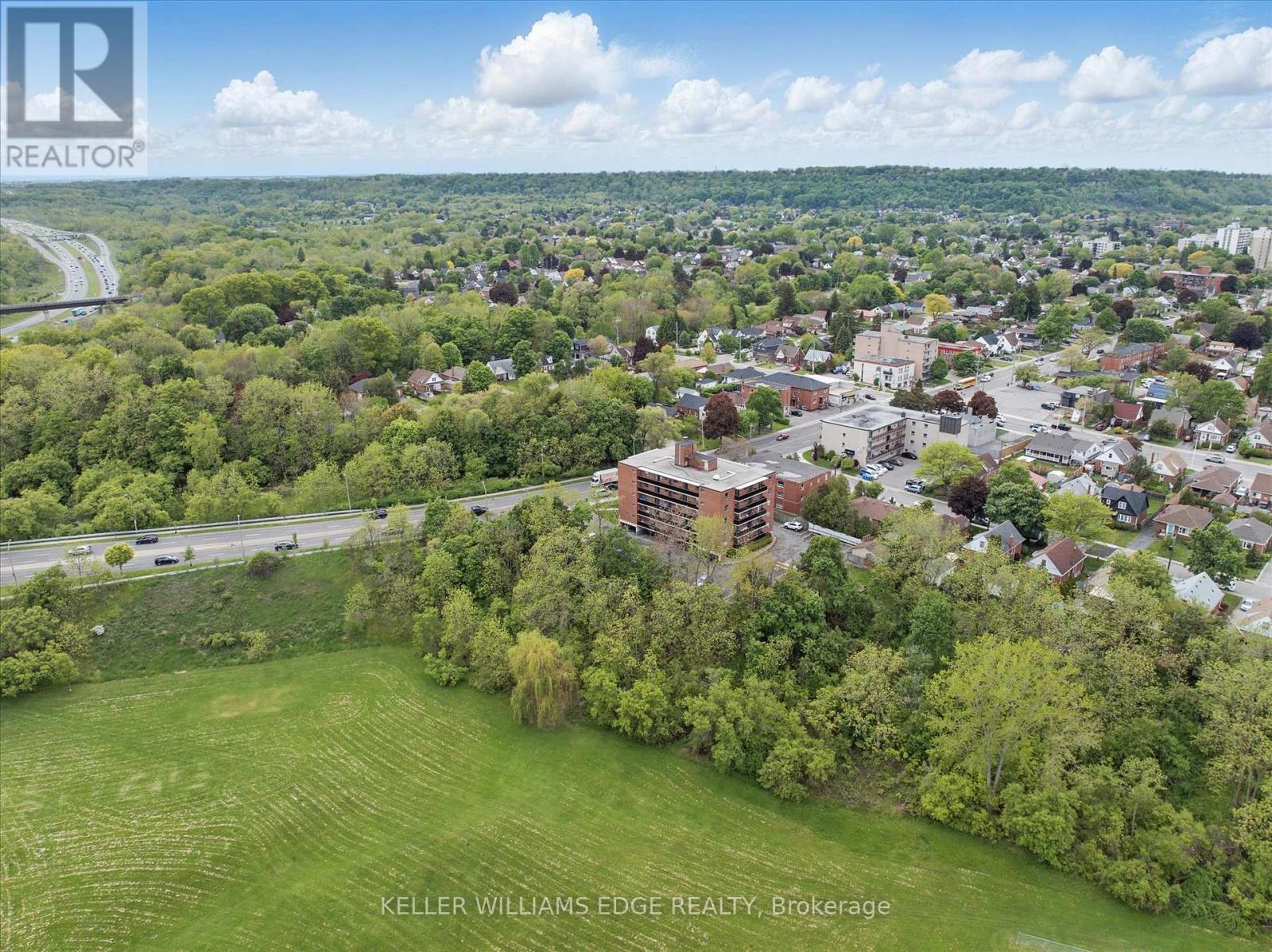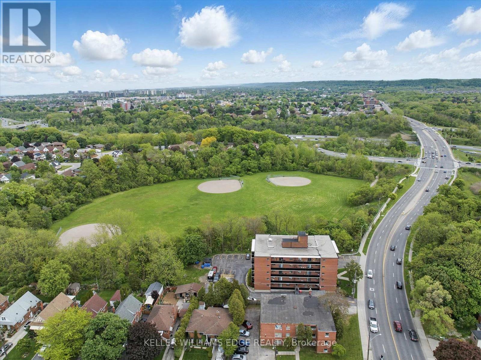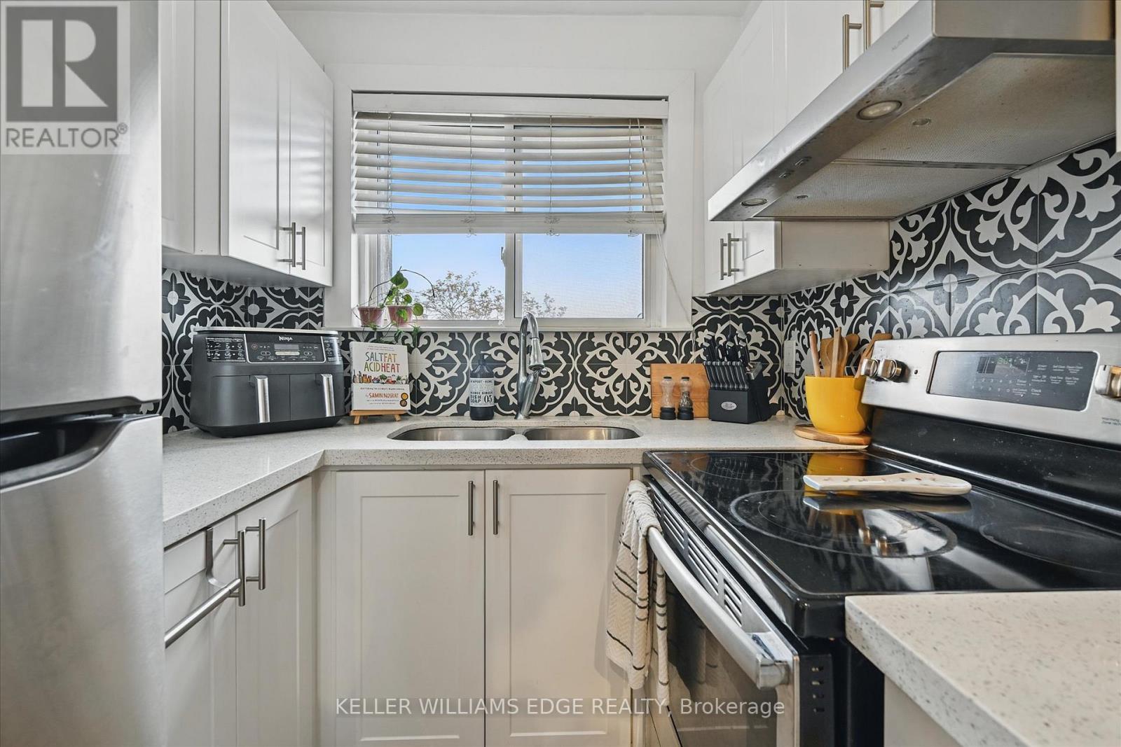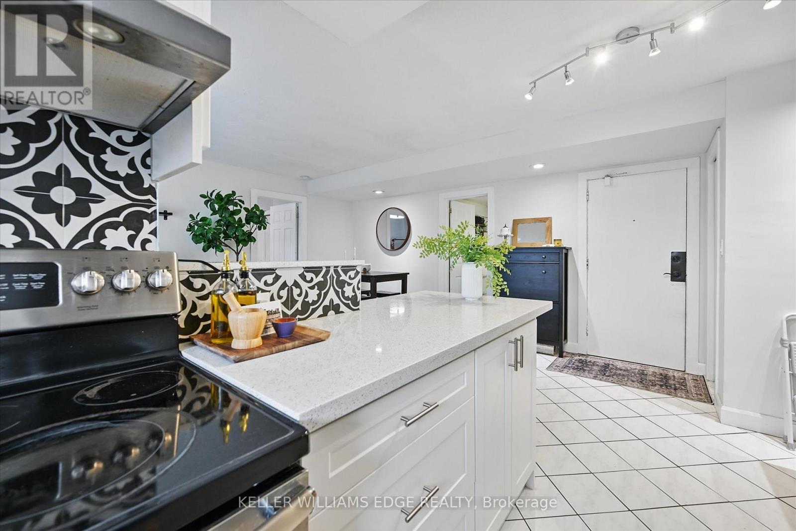 Welcome to this bright and stylish 1-bedroom, 1-bathroom condo offering 618 square feet of comfortable, well-designed living space on the forth floor of a quiet and well-maintained building in East Hamilton. The modern kitchen features quartz countertops, a double undermount sink, and a convenient breakfast bar, seamlessly opening into the living area. From here, step out onto your private balcony-an ideal spot to enjoy your morning coffee or unwind while taking in the evening sunset. The generously sized bedroom and windows provide an abundance of natural light throughout. Additional features include secure building entry, elevator access, low monthly condo fees, a clean and well-kept on-site laundry room, one dedicated parking space, and a storage locker conveniently located just steps from the unit. The building is surrounded by mature trees and green space, with plenty of visitor parking available. Located just minutes from the Red Hill Valley Parkway, the Lincoln Alexander Parkway, and the QEW, this location is ideal for commuters. Outdoor enthusiasts will appreciate the close proximity to Red Hill Bowl Park and direct access to the Red Hill Valley Trail, providing easy opportunities to enjoy nature close to home. A fantastic opportunity for first-time buyers, downsizers, or anyone seeking move-in-ready, low-maintenance living in a connected and welcoming neighbourhood. (id:64974)