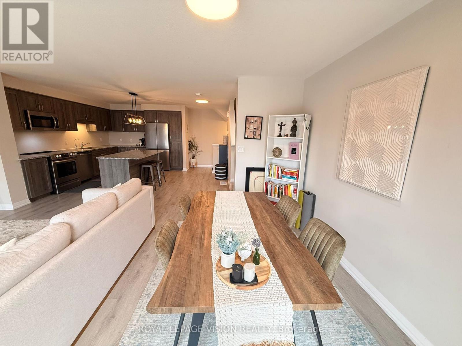 Welcome to this stunning townhome in the highly sought-after Doon South community of Kitchener- a peaceful, family-friendly neighborhood perfect for first-time home buyers or investors. This beautifully maintained home offers a spacious and modern layout featuring 2 bedrooms and 2full washrooms (plus an additional powder room). The second floor boasts a bright and airy living area, a generous dining space, and a stylish kitchen complete with quartz countertops, stainless steel appliances, and a convenient breakfast bar. Step out onto the private balcony - perfect for enjoying summer evenings or your morning coffee. Upstairs, you'll find a well-appointed primary bedroom with a 3-piece ensuite, along with a second spacious bedroom and a shared 4-piece bathroom. The third-floor laundry adds everyday convenience. Additional features include a stone exterior, single-car garage with private driveway, central air conditioning, water softener, and HRV system for fresh air circulation. Located just minutes from Highway 401 and close to schools, parks, Conestoga College, and all essential amenities, this home offers both convenience and tranquility. Monthly fees cover landscaping, snow removal, garbage removal, exterior maintenance, visitor parking, and high-speed internet - making for easy, low-maintenance living. (id:64974)