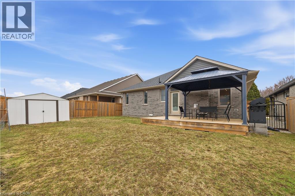 Welcome to this beautifully maintained 2020-built bungalow in a quiet, newer area of Tillsonburg and still under Tarion warranty. Offering 3+2 bedrooms and 3 full bathrooms, this home delivers the perfect blend of modern design, functionality, and low-maintenance living. Step inside to an inviting open-concept layout featuring 9-foot ceilings and a stunning cathedral-style living room filled with natural light. The kitchen is thoughtfully designed with stylish finishes, ample cabinetry, and a large island—ideal for everyday living and entertaining. The spacious living area is anchored by a cozy gas fireplace, creating a warm and welcoming atmosphere. The primary suite offers a private retreat complete with a walk-in closet and ensuite bath. Downstairs, the fully finished basement expands your living space with two additional bedrooms, a full bathroom, and plenty of storage, perfect for guests, family, or a home office setup. Outside, enjoy a fully usable backyard featuring a deck with gazebo and a storage shed—ideal for relaxing or hosting. The double car garage adds convenience. Located on a peaceful, low-traffic street, this home is a short distance to shopping, coffee shops, trails, and everyday amenities, making it a great option for downsizers or families alike. (id:64974)