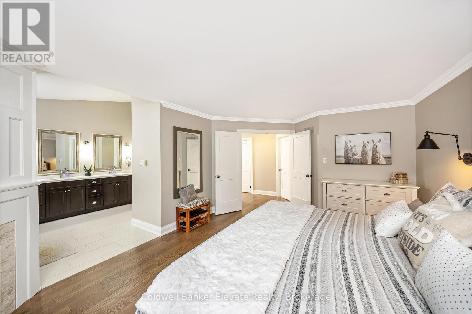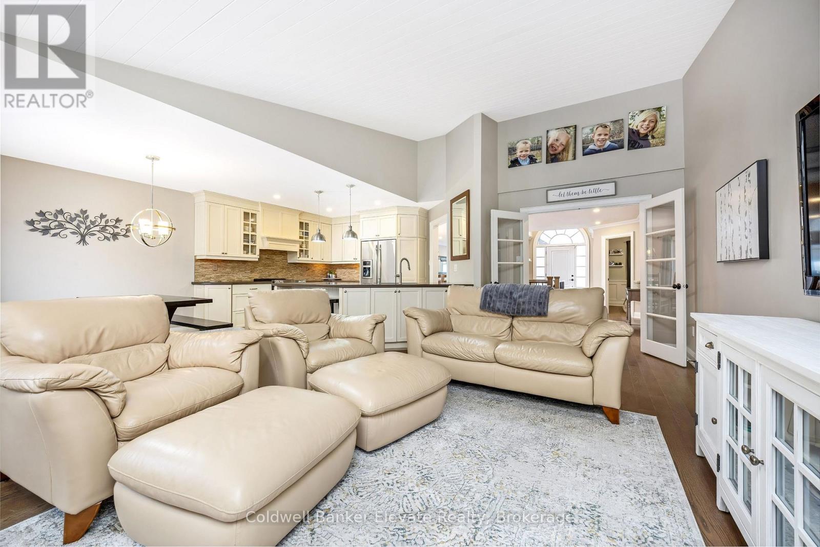 Welcome to Newman Place, a quiet cul-de-sac just minutes from downtown Georgetown, offering a stunning detached bungalow set on a private ravine lot with an inground pool. A landscaped front yard and stone walkway lead to a bright, inviting foyer highlighted by soaring ceilings, an arched transom window, and full-height sidelights. The main level features hardwood flooring throughout and a seamless open-concept layout ideal for both everyday living and entertaining. The living and dining areas are accented by crown moulding, expansive windows, and a striking feature wall with an electric fireplace. The kitchen showcases white shaker-style cabinetry, quartz countertops, tile backsplash, a centre island with breakfast bar seating, and stainless steel appliances. The adjoining breakfast area offers a walkout to a private composite deck with gas BBQ hookup and spiral staircase to pool area. Open to the kitchen, the family room impresses with vaulted shiplap ceilings, a gas fireplace, & large windows overlooking the ravine. The primary bedroom retreat features hardwood flooring, a walk-in closet with built-in shelving, a gas fireplace, and a spa-inspired five-piece ensuite complete with soaker tub, glass-enclosed shower, and double vanity. Two additional bedrooms, a four-piece family bathroom, and a convenient laundry room with garage access complete the main level. The finished lower-level walkout is designed for entertaining, featuring a movie room, office area, and a spacious recreation room with wet bar and gas fireplace. Two additional bedrooms & a four-piece bathroom provide excellent space for teens, guests, or in-law potential. Step outside to enjoy the private backyard oasis, perfect for hot summer days, complete with an interlocking stone patio, heated inground saltwater pool with waterfall, cabana, and the private ravine setting. All this close to Downtown, Farmer's Market & Park Public School with easy access to commuter routes. Don't miss out on this one! (id:64974)