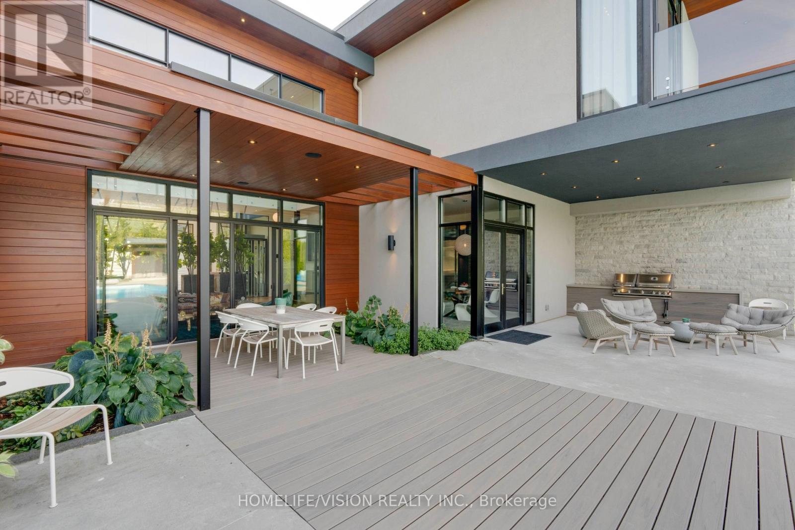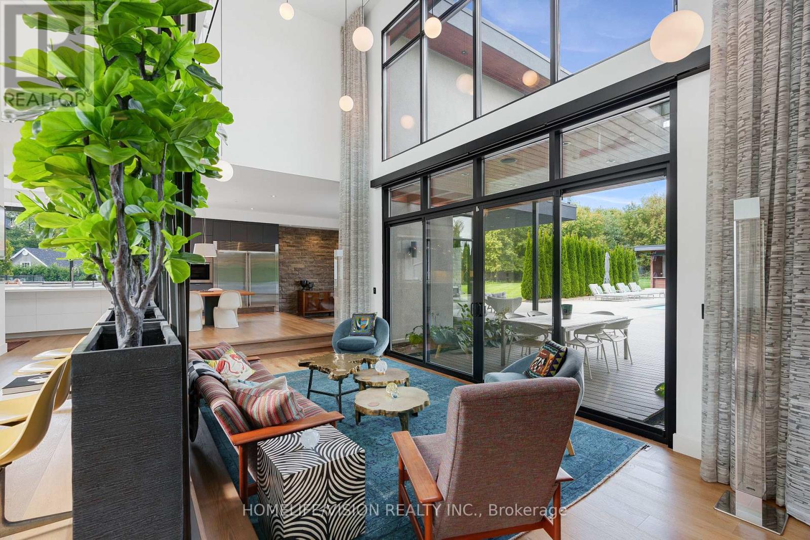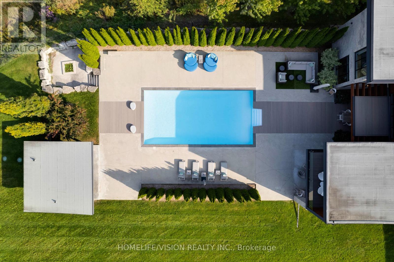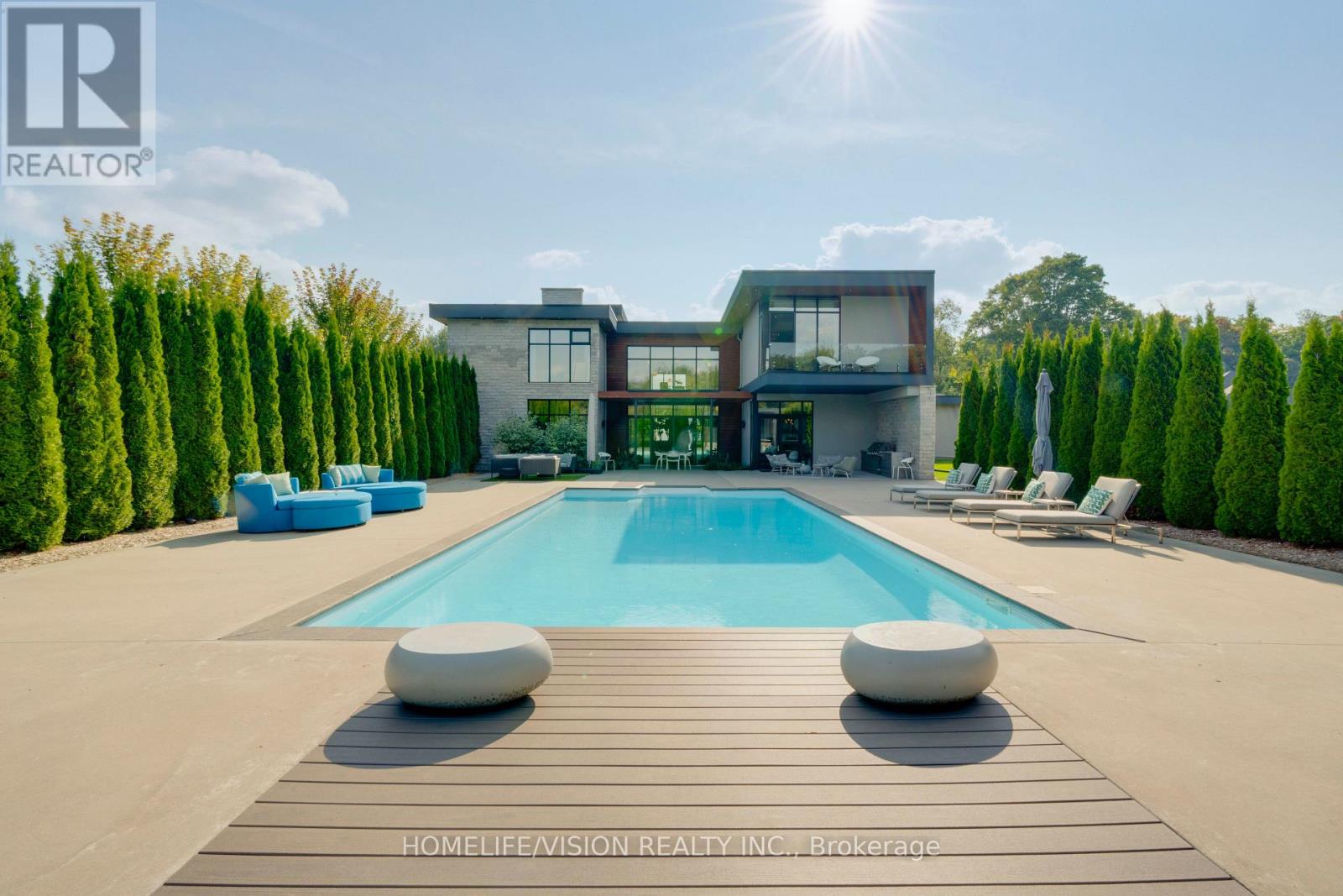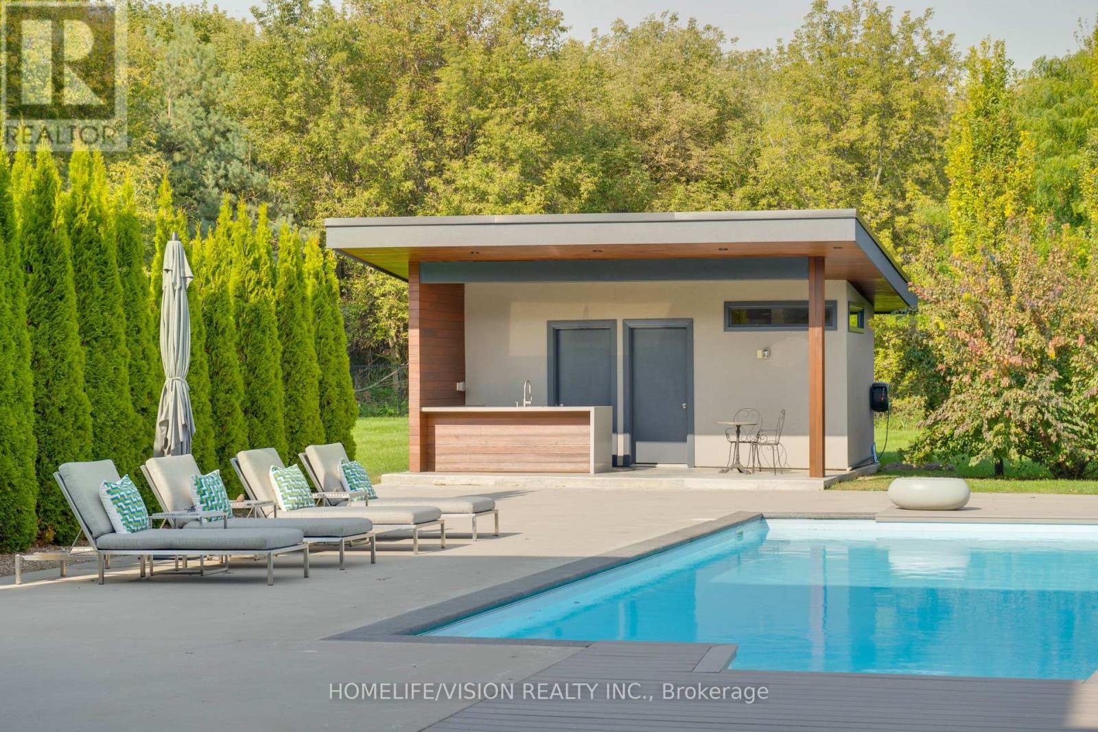 Experience luxury living at this breathtaking modern estate on 2 acres! Portions of interior masterfully designed by award winning interior designer Eric McClelland of Fleur-de-lis Interior Design Inc. The main floor boasts a contemporary kitchen with with custom cabinetry and eat in kitchen, sunken dining room with walkout to backyard, living room with floor to ceiling windows and walkout to patio, family room overlooking the garden with gas fireplace and a sun filled office with built in shelving. Master bedroom oasis with a balcony overlooking the backyard, custom built-in cabinetry and custom 6 piece ensuite with steam shower. All bedrooms have an ensuite and large windows. Meticulous maintained stone, stucco and cedar exterior with professionally landscaped gardens, outdoor saltwater pool, fire pit and cabana. Perfect for entertaining indoors and out. Spectacular basement with home theatre with full projection system, wine fridge, workout room, kitchenette and bar space. 5th bedroom in basement with custom cabinetry and ensuite as well. Elevator gives access to all floors. Dog wash station in mudroom with sink and built in cabinetry. Radiant floor heating through much of home. Automated shades in most rooms, custom lighting system with pot lights, Sonos sound system throughout! Exterior repainted and stained (2023), Outdoor decking (2023), Roof (2016), Windows (2016), A/C (2016), Furnace (2016), Sump pump (2017). (id:64974)