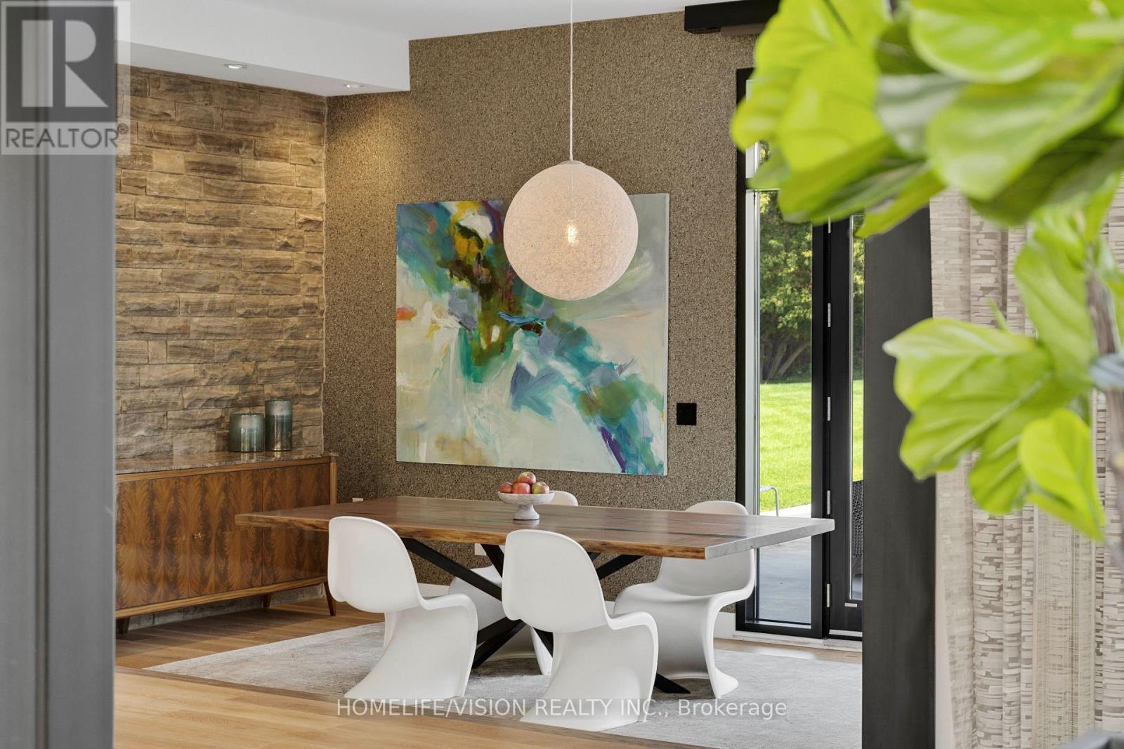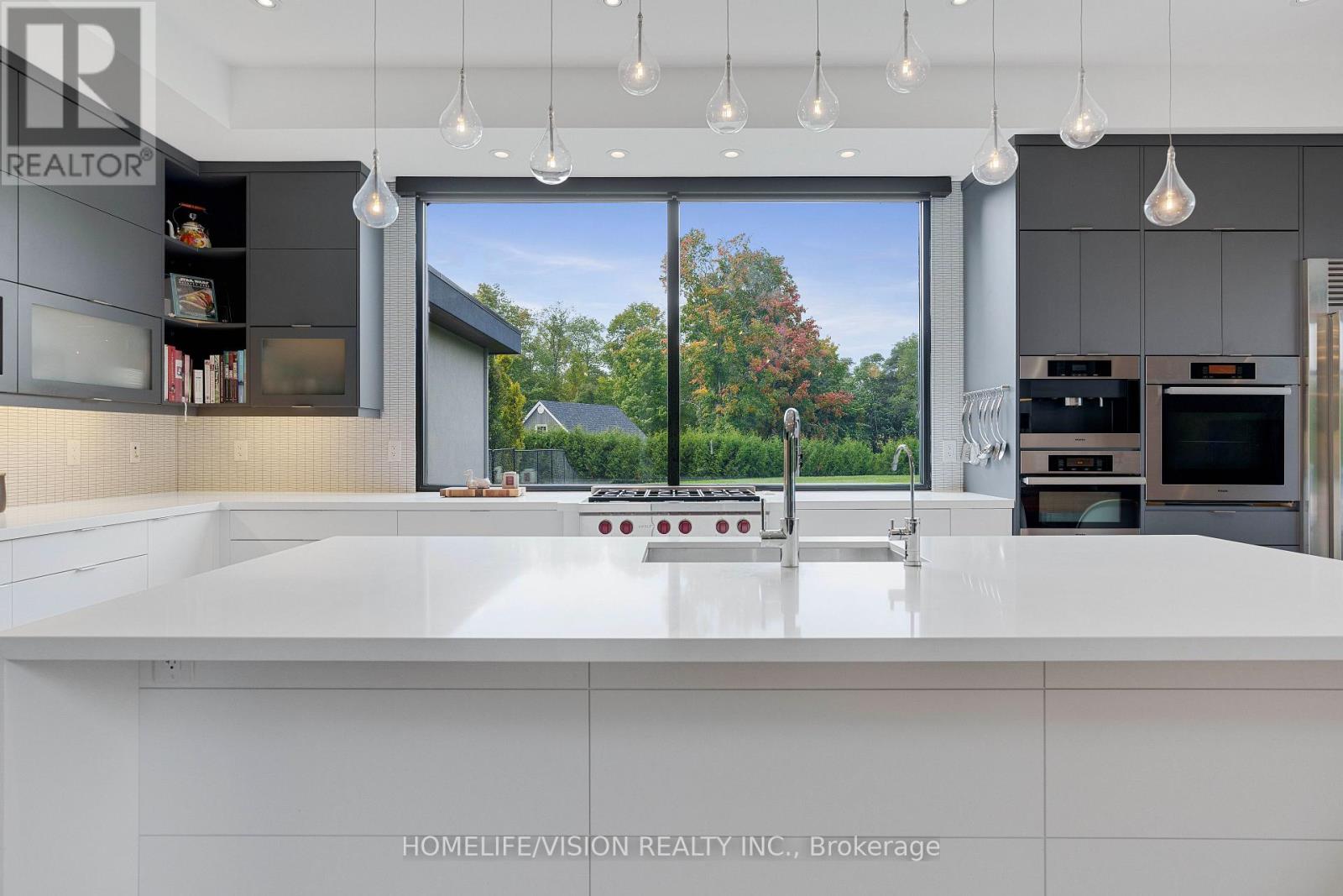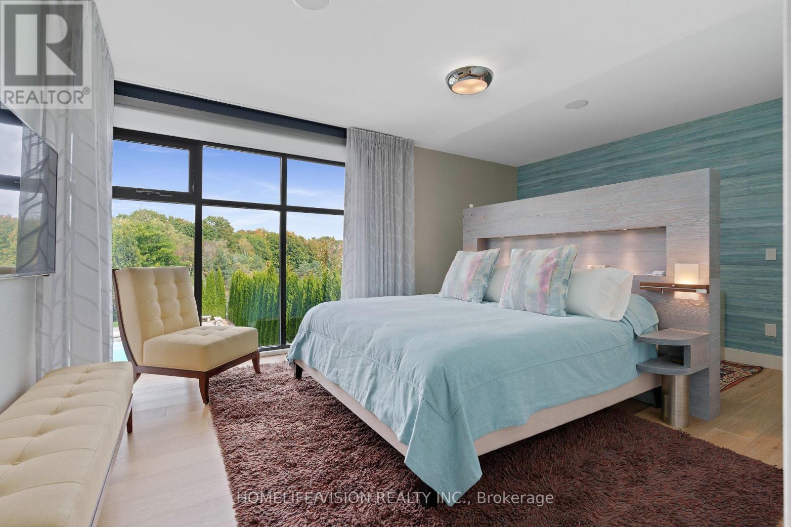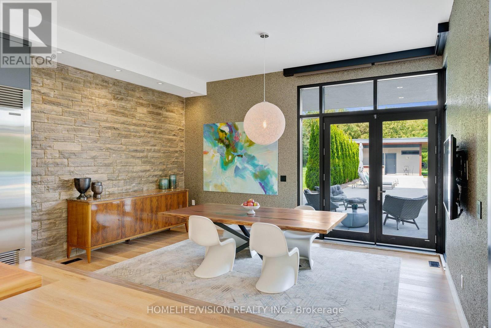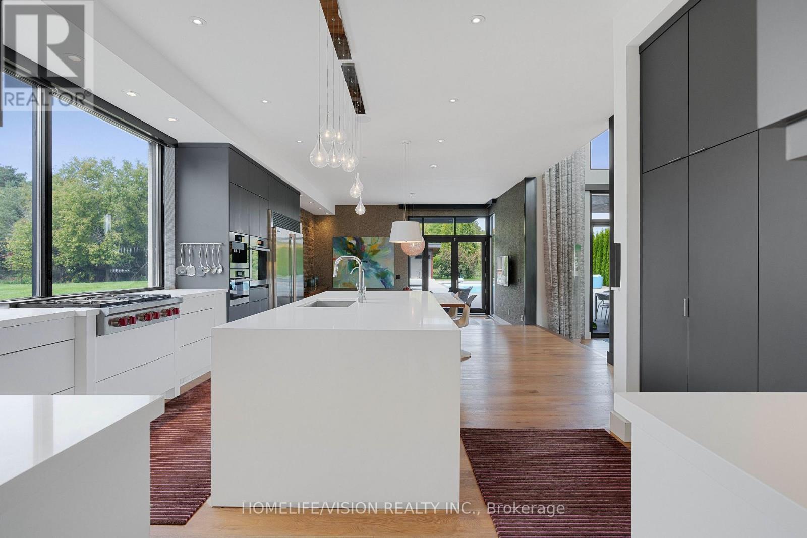 Experience luxury living at this breathtaking modern estate on 2 acres! Portions of interior masterfully designed by award winning interior designer Eric McClelland of Fleur-de-lis Interior Design Inc. The main floor boasts a contemporary kitchen with with custom cabinetry and eat in kitchen, sunken dining room with walkout to backyard, living room with floor to ceiling windows and walkout to patio, family room overlooking the garden with gas fireplace and a sun filled office with built in shelving. Master bedroom oasis with a balcony overlooking the backyard, custom built-in cabinetry and custom 6 piece ensuite with steam shower. All bedrooms have an ensuite and large windows. Meticulous maintained stone, stucco and cedar exterior with professionally landscaped gardens, outdoor saltwater pool, fire pit and cabana. Perfect for entertaining indoors and out. Spectacular basement with home theatre with full projection system, wine fridge, workout room, kitchenette and bar space. 5th bedroom in basement with custom cabinetry and ensuite as well. Elevator gives access to all floors. Dog wash station in mudroom with sink and built in cabinetry. Radiant floor heating through much of home. Automated shades in most rooms, custom lighting system with pot lights, Sonos sound system throughout! Exterior repainted and stained (2023), Outdoor decking (2023), Roof (2016), Windows (2016), A/C (2016), Furnace (2016), Sump pump (2017). (id:64974)